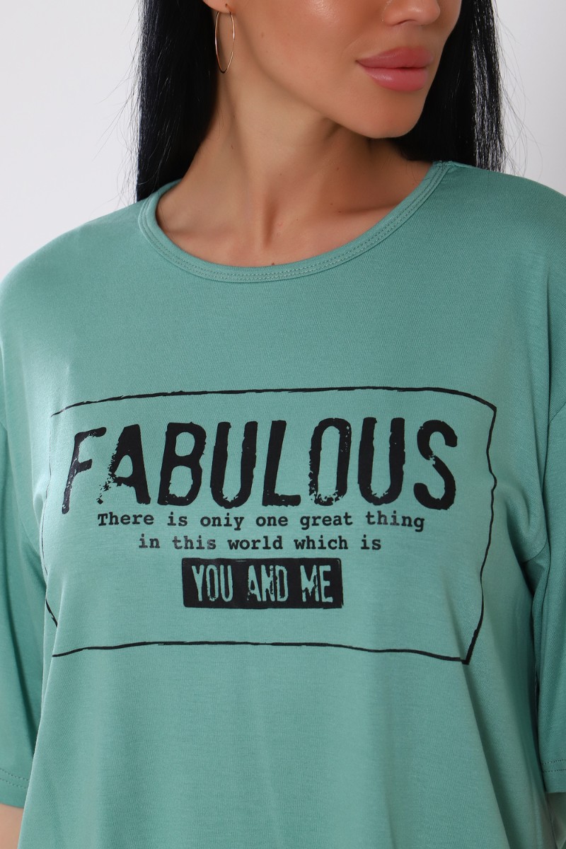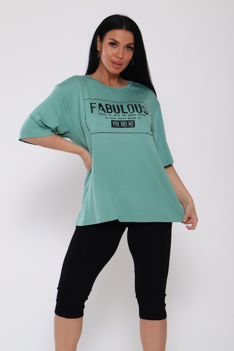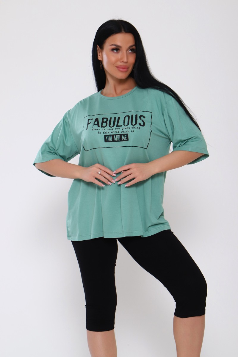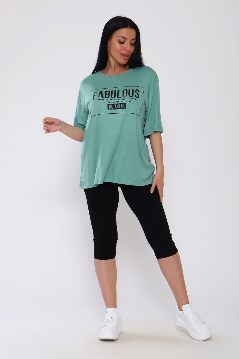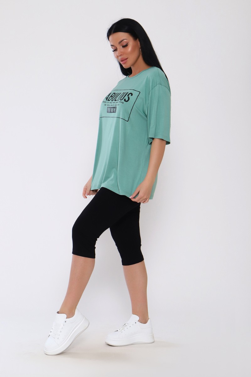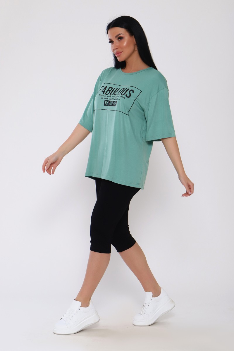 Представляем Вашему вниманию женский костюм из вискозы. Футболка оверсайз с облегающими по ноге легинсами. Футболка свободная, с принтом по переду, рукав до локтя, длина до середины бедра. Бриджи в обтяжку чуть ниже колена. На модели 50 размер .