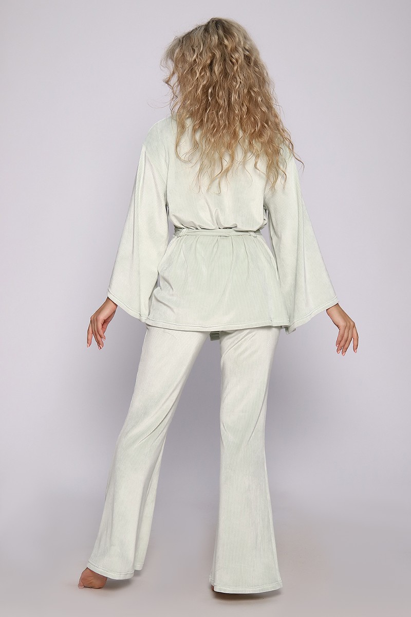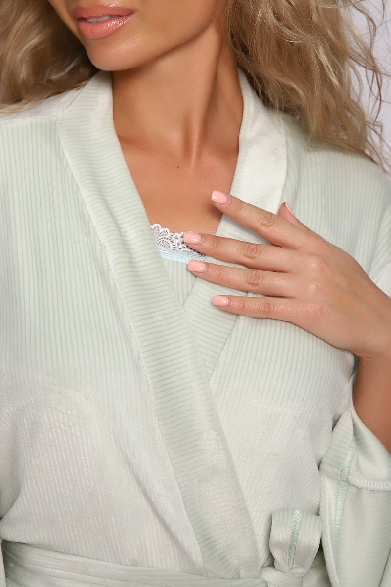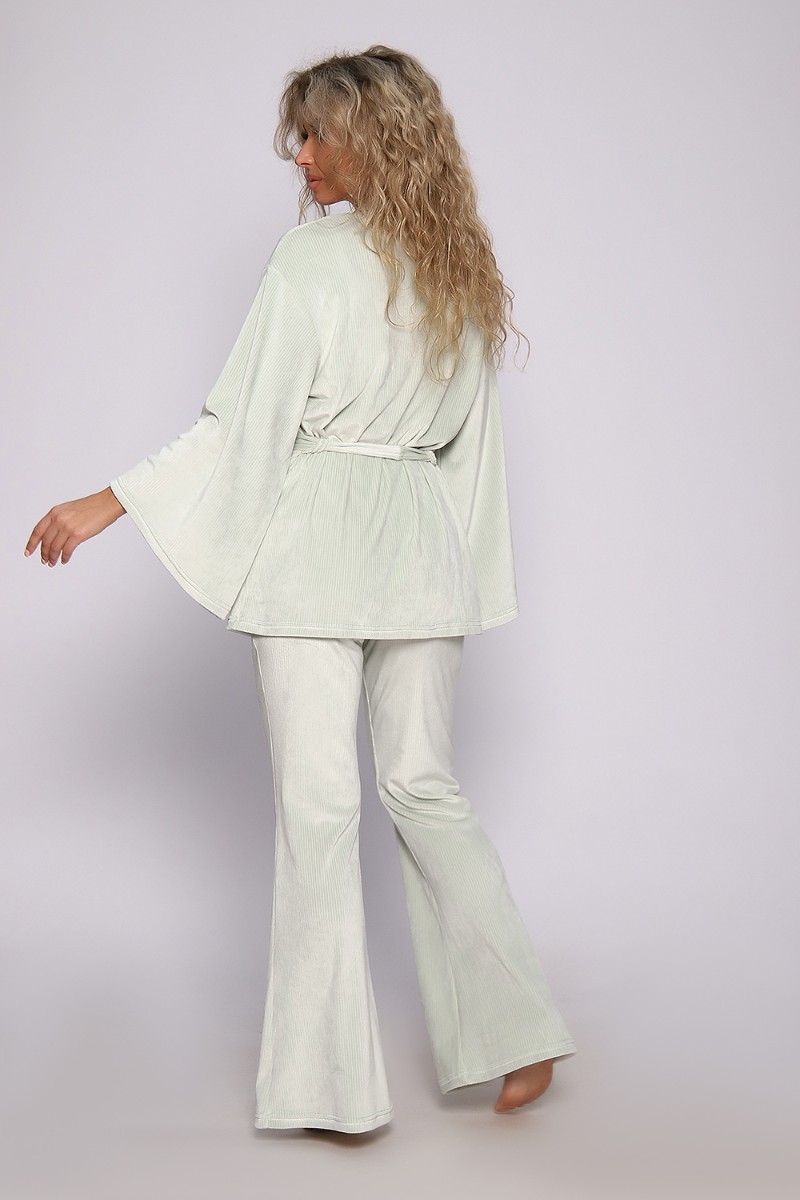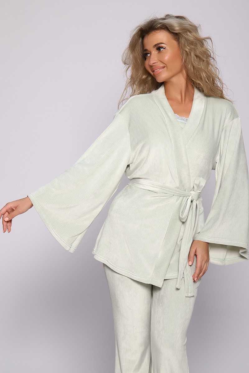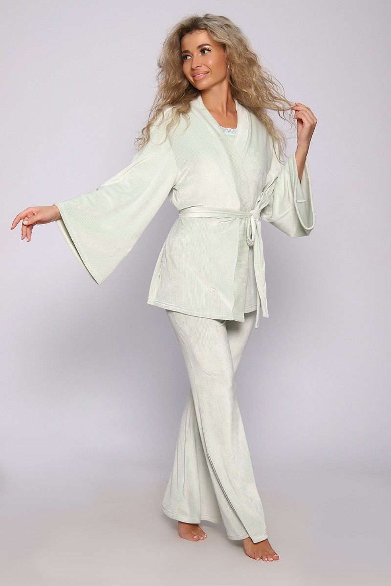 Представляем Вашему вниманию домашний женский костюм тройку - халат на запах, топ на бретелях и брюки-клеш от колена. Ткань однотонный мягкий жаккардовый велюр, который точно обеспечит тепло, удобство и комфорт, а так же подчеркнет женственность обладательницы. Халат прямого силуэта. Свободный крой, фиксируется поясом и держателями в боковых швах. Плечо халата слегка спущено, рукав широкий в стиле кимоно. По переду халата расположена планка, которая лаконично сочетается в одном изделии, что не маловажно для эстетического восприятия. Топ прямого силуэта на тонких бретелях, горловина переда и спинки, украшены кружевом в тон основного материала. Брюки клеш, размер в размер, талия на эластичной резинке, шириной 2 см, клеш начинается от колена, который ненавязчиво сочетается с рукавом верхнего изделия. В зависимости от величины размера, на спинке допускается стачной шов.