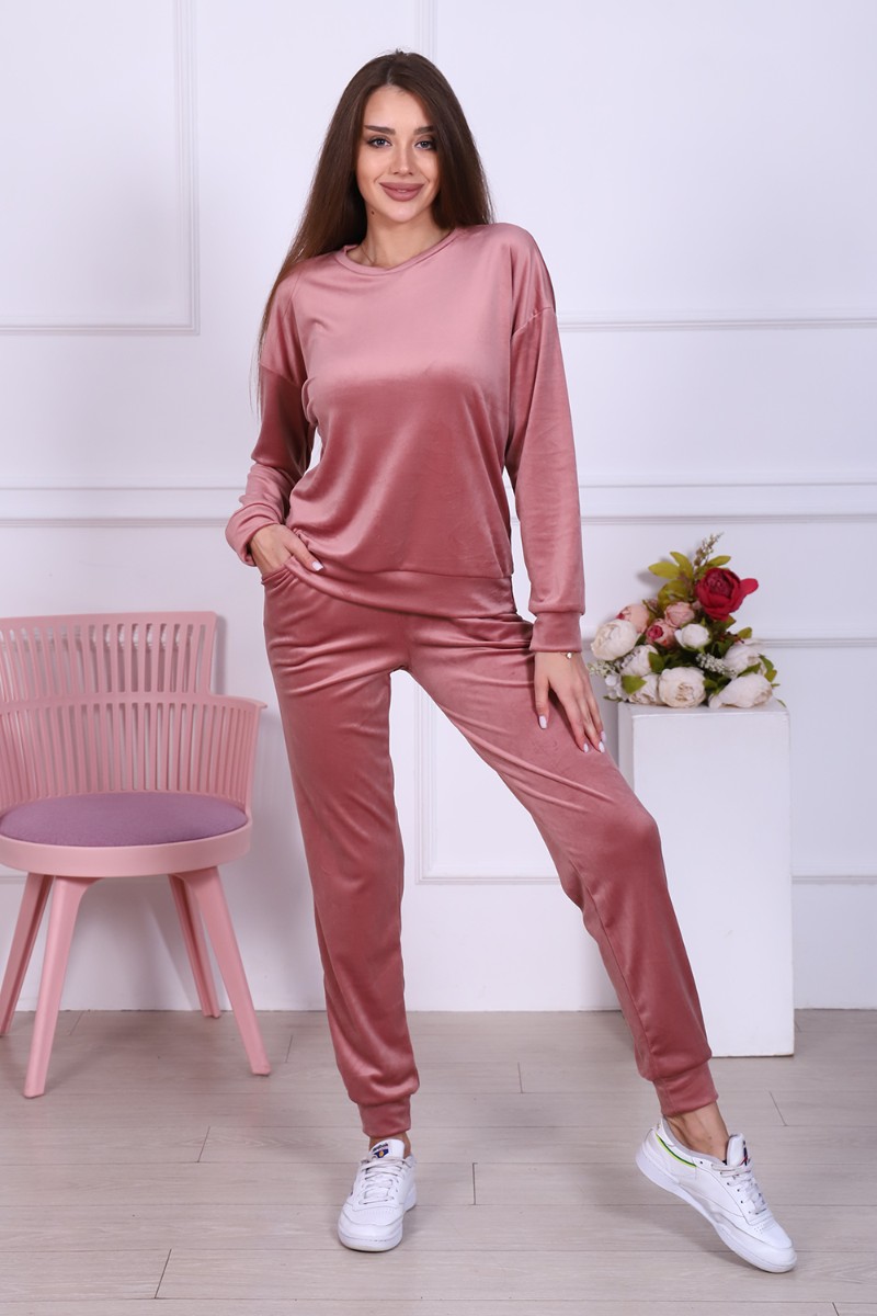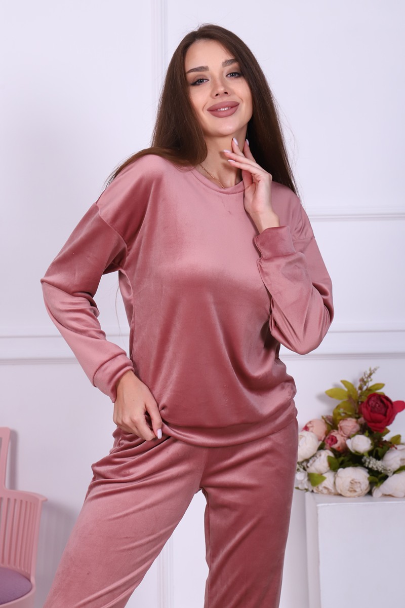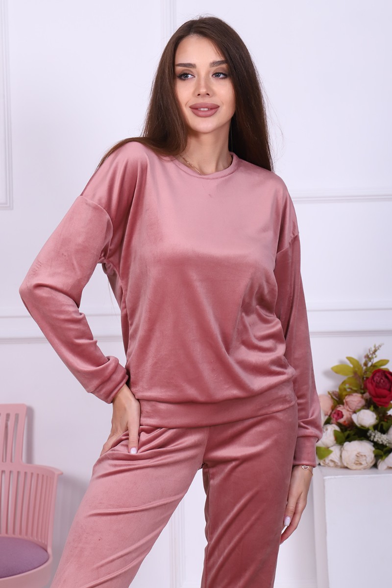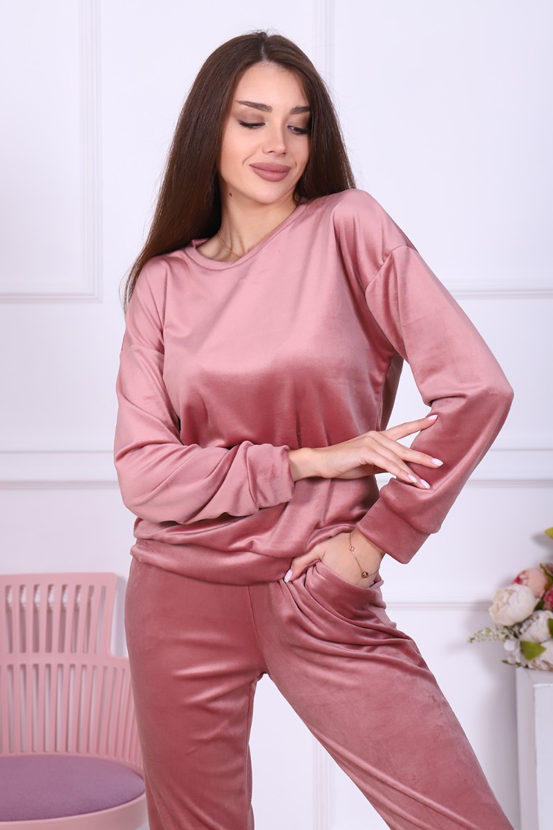 Представляем Вашему вниманию женский домашний костюм, состоящий из джемпера с длинным рукавом и брюк. Брюки с карманами в боковых швах со скошенным входом для удобства, с широким притачным поясом на резинке, отделан декоративной отстрочкой. Низ брюк на притачной манжете из основной ткани. Джемпер свободного покроя с округлой горловиной чуть зауженный внизу манжетой за счет небольшой сборки. Рукав втачной, низ рукава на притачной манжете шириной 6 см. Костюм выполнен из нежной на ощупь бархатной ткани - иконвелюра, который переливается на свету и очень приятен на ощупь. Изделие не мнется, не требует глажки, что очень удобно в использовании. Можно носить дома, как домашний комплект, как пижаму для сна, а также на выход, как костюм для прогулок в холодное время года, как спортивный костюм, на дачу, для школы и т. д. Большой выбор нежных и насыщенных расцветок на любой вкус! Отличный подарок самым любимым!