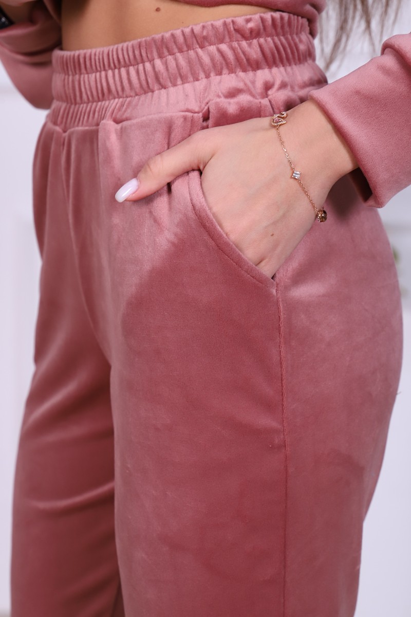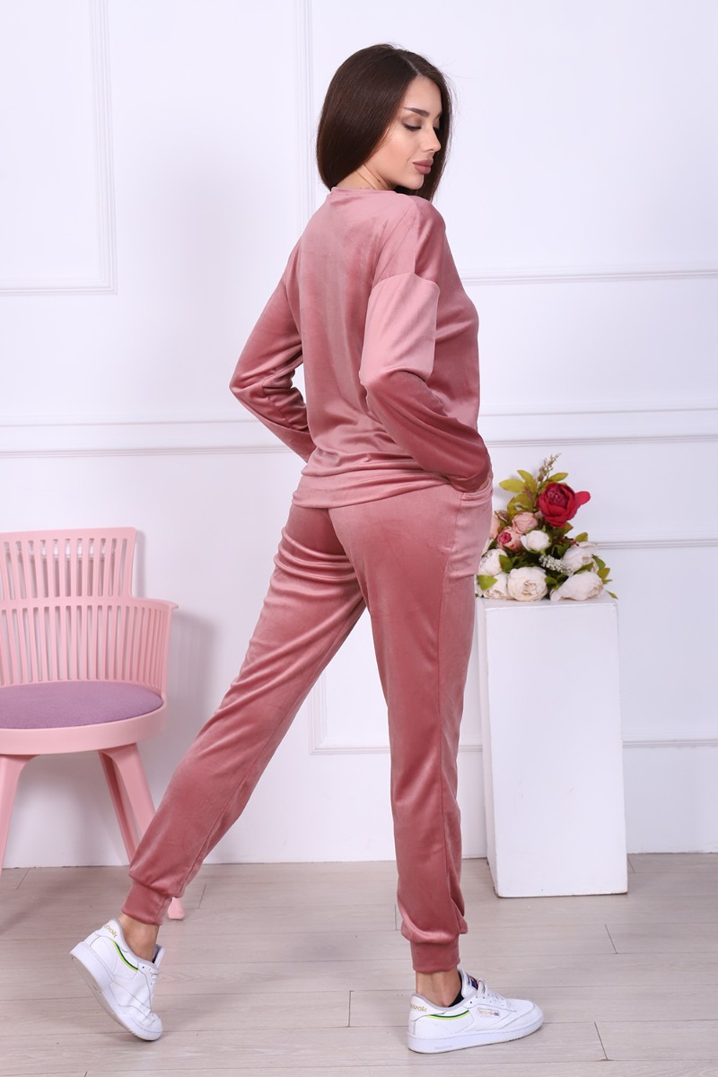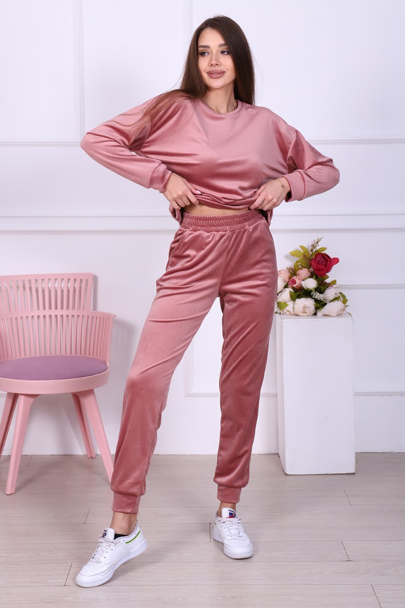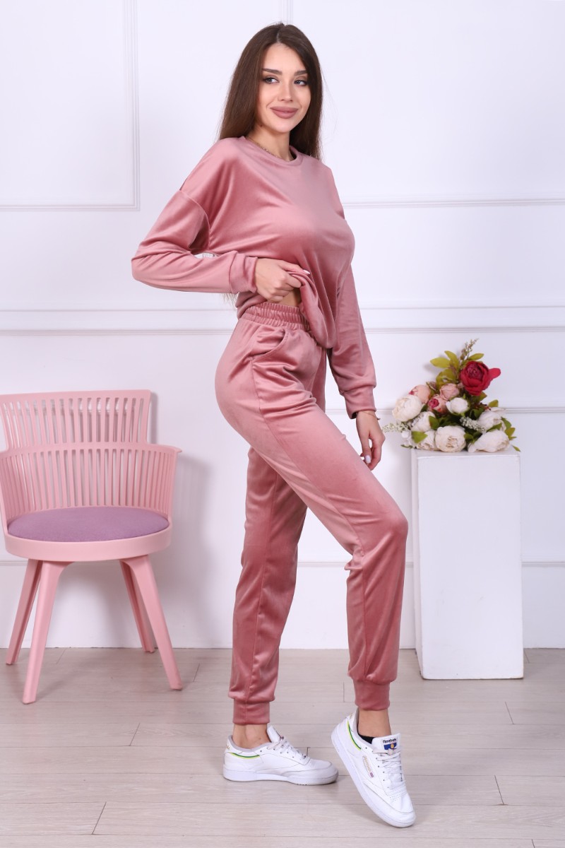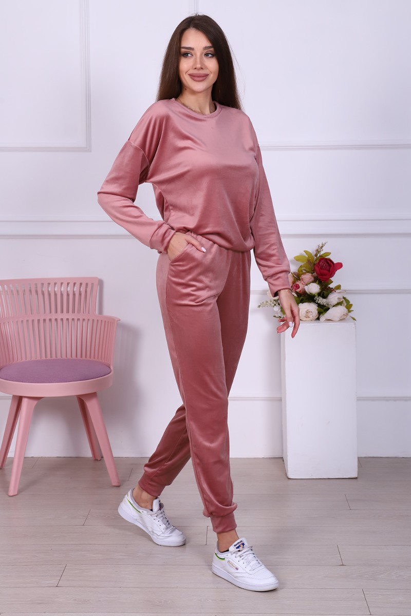 Представляем Вашему вниманию женский домашний костюм, состоящий из джемпера с длинным рукавом и брюк. Брюки с карманами в боковых швах со скошенным входом для удобства, с широким притачным поясом на резинке, отделан декоративной отстрочкой. Низ брюк на притачной манжете из основной ткани. Джемпер свободного покроя с округлой горловиной чуть зауженный внизу манжетой за счет небольшой сборки. Рукав втачной, низ рукава на притачной манжете шириной 6 см. Костюм выполнен из нежной на ощупь бархатной ткани - иконвелюра, который переливается на свету и очень приятен на ощупь. Изделие не мнется, не требует глажки, что очень удобно в использовании. Можно носить дома, как домашний комплект, как пижаму для сна, а также на выход, как костюм для прогулок в холодное время года, как спортивный костюм, на дачу, для школы и т. д. Большой выбор нежных и насыщенных расцветок на любой вкус! Отличный подарок самым любимым!