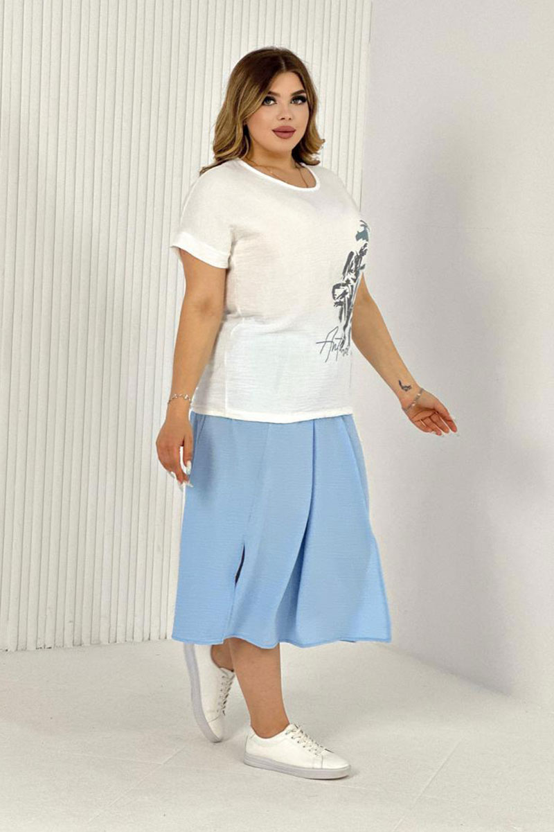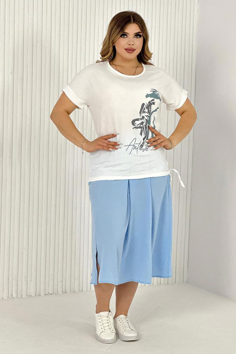Представляем Вашему вниманию женскую двойку прямого силуэта. Верх комплекта в белом цвете с цветным принтом, короткий цельнокроеный рукав, низ футболки имеет свойство затягиваться, поэтому ее можно носить спущенную на юбку, а можно затянуть и оставить над ней, что подчеркнет Вашу талию. Низ - свободная юбка двух цветов, с двумя разрезами снизу. Костюм повседневный и удобный, из легкой ткани сингапур, что хорошо для жаркого лета.