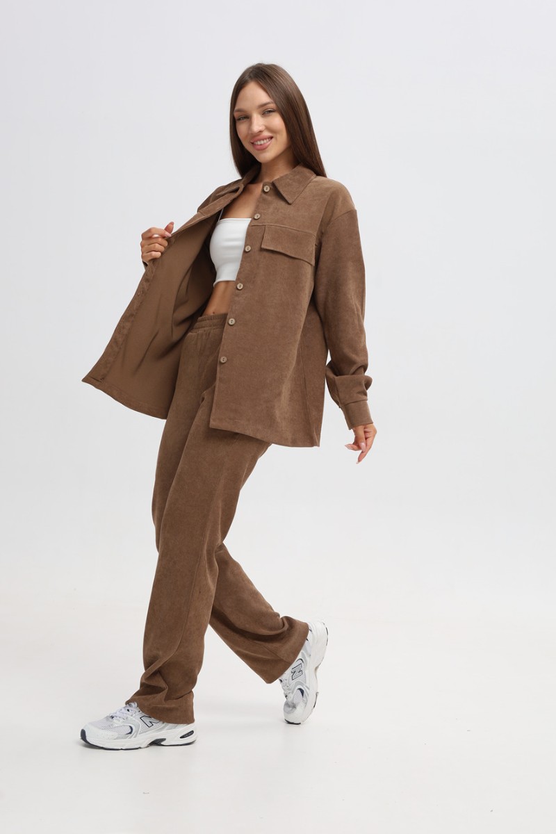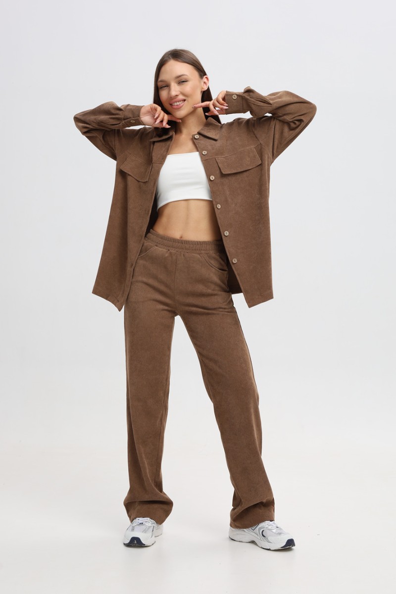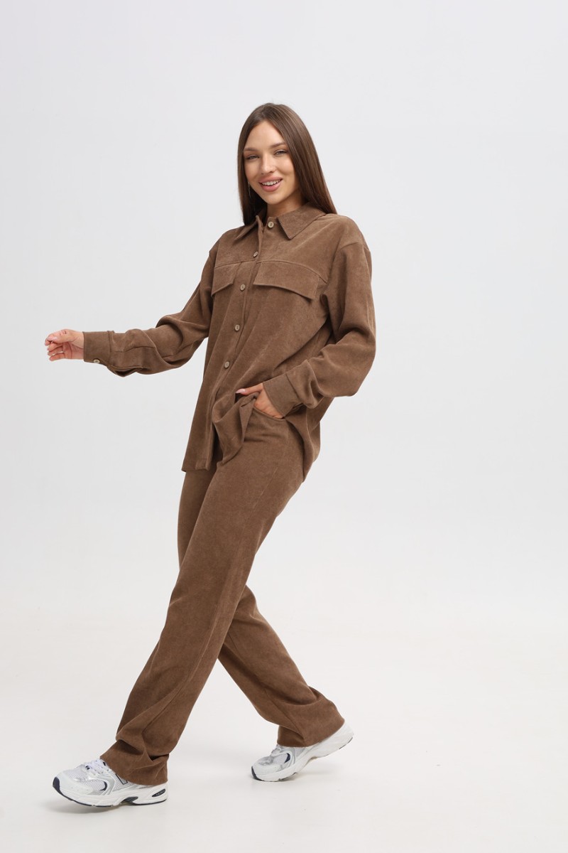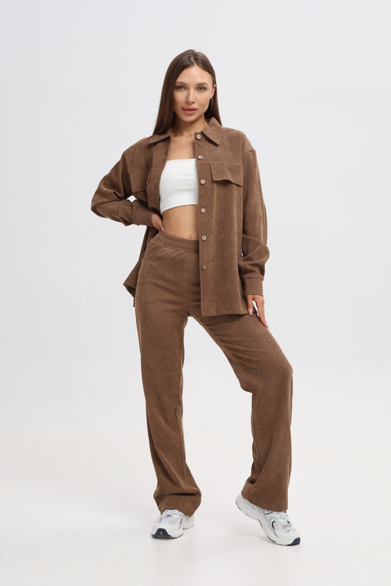 Представляем Вашему вниманию спортивный женский костюм, выполненный из мягкого вельветового материала, который придает ему модный и элегантный вид. Костюм для женщин состоит из рубашки оверсайз и брюк прямого кроя, создающих гармоничный и современный образ. Однотонный оттенок делает его универсальным для разных случаев — от повседневных прогулок до офисного или делового стиля. Рубашка свободного фасона с длинными рукавами украшена классическим воротником и застегивается на пуговицы. Вельвет обладает приятной текстурой, которая сохраняет комфорт даже при длительном ношении. Брюки имеют удобные карманы, прямой силуэт, что делает их подходящими для девушек и женщин разных возрастов. Эластичный пояс обеспечивает удобную посадку, а продуманная длина визуально вытягивает силуэт. Удобная и трендовая одежда в современном стиле, которая дополнит базовые и спортивные образы или молодежный лук в стиле casual (кэжуал). Нарядный костюм отлично подойдет как для осенних прохладных дней, так и для создания стильных летних образов. Женский костюм-двойка отличается универсальностью благодаря сочетанию комфорта и модного дизайна. Он может использоваться как спортивный наряд для активного отдыха или домашний вариант для уюта в холодное время года. Актуальный oversize крой подчеркивает современные тенденции в мире моды.