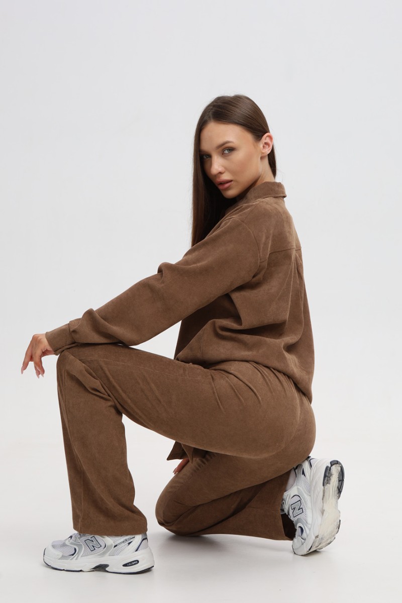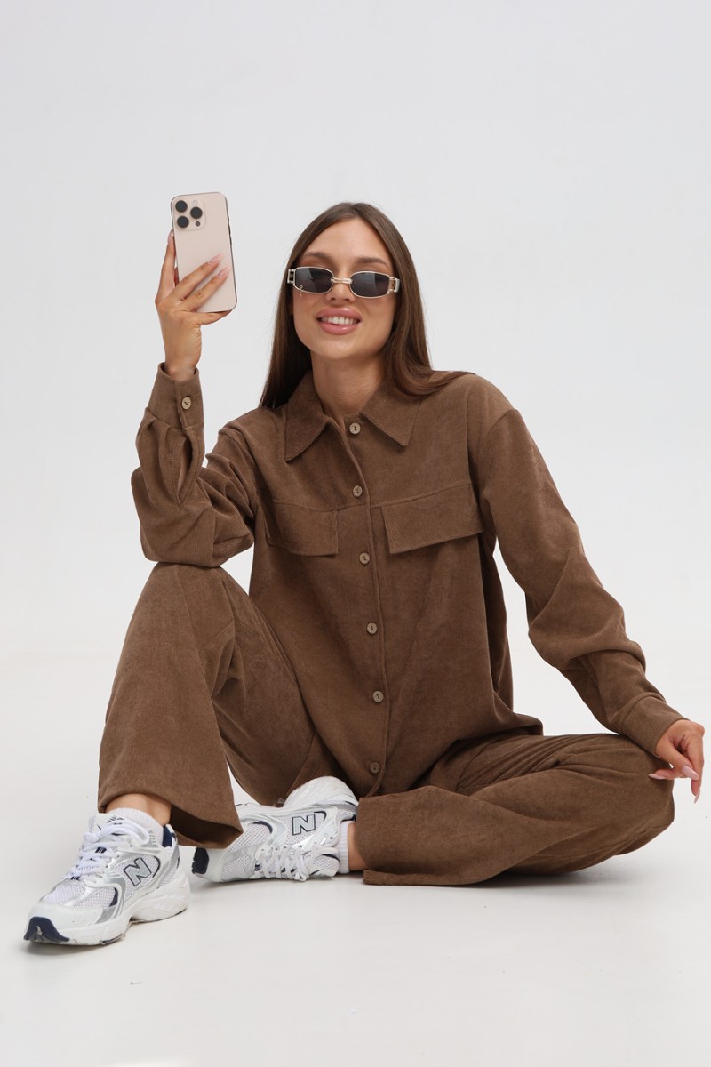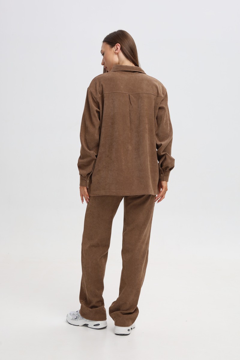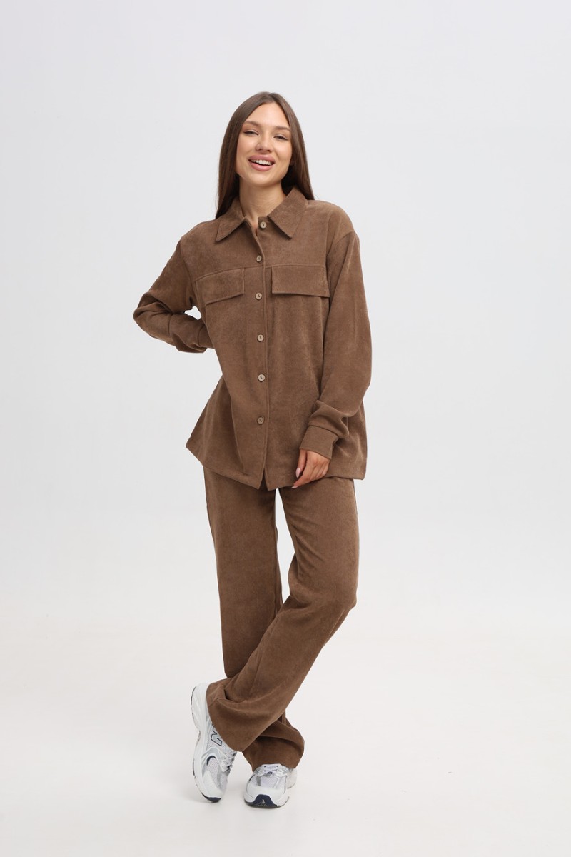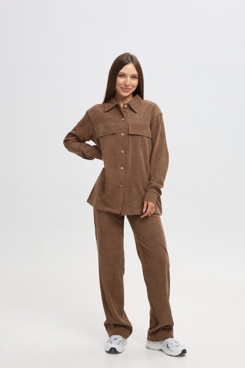 Представляем Вашему вниманию спортивный женский костюм, выполненный из мягкого вельветового материала, который придает ему модный и элегантный вид. Костюм для женщин состоит из рубашки оверсайз и брюк прямого кроя, создающих гармоничный и современный образ. Однотонный оттенок делает его универсальным для разных случаев — от повседневных прогулок до офисного или делового стиля. Рубашка свободного фасона с длинными рукавами украшена классическим воротником и застегивается на пуговицы. Вельвет обладает приятной текстурой, которая сохраняет комфорт даже при длительном ношении. Брюки имеют удобные карманы, прямой силуэт, что делает их подходящими для девушек и женщин разных возрастов. Эластичный пояс обеспечивает удобную посадку, а продуманная длина визуально вытягивает силуэт. Удобная и трендовая одежда в современном стиле, которая дополнит базовые и спортивные образы или молодежный лук в стиле casual (кэжуал). Нарядный костюм отлично подойдет как для осенних прохладных дней, так и для создания стильных летних образов. Женский костюм-двойка отличается универсальностью благодаря сочетанию комфорта и модного дизайна. Он может использоваться как спортивный наряд для активного отдыха или домашний вариант для уюта в холодное время года. Актуальный oversize крой подчеркивает современные тенденции в мире моды.