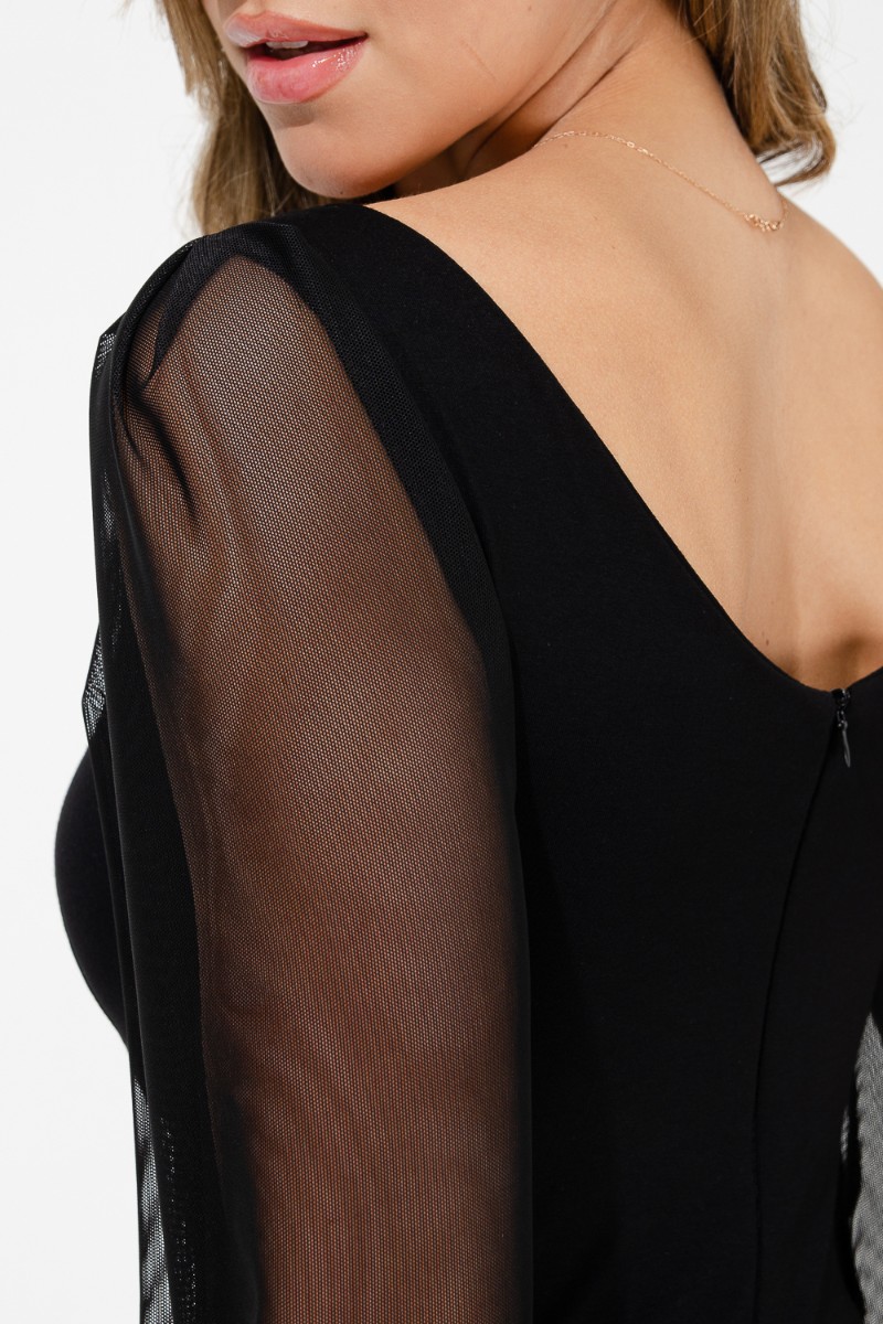 Представляем Вашему вниманию платье женское вечерние, изготовленное из качественного материала с хорошей растяжимостью, не сковывает движения. Платье комбинированное - лиф и юбка плотные и непрозрачные, а рукава полупрозрачные из нежной летящей сеточки. Короткое платье длиной выше колена облегает фигуру, показывая ноги, создавая элегантный и женственный силуэт. Оно стройнит и моделирует талию почти как корсет. Лиф с пуш-ап эффектом прекрасно поддерживает грудь, поэтому Вы можете носить его даже без белья. Лёгкая драпировка по центру юбки украшает изделие. Эстетичная классическая модель, которая подойдет на любое торжество: в ресторан, корпоратив, на день рождения, выпускной, новогодний вечер.