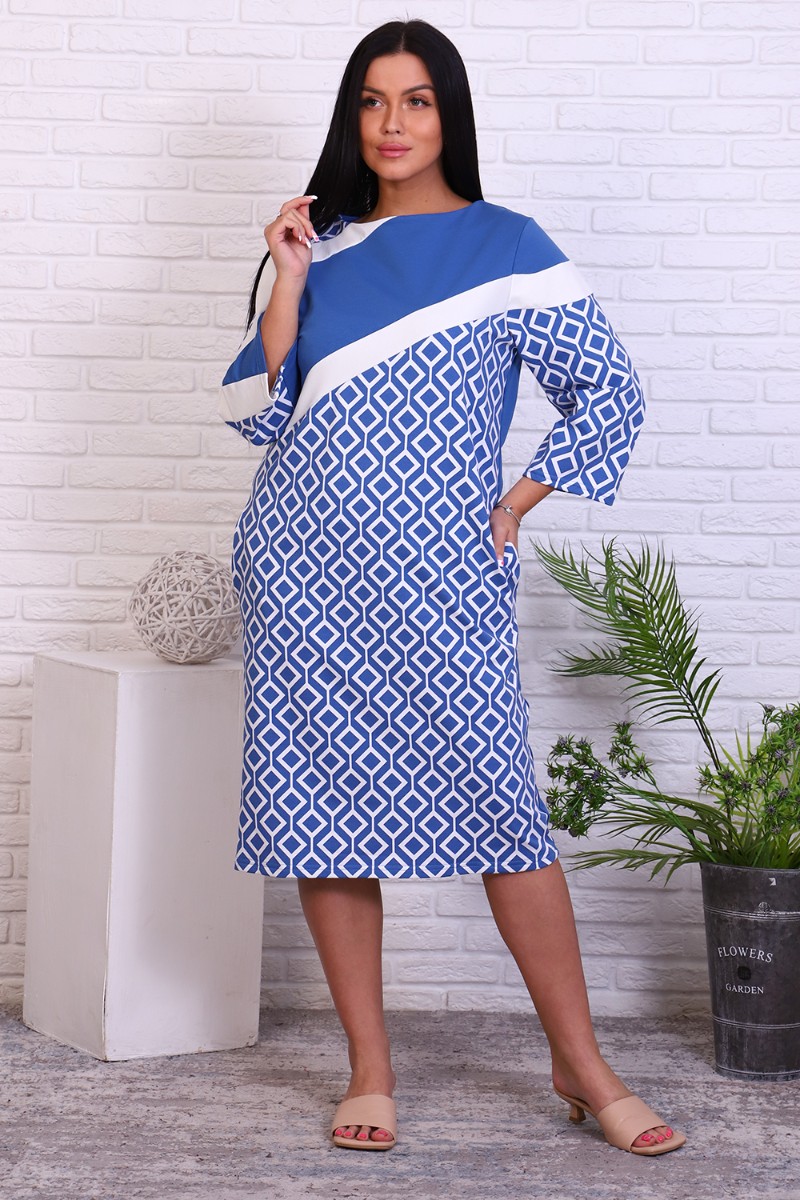 Представляем Вашему вниманию элегантное женское платье оригинального кроя из комбинированного футера. Платье прямого силуэта с карманами в боковых швах. На полочке и рукавах декоративные вставки однотонного цвета. Рукав 3/4. Платье подойдет как для офиса, так и для выхода в ресторан.