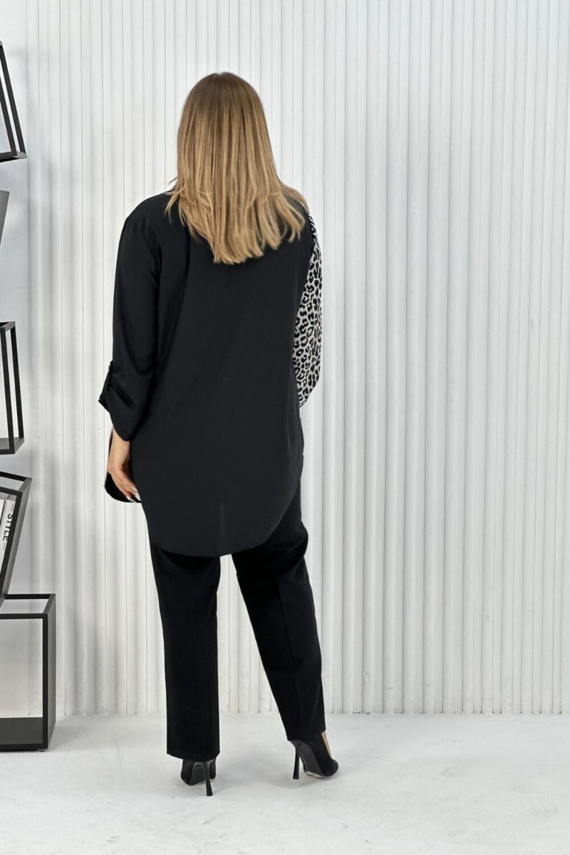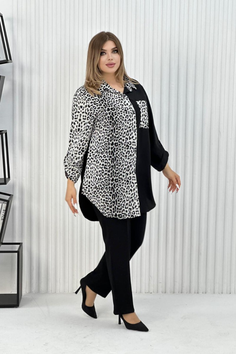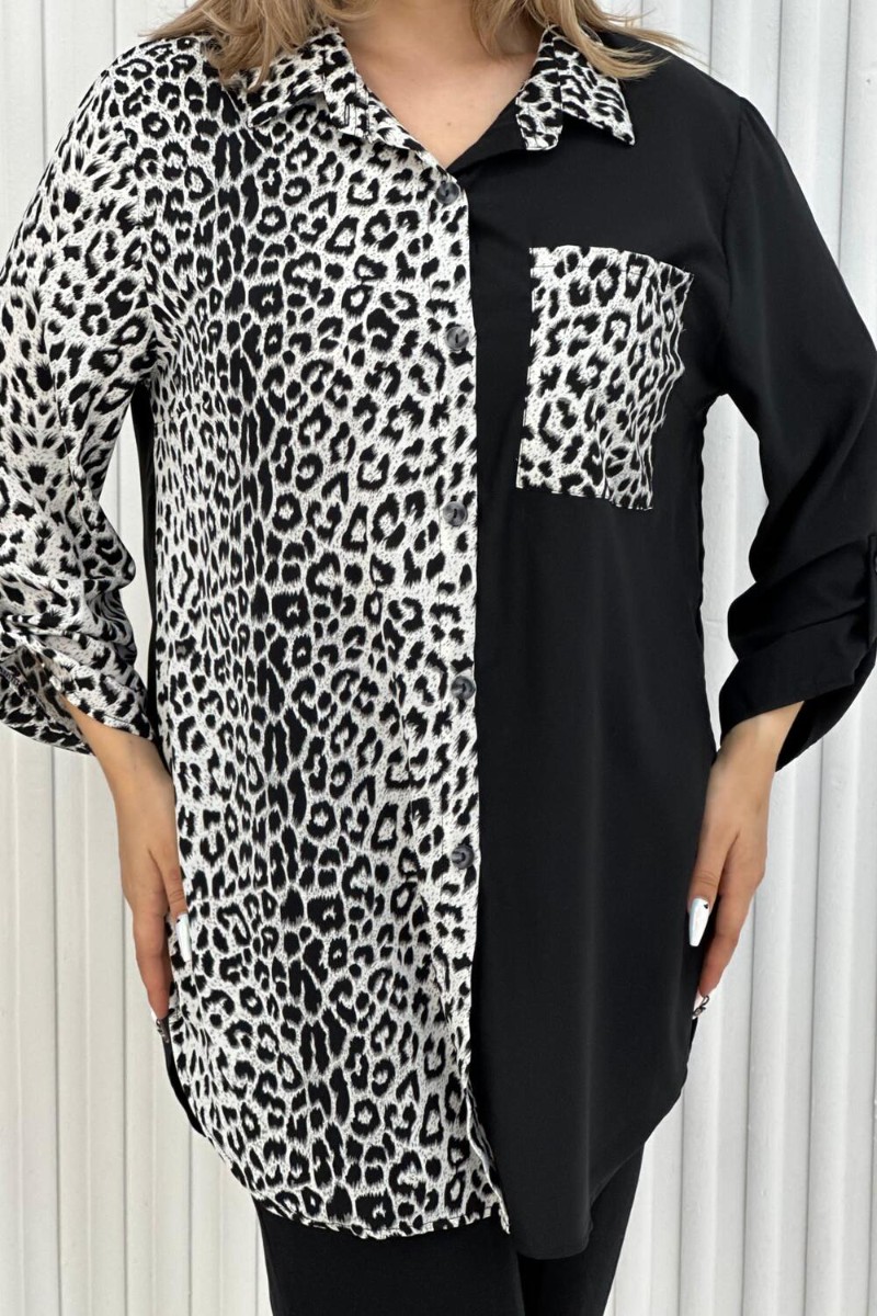 Представляем Вашему вниманию элегантную женскую тунику с трендовым узором "леопард". Блузка выполнена из легкой, но плотной ткани, воротник рубашечного типа, на передней полочке карман, на пуговицах, рукава с манжетом, также на пуговицах. Данная модель идеально подойдет для любых мероприятий, выхода на работу и просто на прогулку.