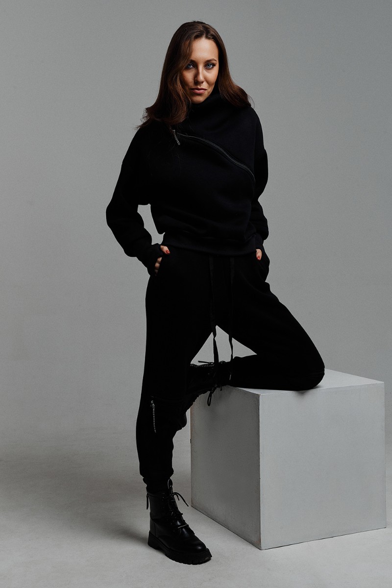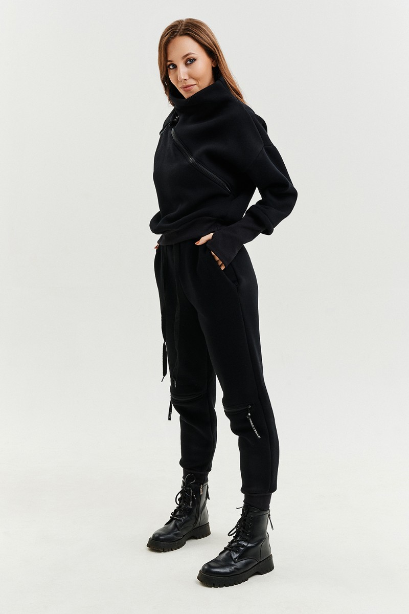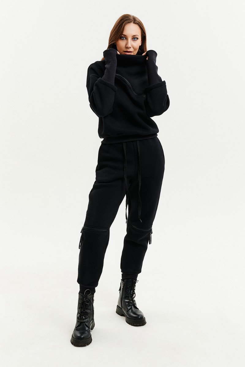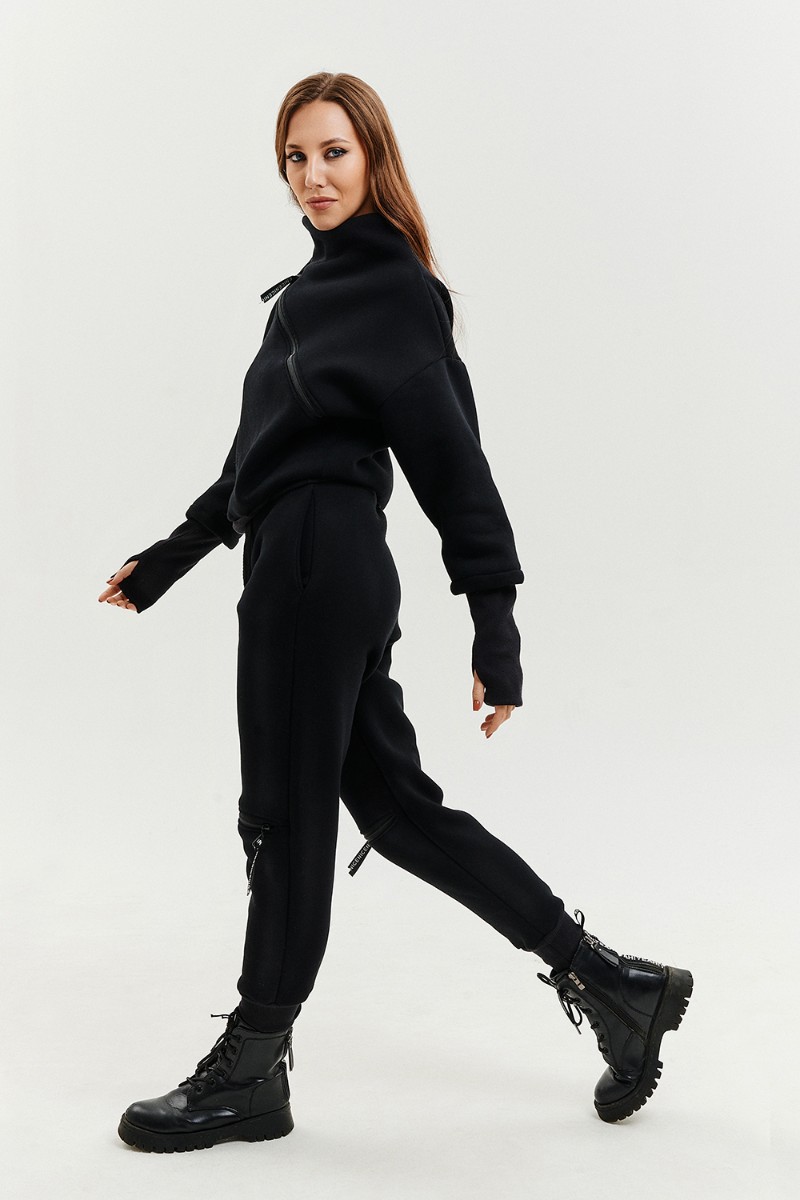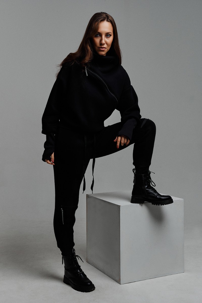 Представляем Вашему вниманию удобный и стильный женский спортивный костюм. Состоит из свитшота и брюк-" джоггеров". Толстовка и брюки оформлены функциональными, декоративными молниями. Толстовка с удобным воротником-стойкой, низ рукавов обработан высокой манжетой-перчаткой из кашкорсе. Джоггеры с высокой посадкой и широкой эластичной резинкой на поясе со шнурком. Низки брюк обработаны манжетами, что очень удобно при носке и отлично смотрятся с грубыми ботинками в стиле "челси". Спортивный костюм подходит как для зимних видов спорта, лыж, коньков, так и в холодную погоду осенью, весной.
