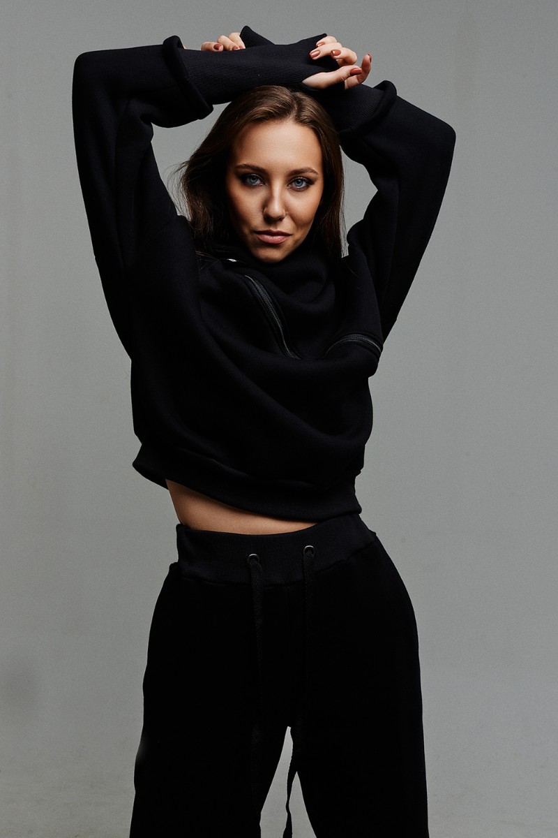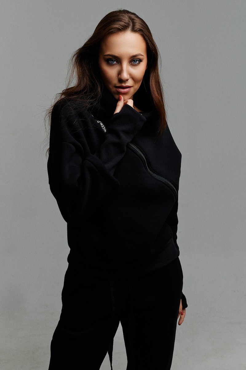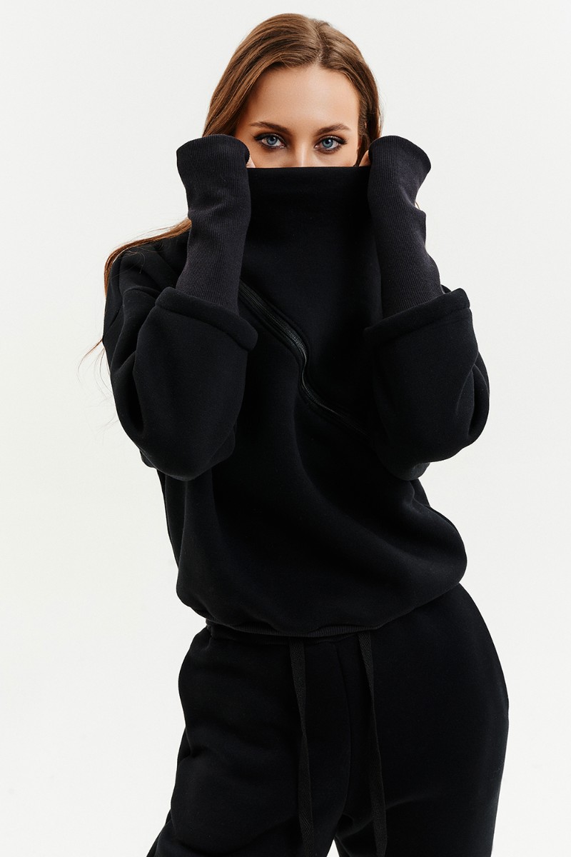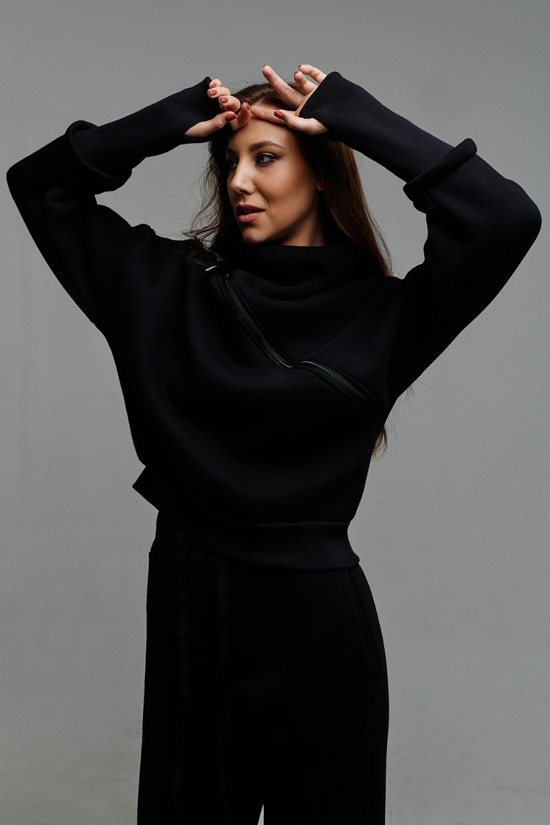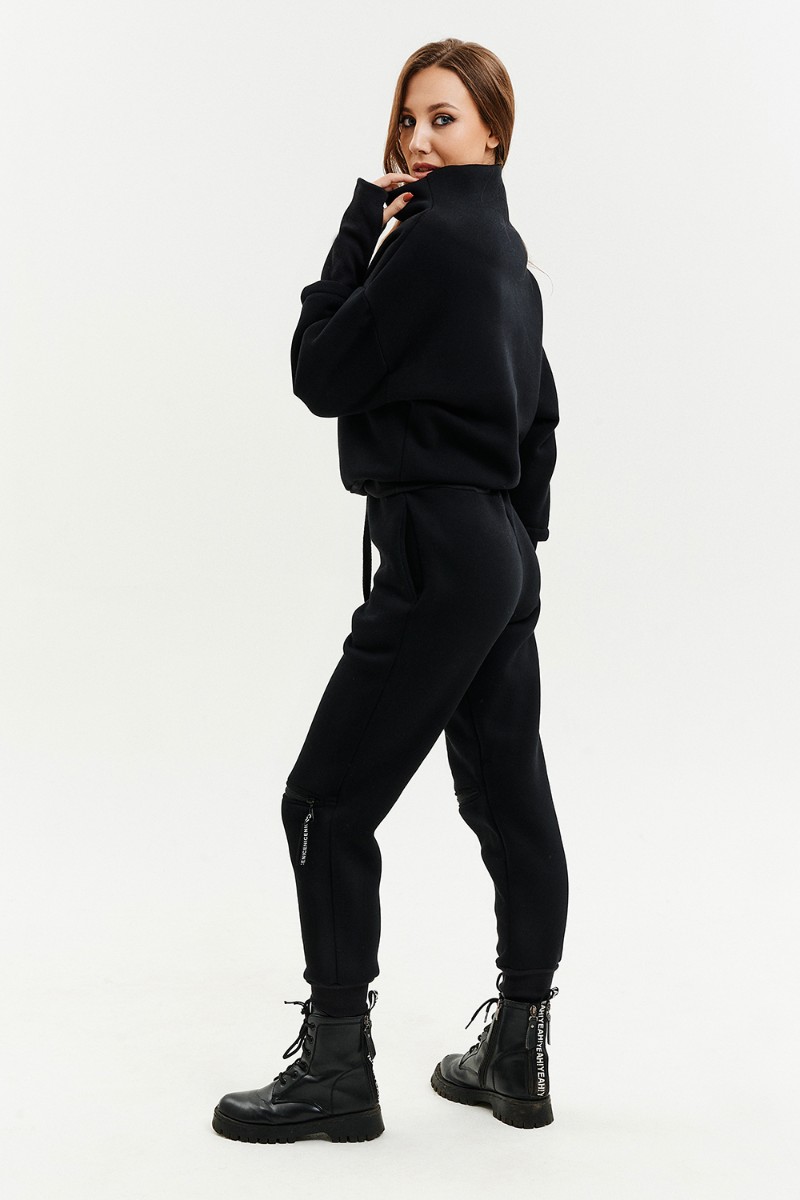 Представляем Вашему вниманию удобный и стильный женский спортивный костюм. Состоит из свитшота и брюк-" джоггеров". Толстовка и брюки оформлены функциональными, декоративными молниями. Толстовка с удобным воротником-стойкой, низ рукавов обработан высокой манжетой-перчаткой из кашкорсе. Джоггеры с высокой посадкой и широкой эластичной резинкой на поясе со шнурком. Низки брюк обработаны манжетами, что очень удобно при носке и отлично смотрятся с грубыми ботинками в стиле "челси". Спортивный костюм подходит как для зимних видов спорта, лыж, коньков, так и в холодную погоду осенью, весной.