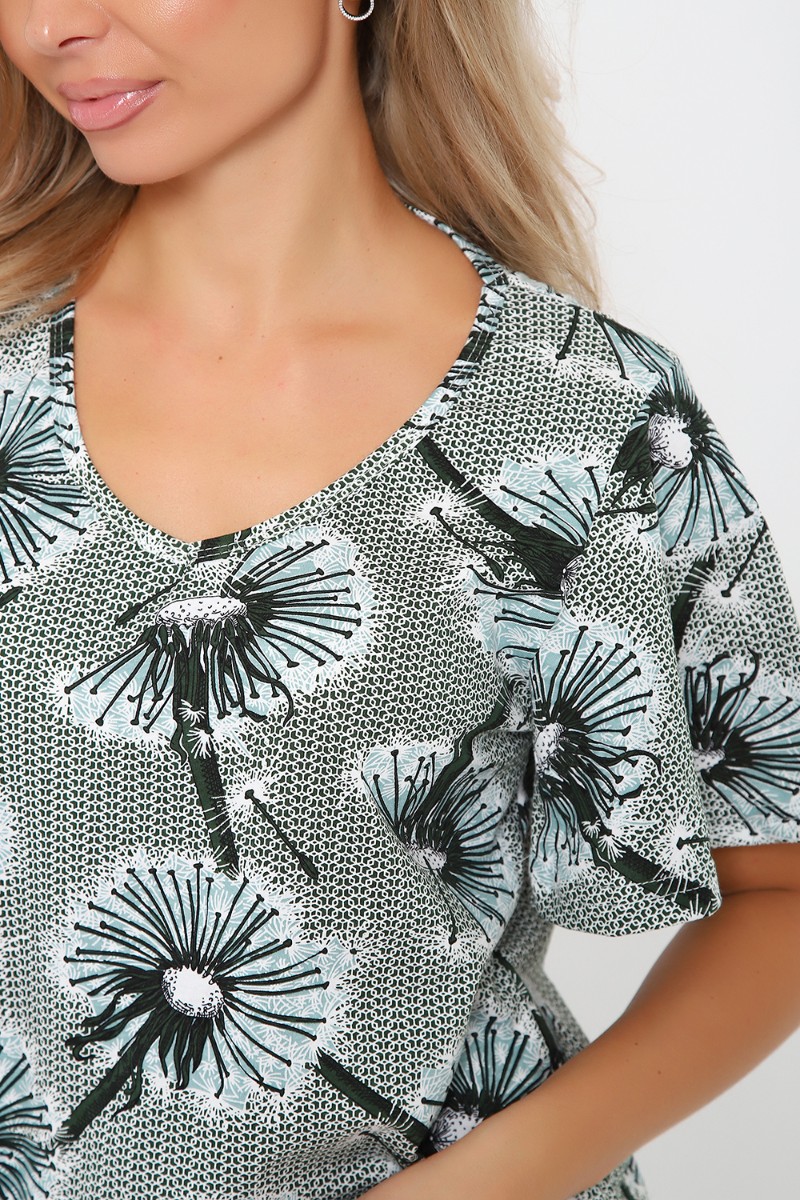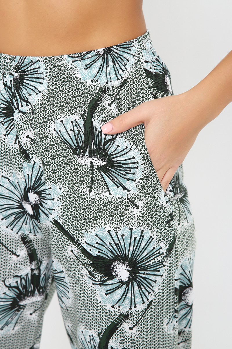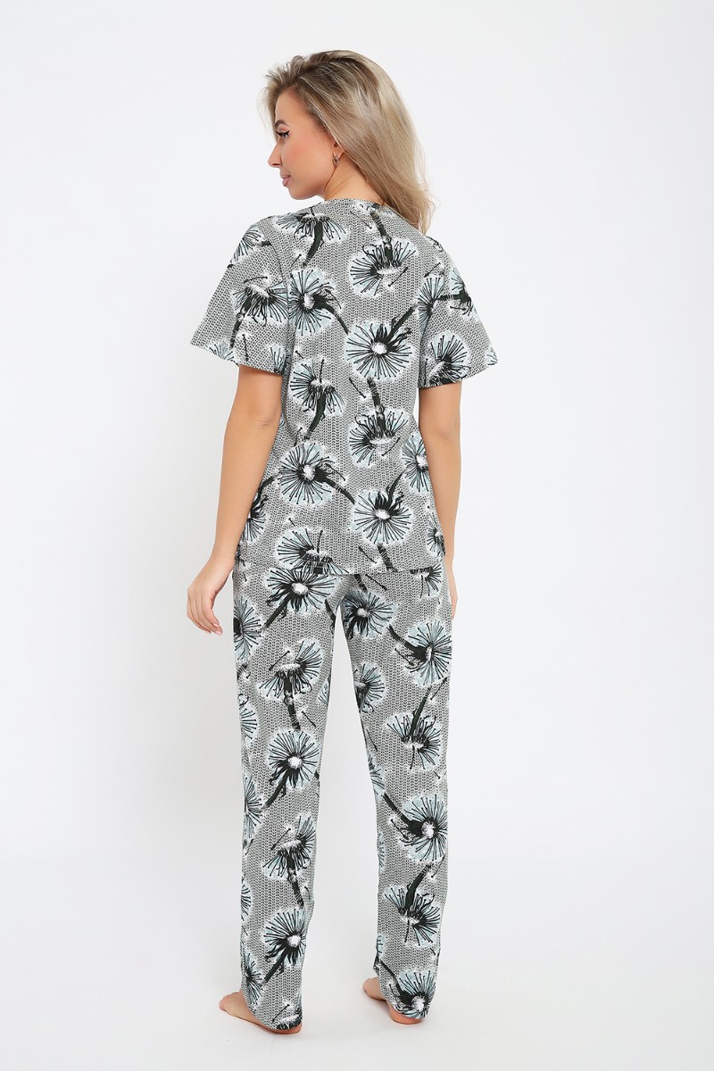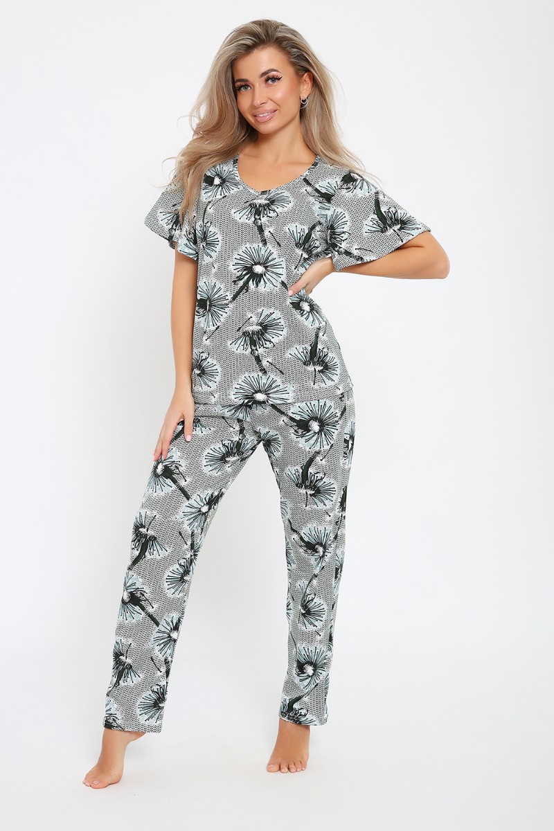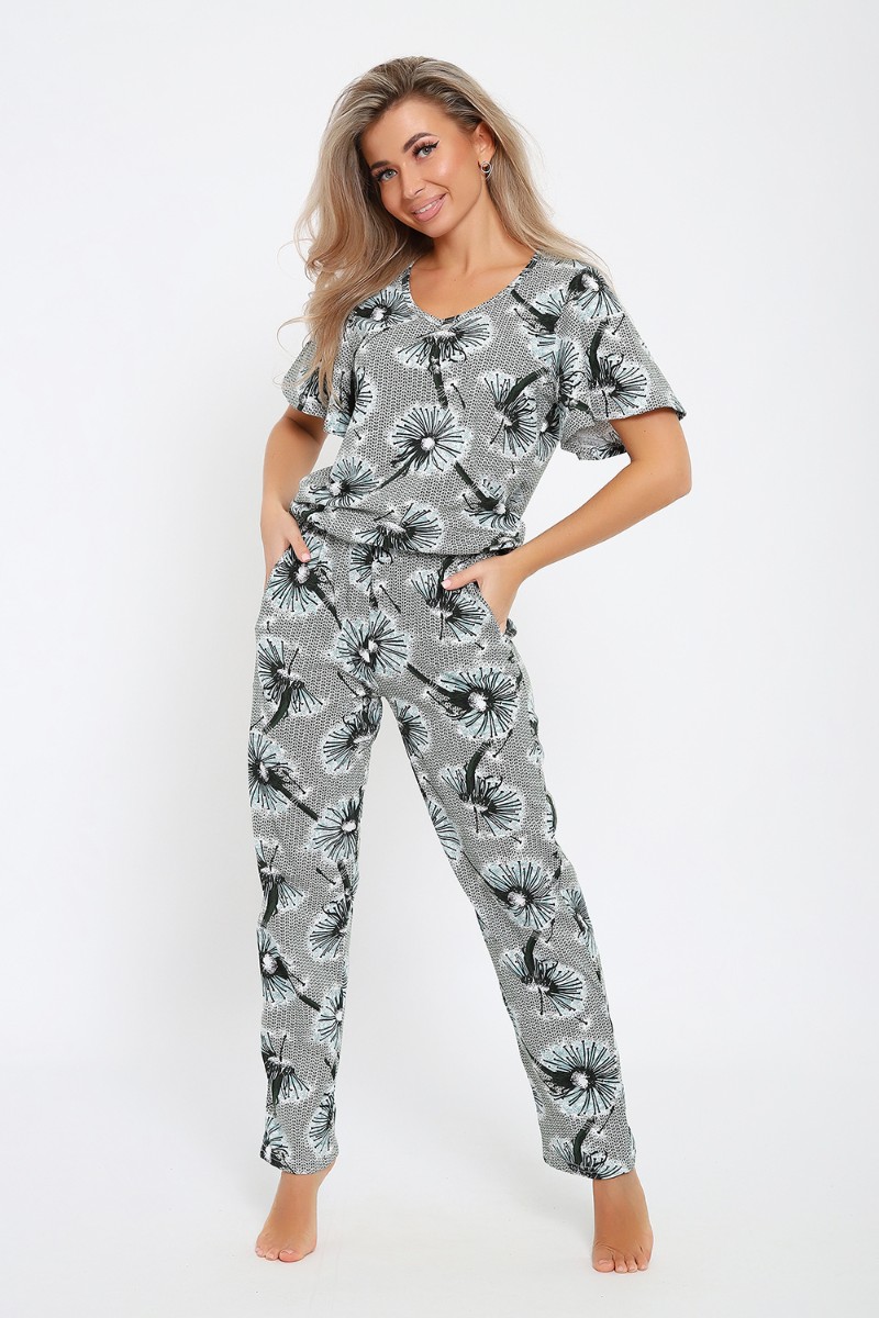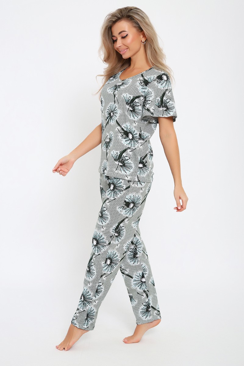 Представляем Вашему вниманию изящный женский домашний костюм, который состоит из футболки и брюк. Брюки с карманами. Футболка с короткими рукавами - крылышками. Комфортен для повседневной носки.