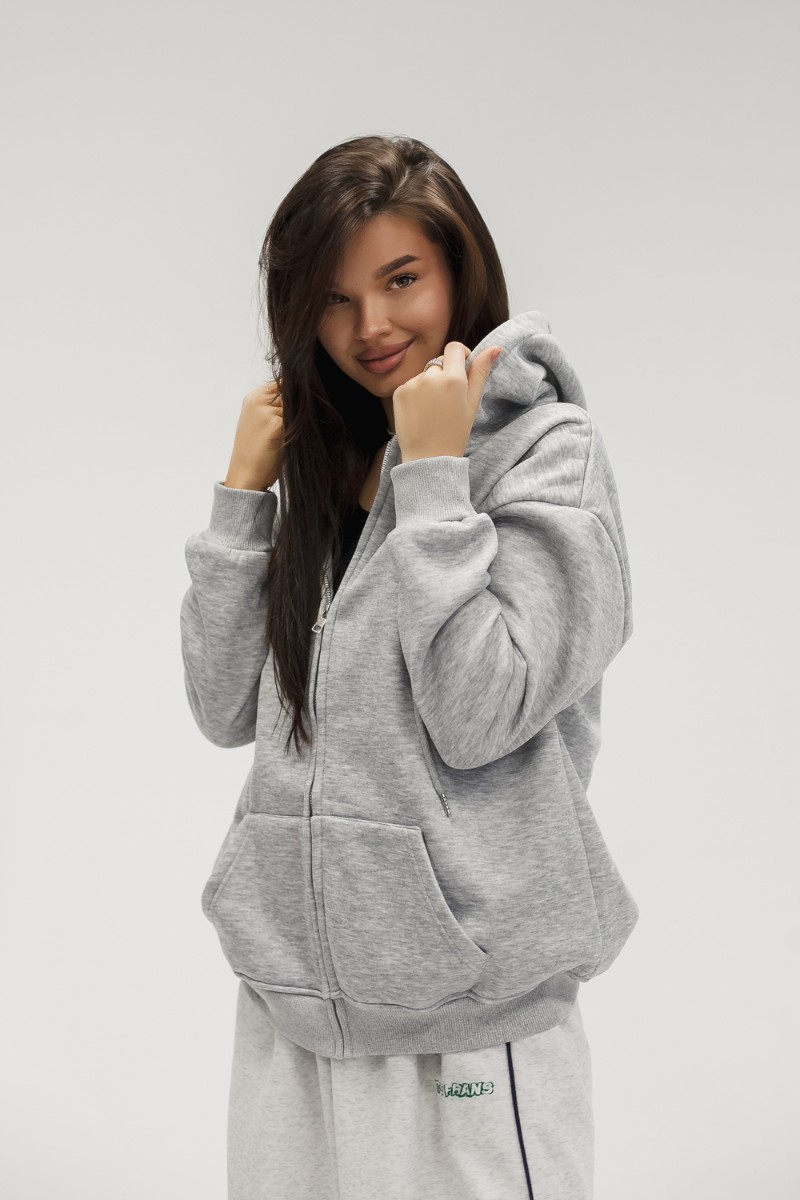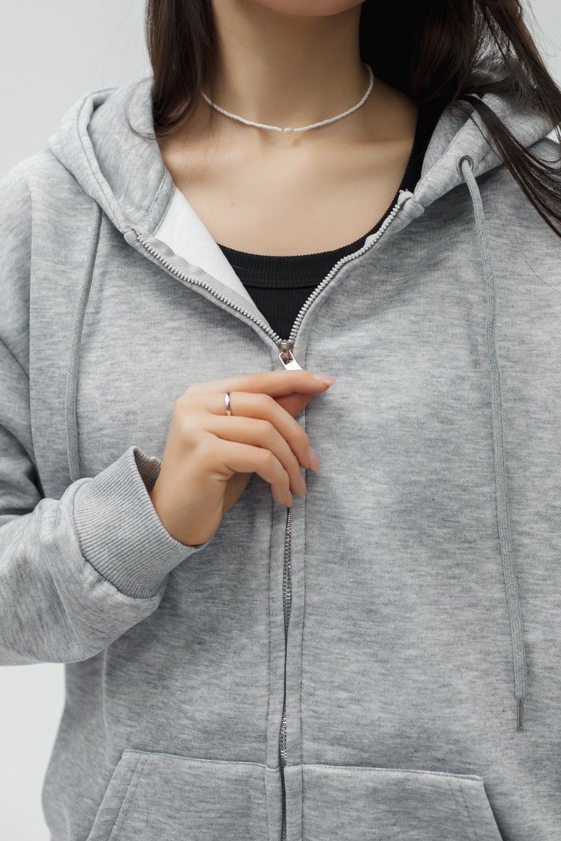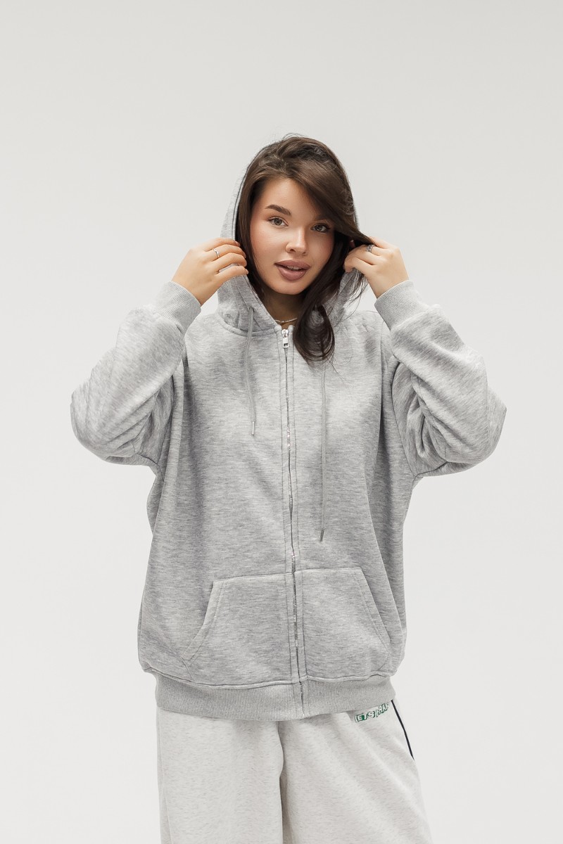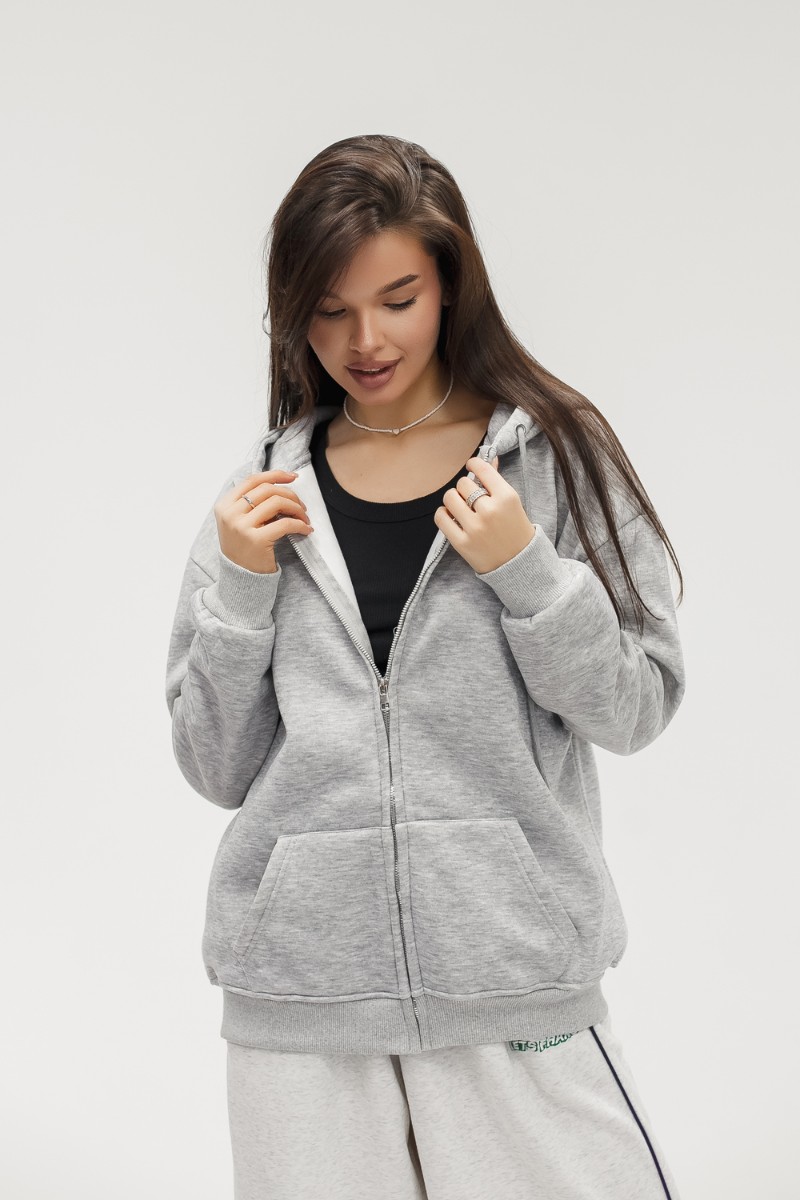 Толстовка на молнии по всей длине позволяет варьировать образ от полностью застёгнутого до свободно расстёгнутого. Вместительные карманы удобно держат руки и необходимые мелочи. Капюшон со шнурком защищает от ветра и подчёркивает спортивно‑городской стиль. Рукава на эластичных манжетах сохраняют тепло и придают аккуратную посадку, при этом свободный силуэт позволяет сочетать худи с джинсами, леггинсами, спортивными штанами или использовать как тёплую базу под короткую куртку или жилет для многослойности.