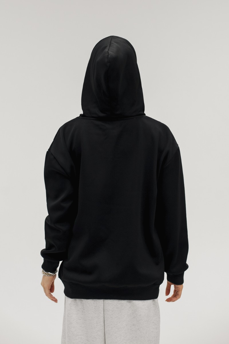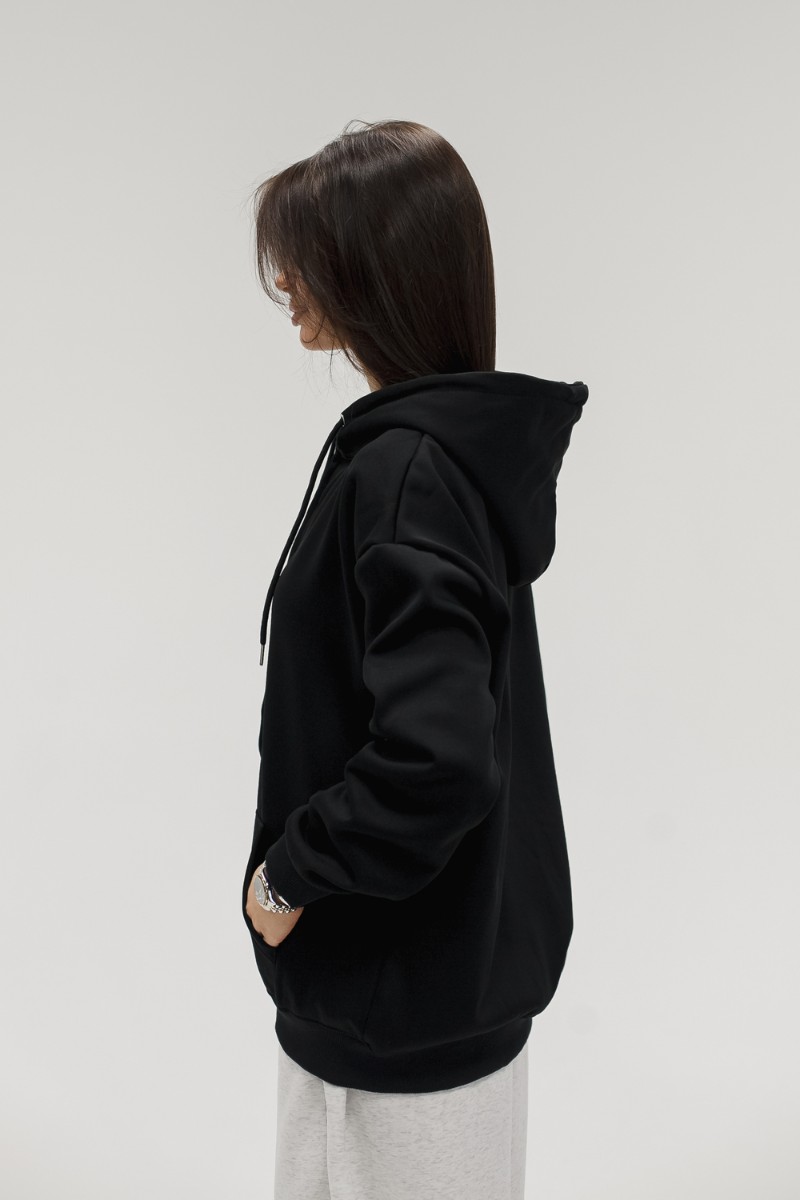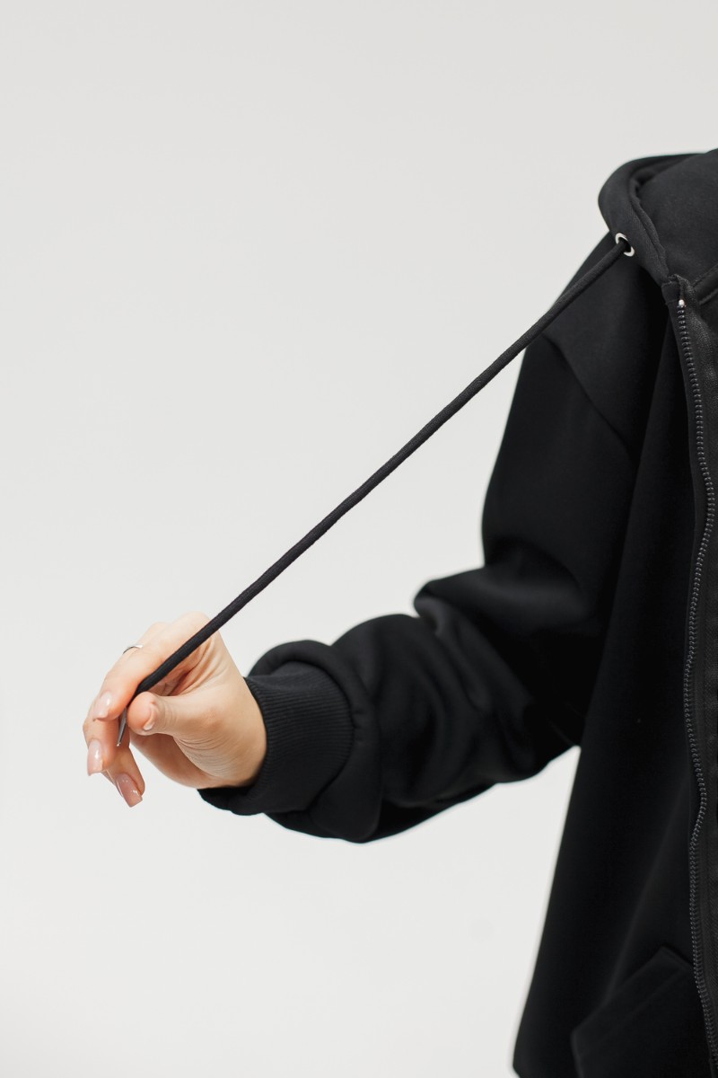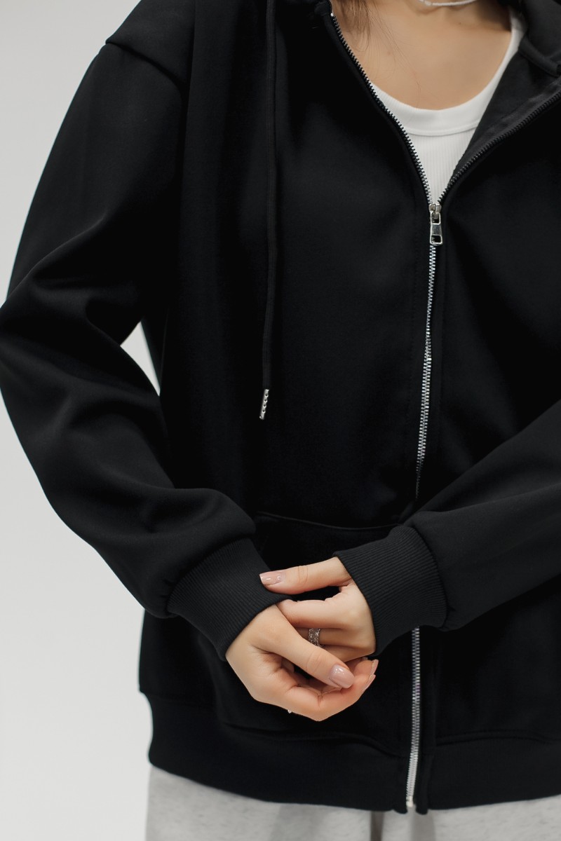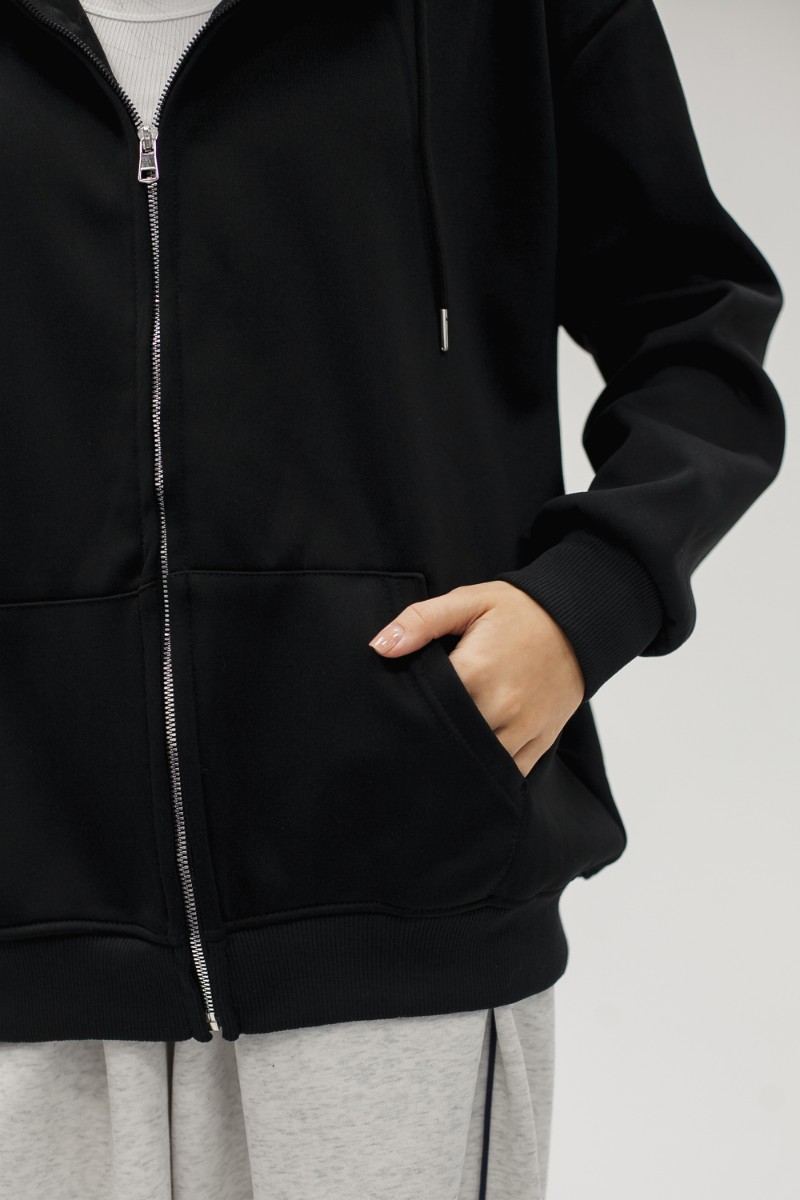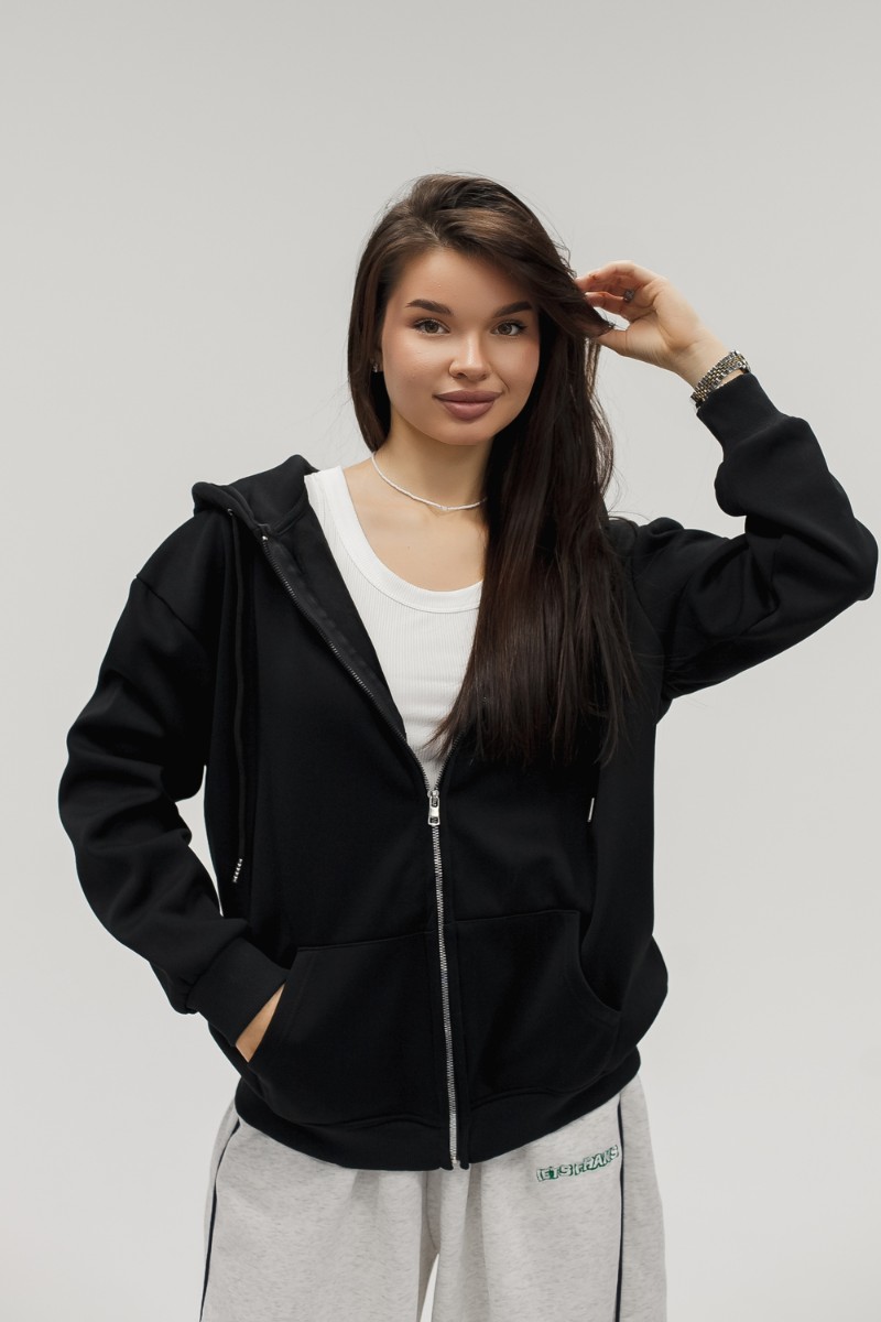 Толстовка на молнии по всей длине позволяет варьировать образ от полностью застёгнутого до свободно расстёгнутого. Вместительные карманы удобно держат руки и необходимые мелочи. Капюшон со шнурком защищает от ветра и подчёркивает спортивно‑городской стиль. Рукава на эластичных манжетах сохраняют тепло и придают аккуратную посадку, при этом свободный силуэт позволяет сочетать худи с джинсами, леггинсами, спортивными штанами или использовать как тёплую базу под короткую куртку или жилет для многослойности.