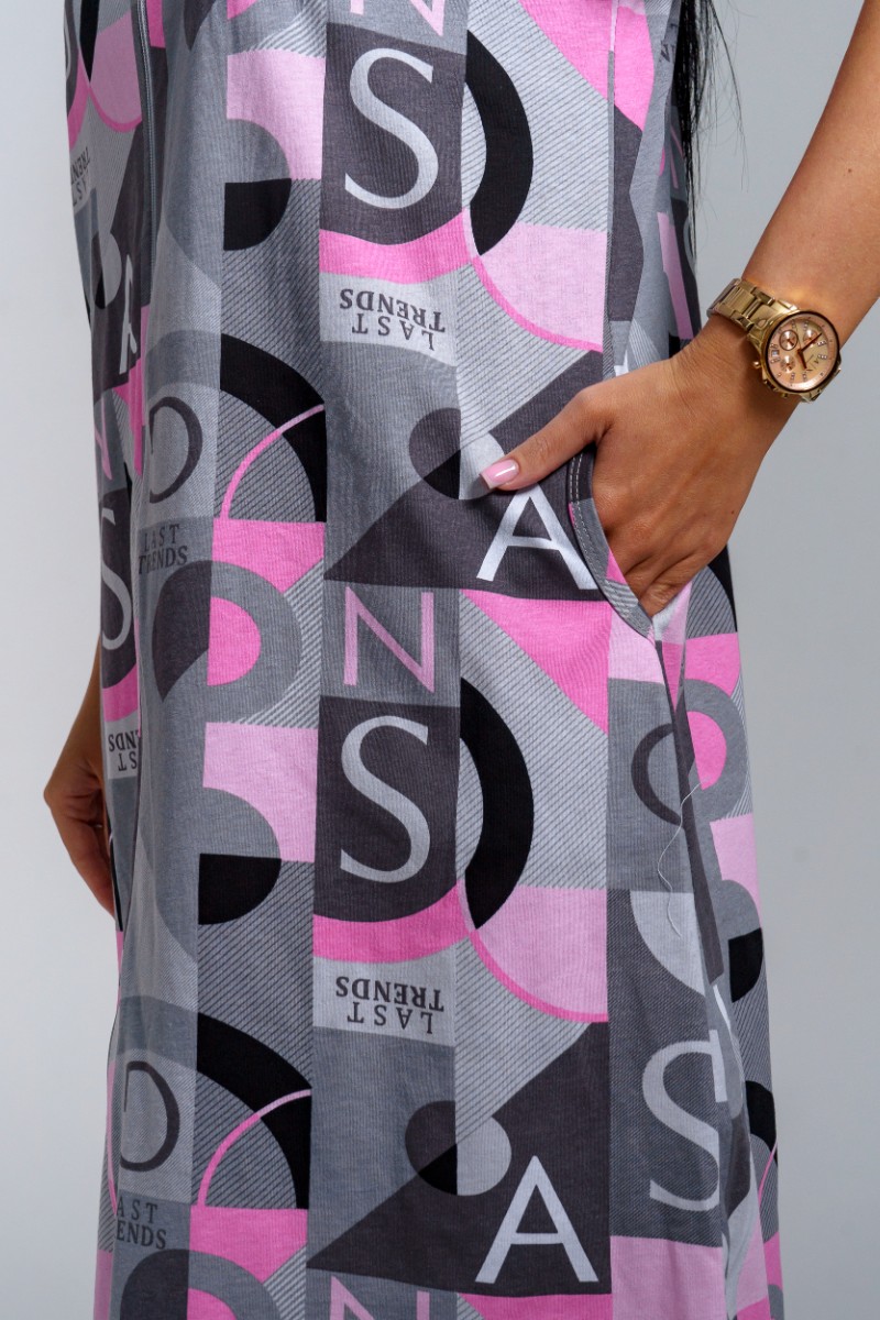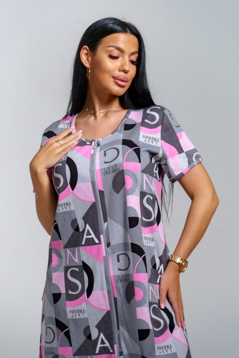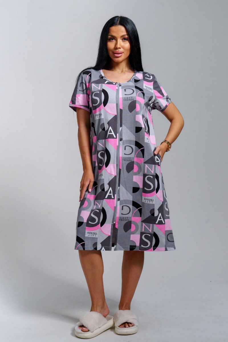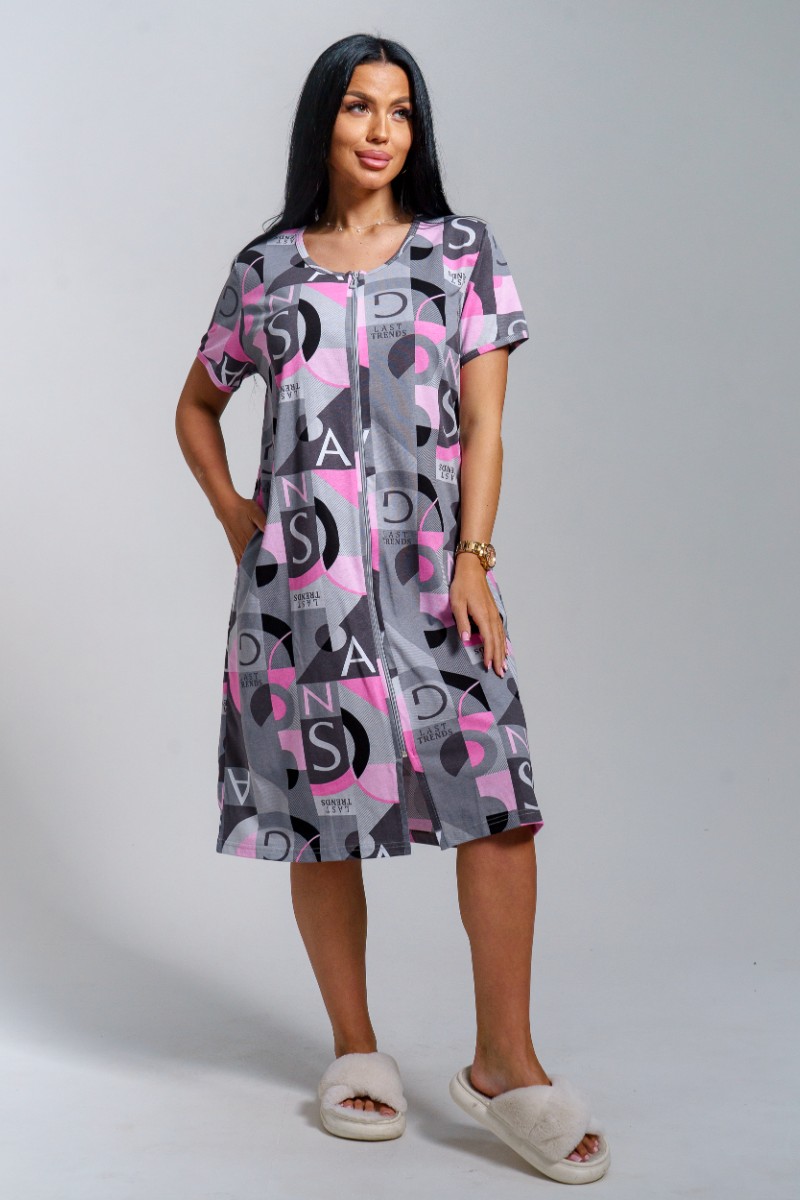 Представляем Вашему вниманию легкий женский халат из кулирки - 100% натурального, дышащего хлопка. Халат с коротким рукавом на молнии, в боковых швах карманы, горловина и низ рукава окантованы. Модель имеет интересную расцветку, которая красиво смотрится и поднимает настроение. Изделие хорошо сидит на фигуре и подчеркивает её достоинства. В нём Вы будете чувствовать себя комфортно и уверенно.
