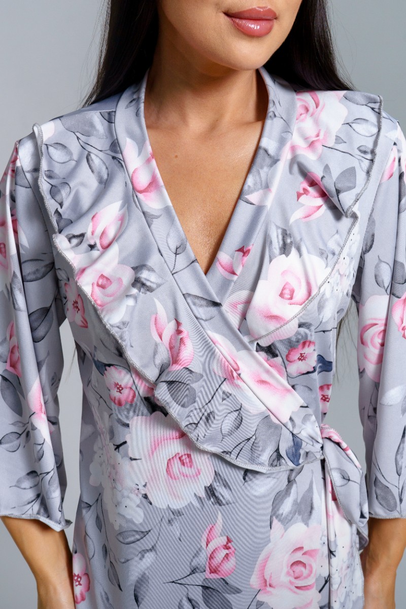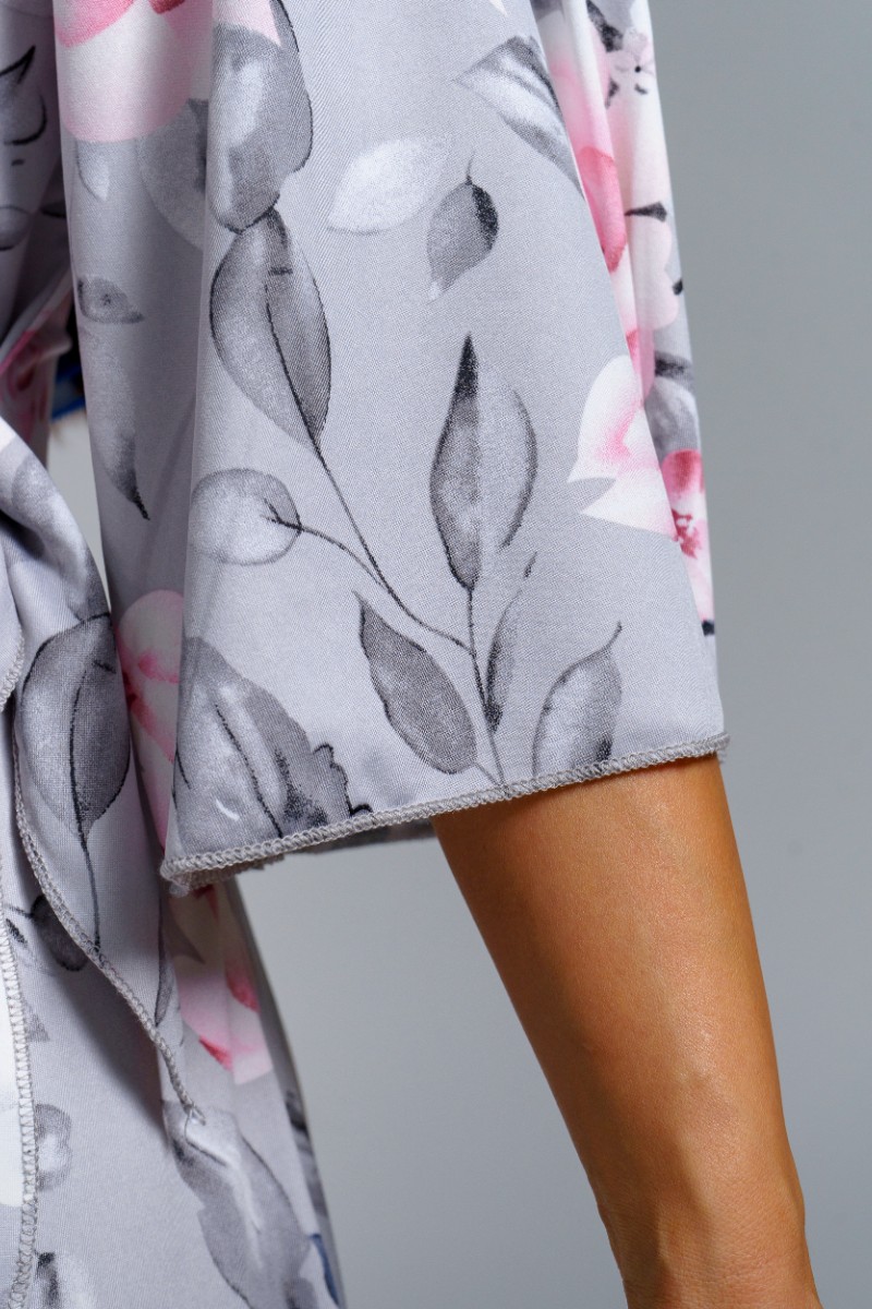 Представляем Вашему вниманию оригинальный женский халат из струящейся ткани с расклешенными рукавами. Срезы халаты обработаны специальной строчкой, вырез горловины украшен оборкой.