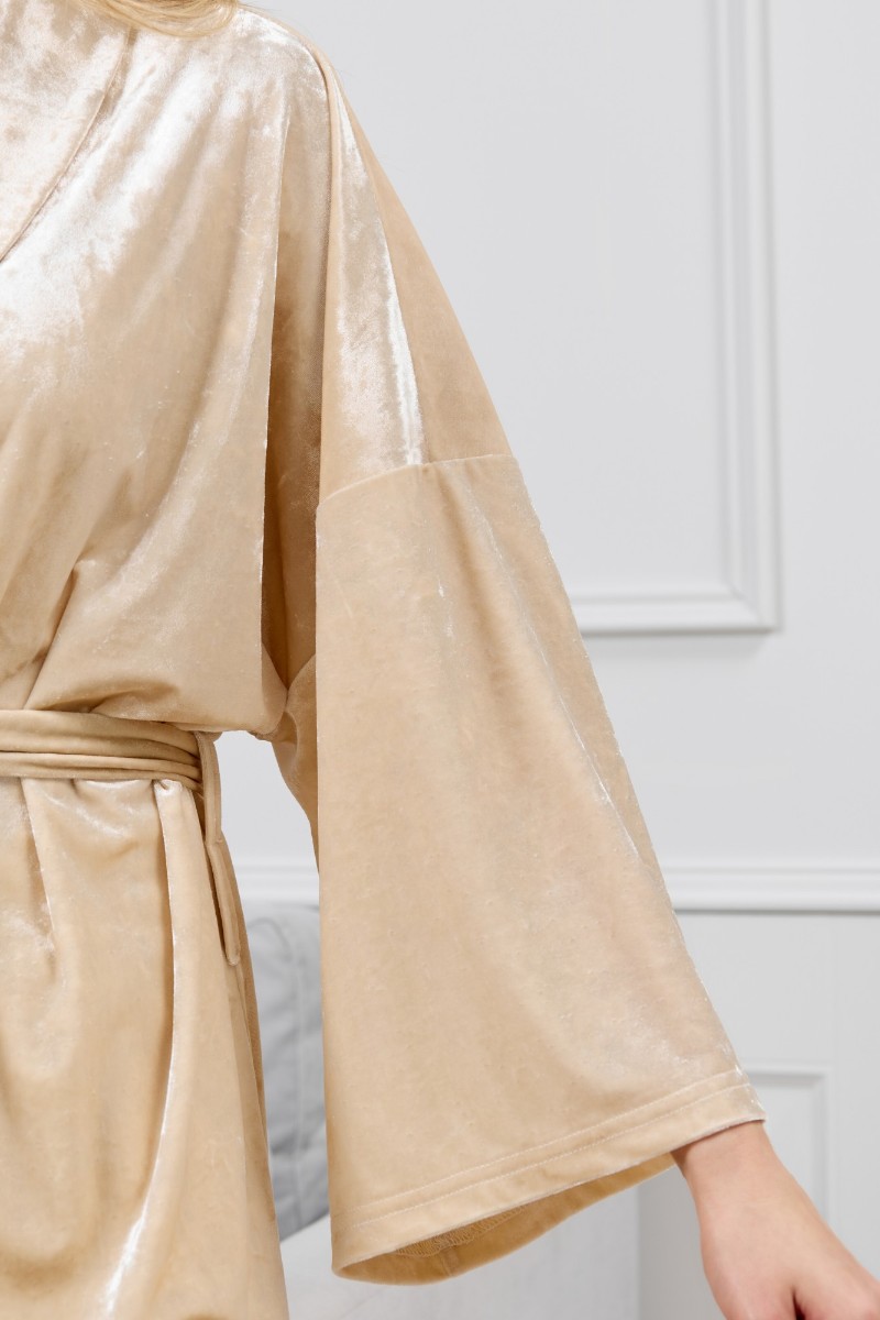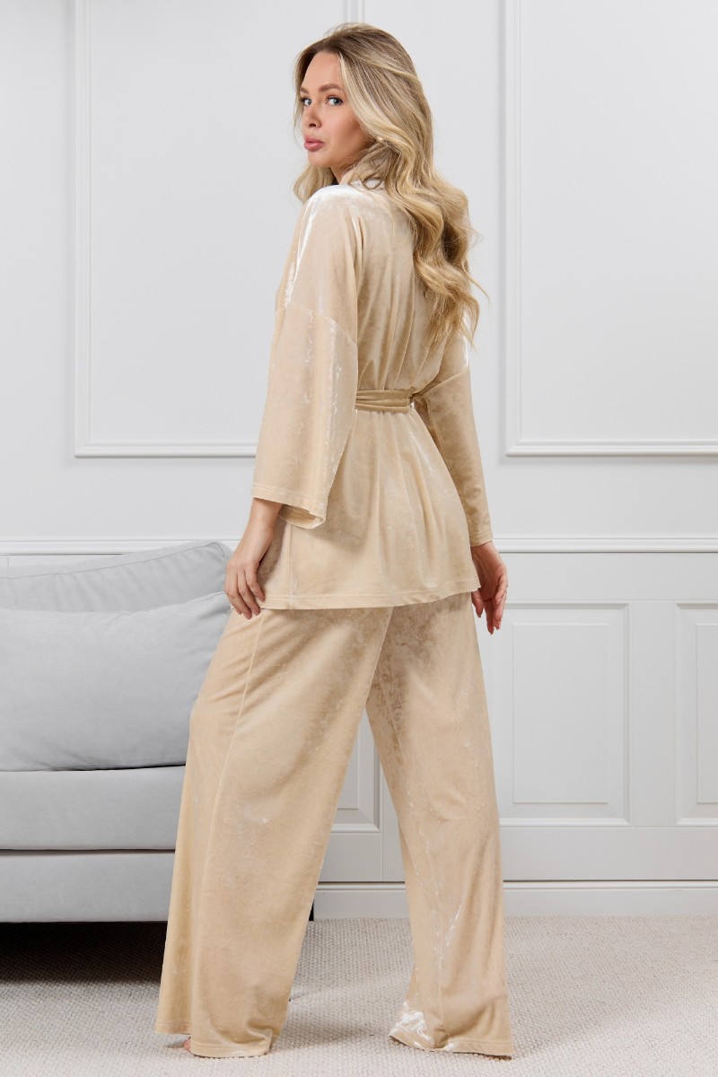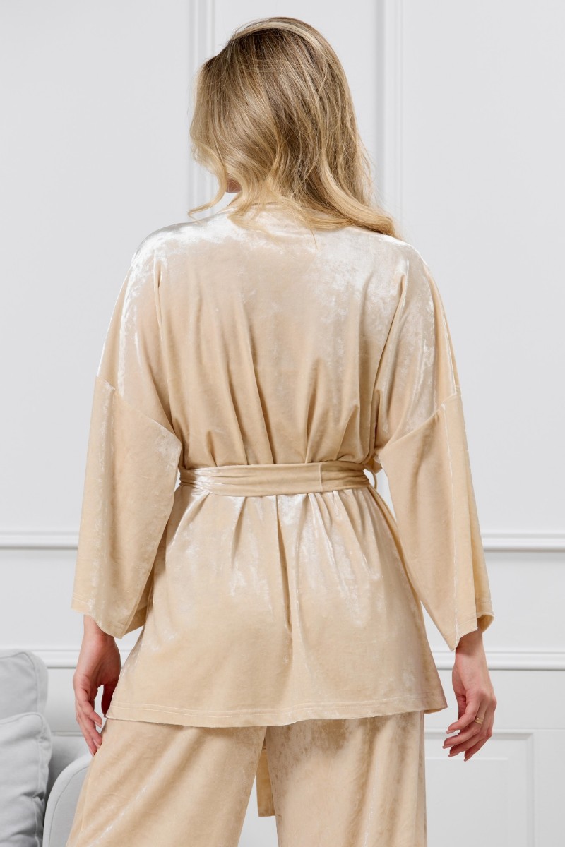 Представляем Вашему вниманию женский костюм из гладкокрашенного полотна «велюр стрейч» с мраморным эффектом, состоящий из кимоно и брюк. Кимоно прямого кроя, свободное, на запахе, с втачными рукавами ¾ длины и съемным поясом, фиксирующимся на талии двумя шлевками в боковых швах.Брюки свободные, на притачном поясе с эластичной тесьмой внутри и карманами в боковых швах.