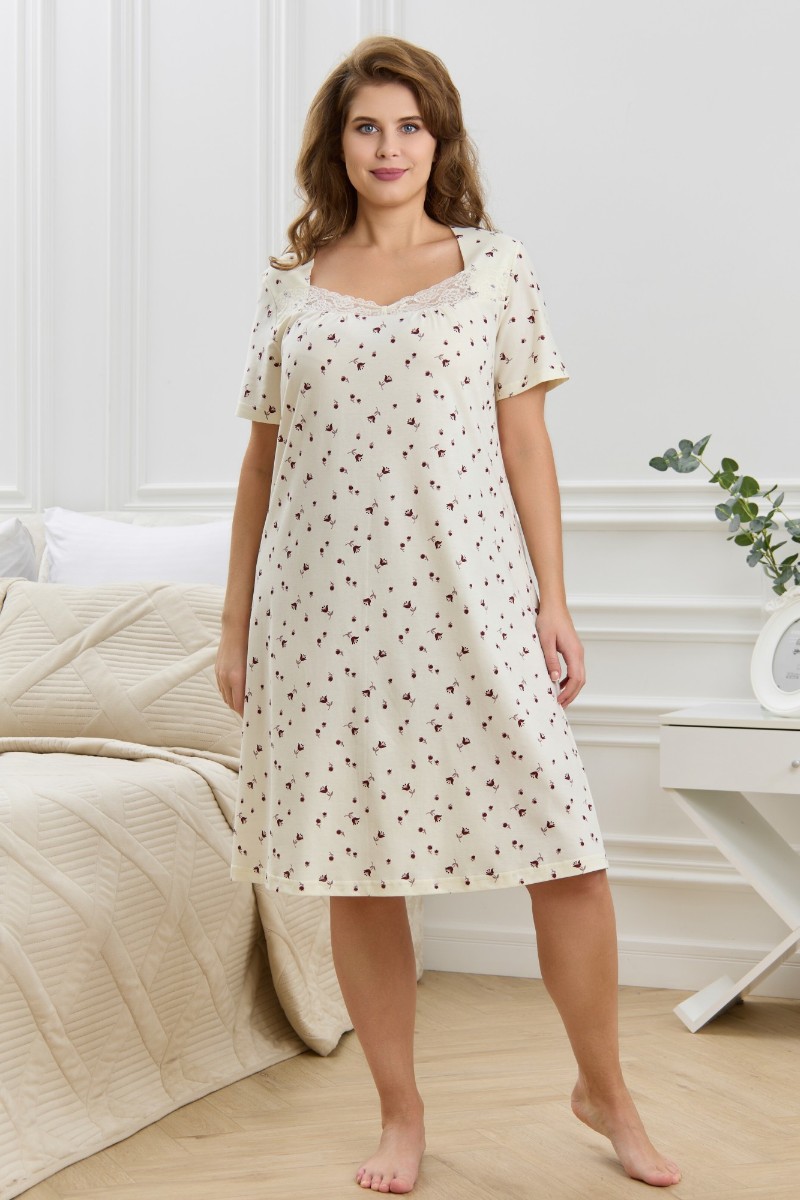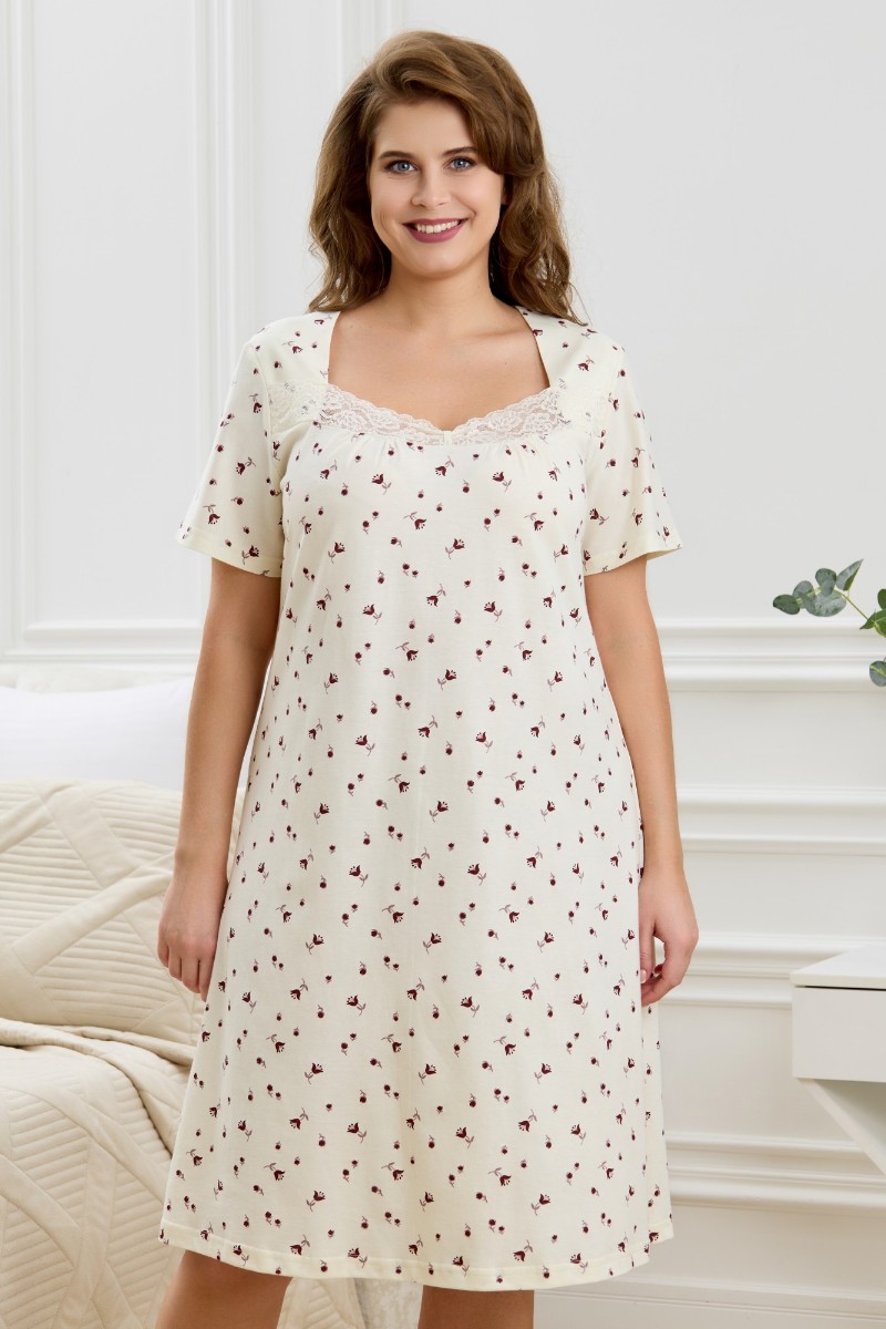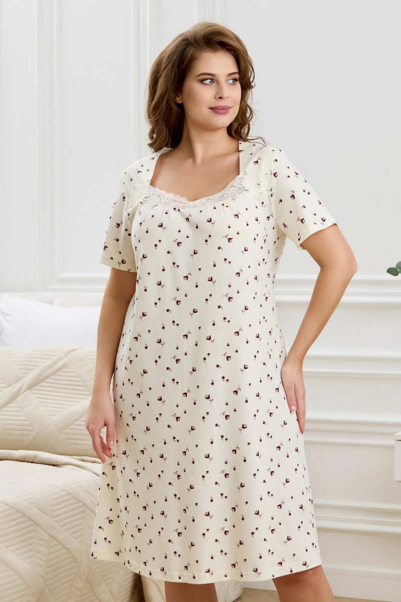 Представляем Вашему вниманию женскую сорочку из трикотажного полотна «кулирка» с набивным рисунком, свободного кроя, слегка расширенная книзу, с короткими втачными рукавами. Полочка – с двойными кокетками, кружевом в шве соединения кокеток с основной деталью и декоративной вставкой «петлей» для достижения небольшого эффекта драпировки. Основная деталь переда присборена по шву притачивания кокетки.