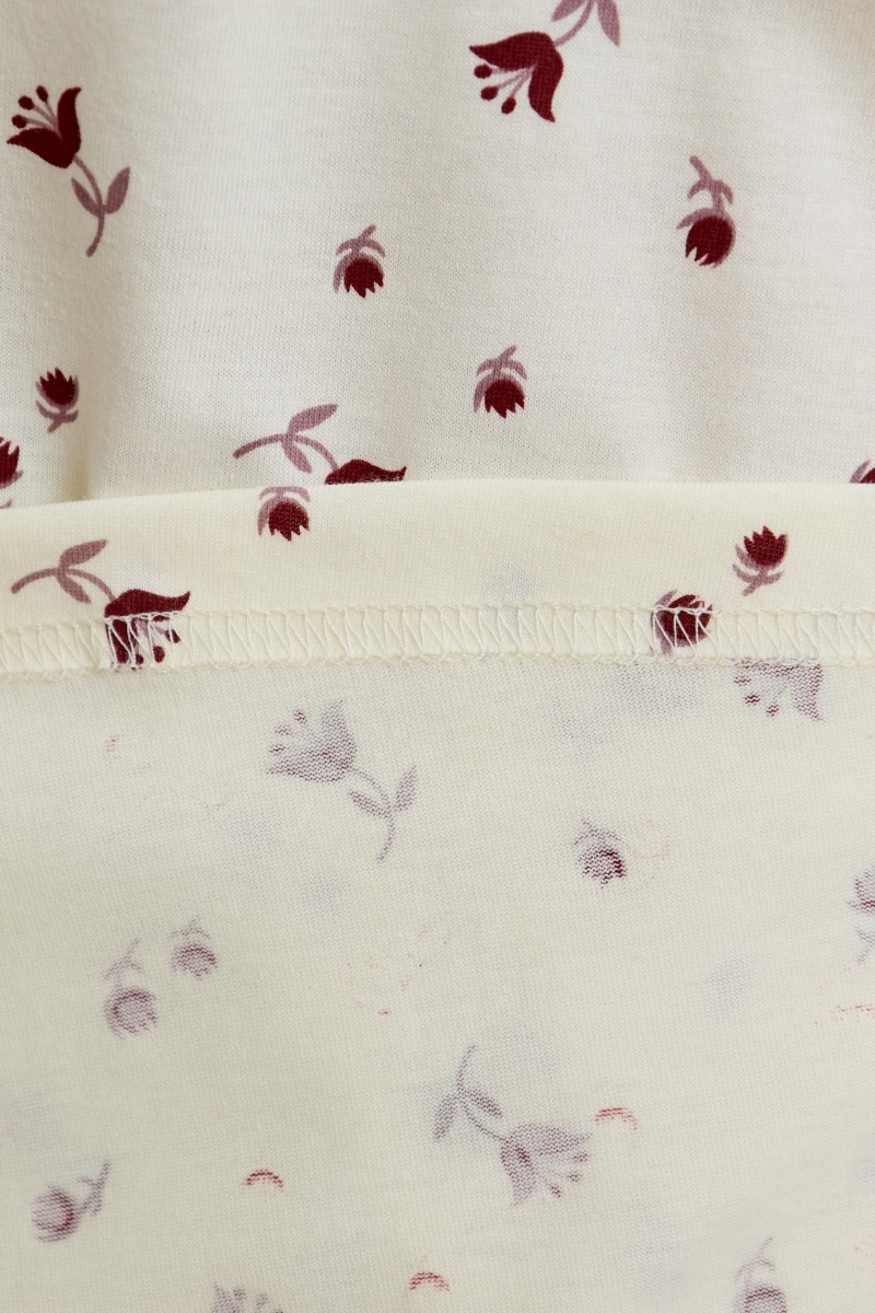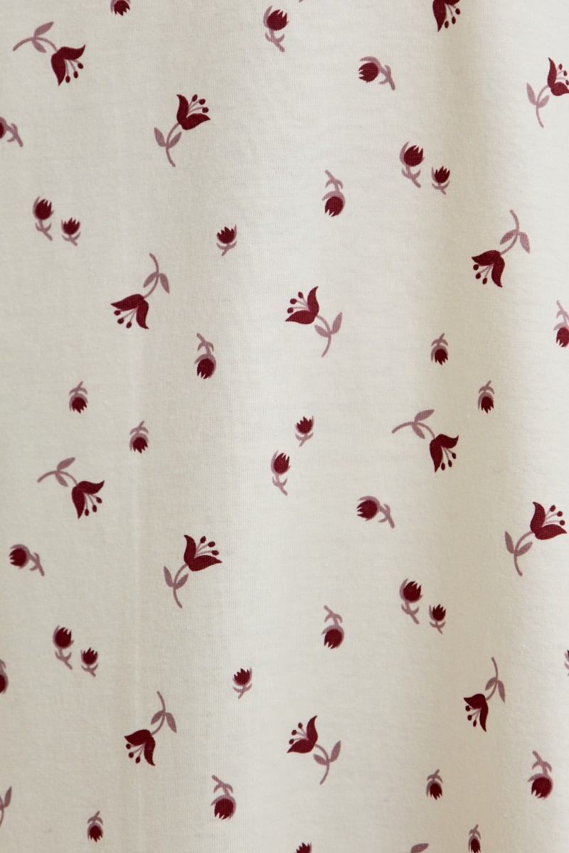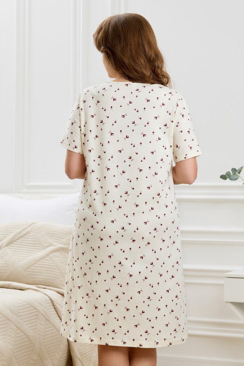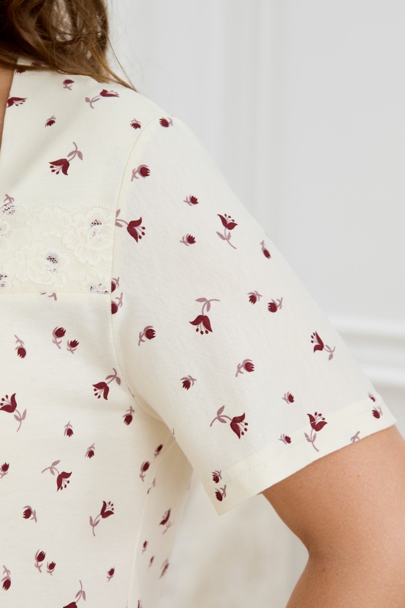 Представляем Вашему вниманию женскую сорочку из трикотажного полотна «кулирка» с набивным рисунком, свободного кроя, слегка расширенная книзу, с короткими втачными рукавами. Полочка – с двойными кокетками, кружевом в шве соединения кокеток с основной деталью и декоративной вставкой «петлей» для достижения небольшого эффекта драпировки. Основная деталь переда присборена по шву притачивания кокетки.
