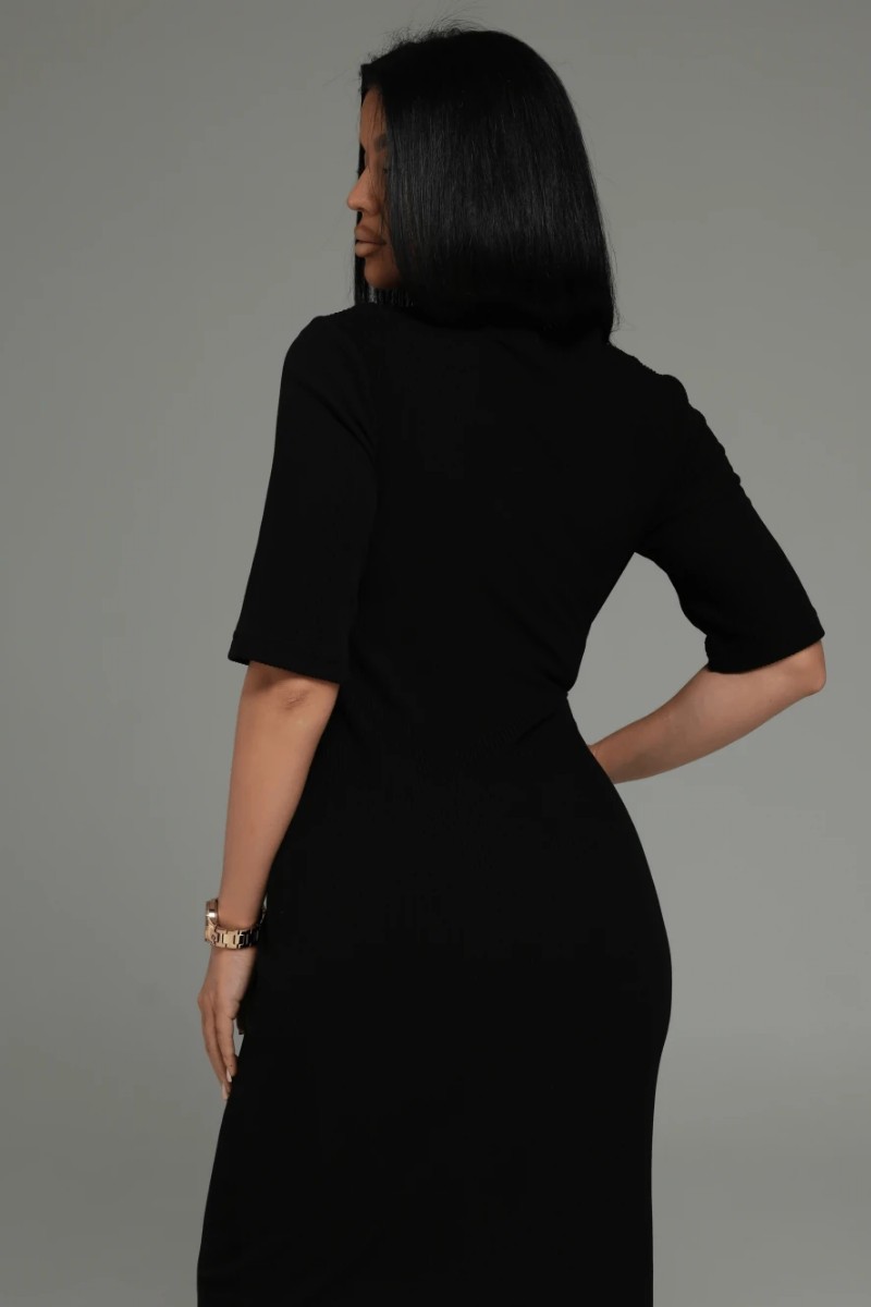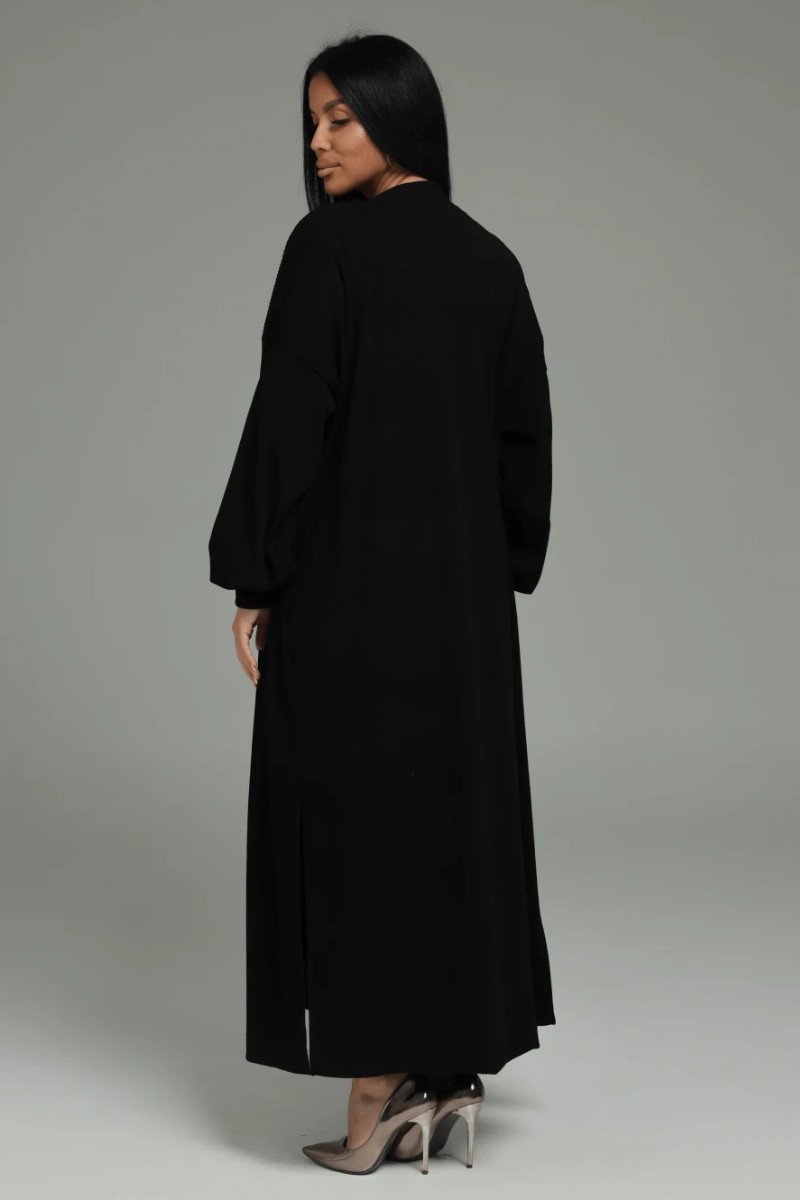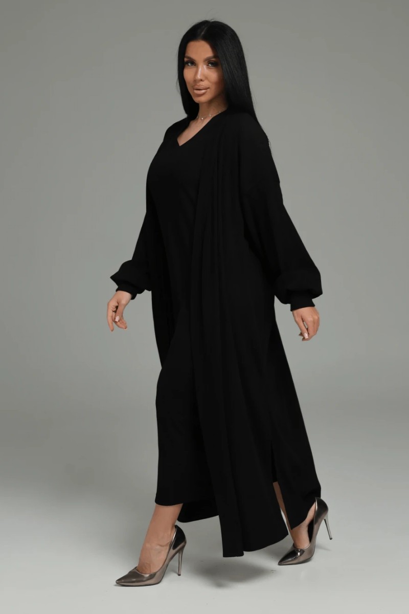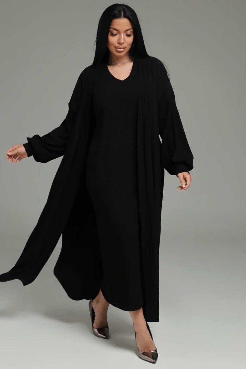 Безупречная посадка: Платье прилегающего кроя повторяет изгибы тела, а свободный кардиган с боковыми разрезами позволяет легко двигаться и создает летящий силуэт.