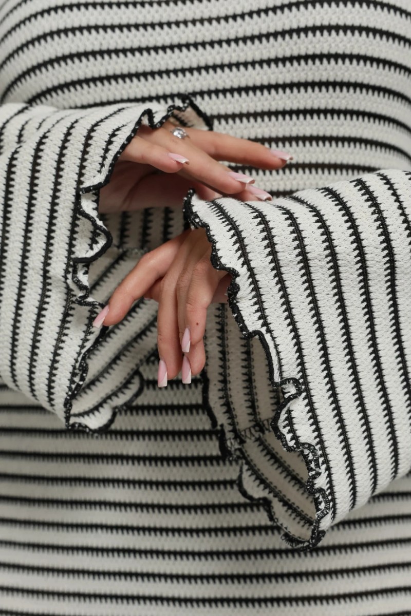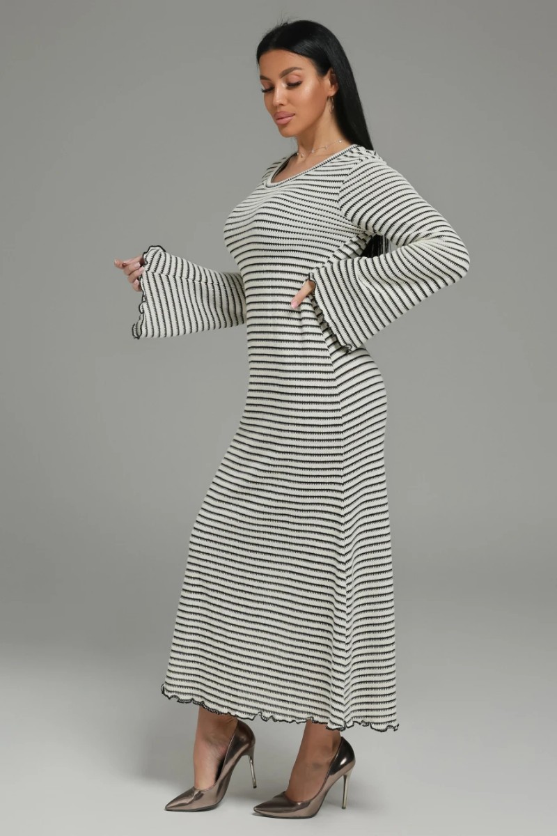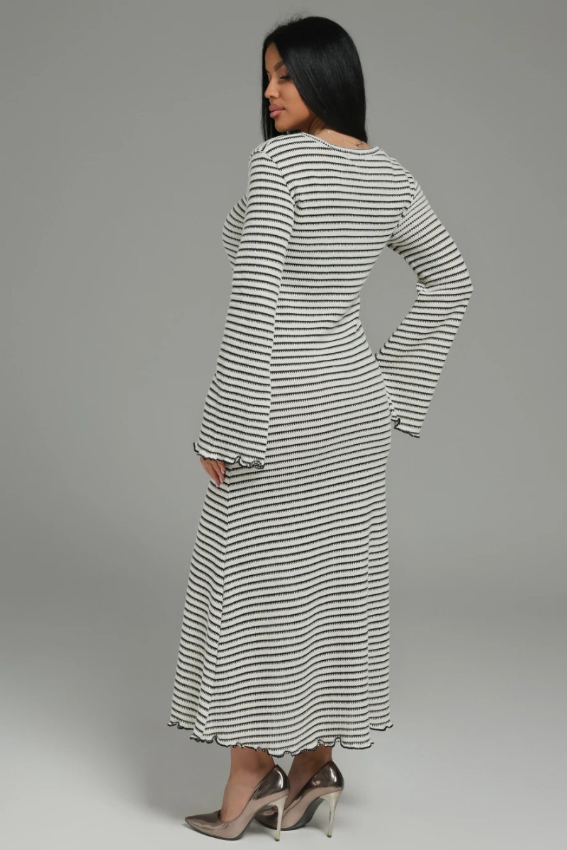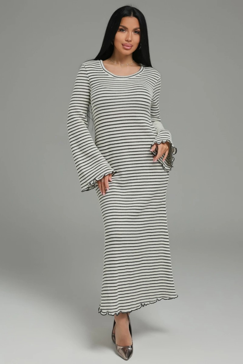 Женственный силуэт: Приталенный крой мягко облегает талию и плавно расклешивается к низу, создавая изящный и романтичный образ. Длинный расклешенный рукав добавляет динамики и элегантности.