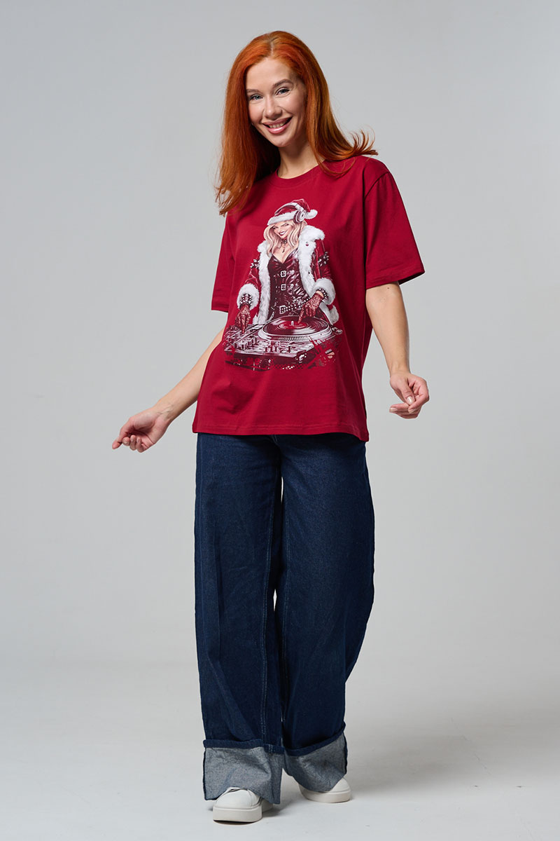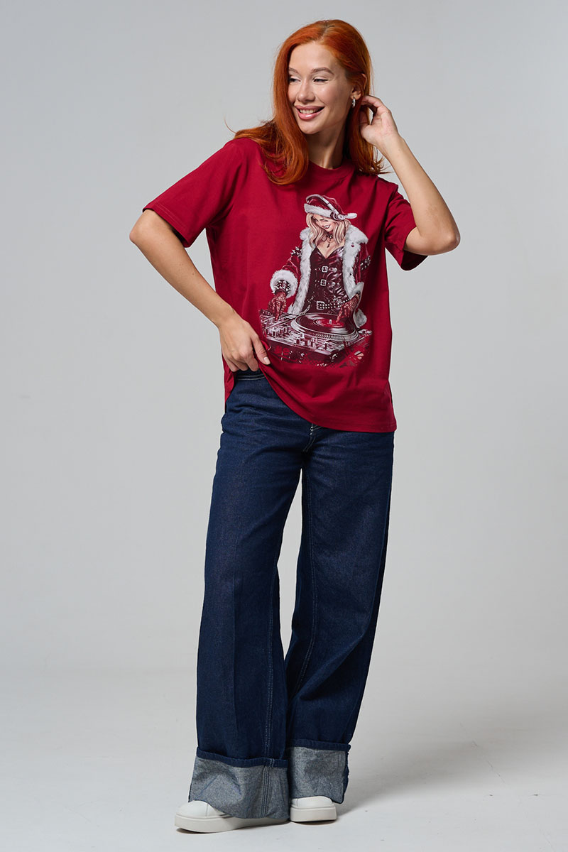 Представляем Вашему вниманию крутую футболку. Эта футболка создана для тех, кто любит миксовать новогоднюю атмосферу с ритмом музыки. Главная героиня принта — соблазнительная Санта в меховой накидке, с красной шапкой и наушниками, уверенно стоящая за диджейским пультом. Её образ сочетает классический рождественский стиль с современным уличным вайбом: белый мех, чёрная кожаная одежда и динамичная поза, полная энергии.