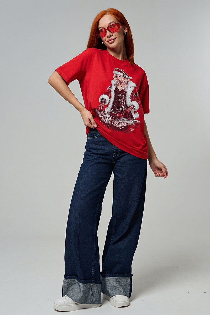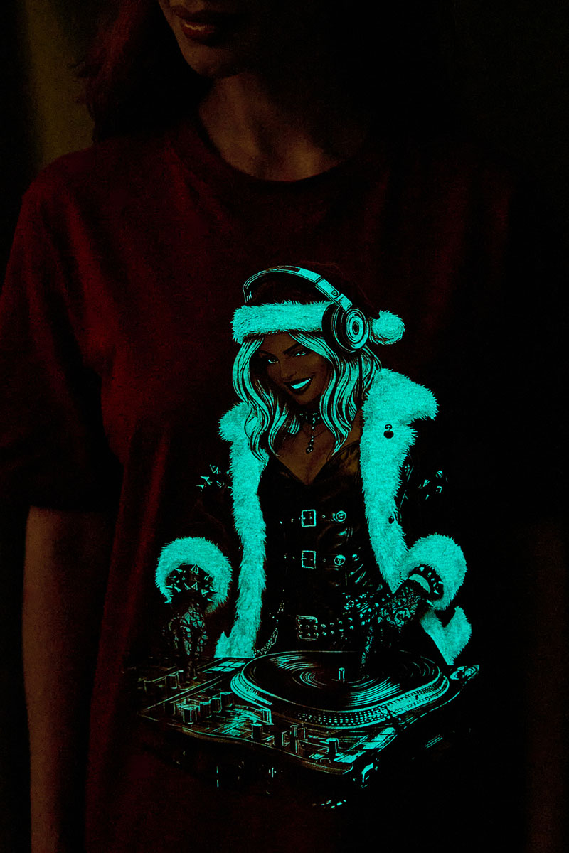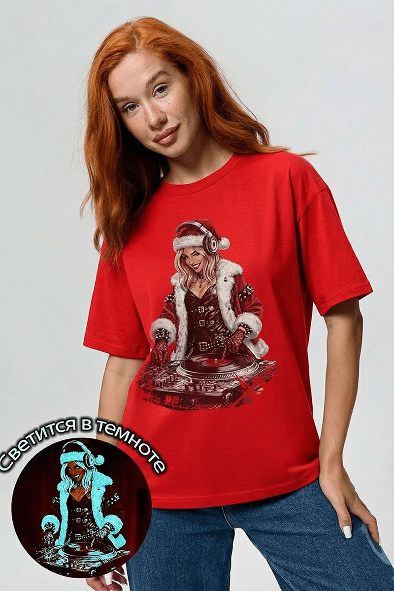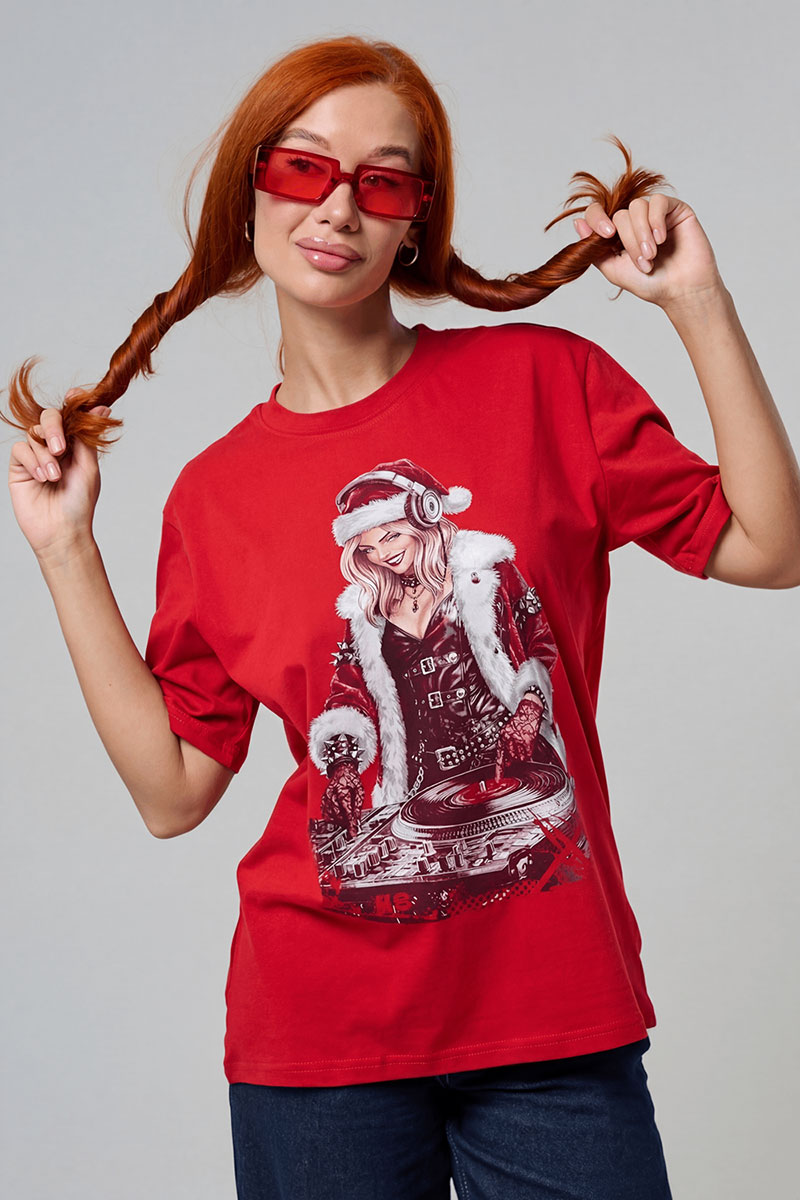 Представляем Вашему вниманию крутую футболку. Эта футболка создана для тех, кто любит миксовать новогоднюю атмосферу с ритмом музыки. Главная героиня принта — соблазнительная Санта в меховой накидке, с красной шапкой и наушниками, уверенно стоящая за диджейским пультом. Её образ сочетает классический рождественский стиль с современным уличным вайбом: белый мех, чёрная кожаная одежда и динамичная поза, полная энергии.