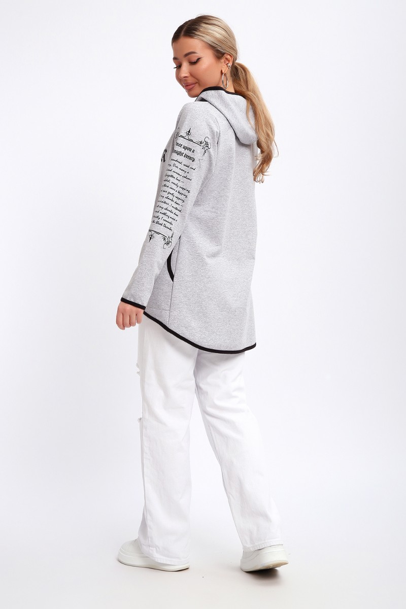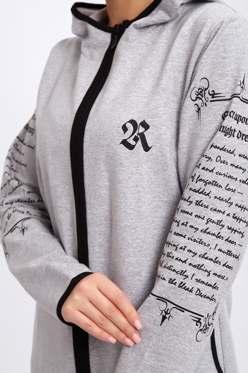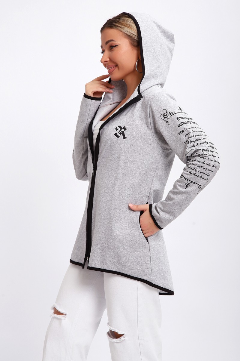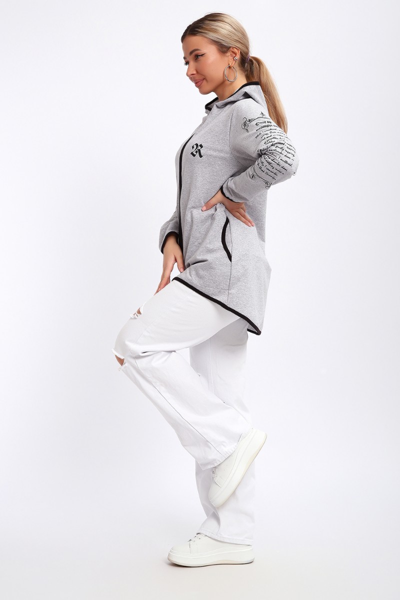 Представляем Вашему вниманию женскую тунику необычного кроя на молнии, с капюшоном. Рукава длинные без манжетов, спинка длиннее переда. Карманы, рукава, капюшон и низ изделия обработан отделочной тканью. Принт на рукавах и полочке. Идеальное решение для прогулок, спорта или повседневного использования. Туника станет незаменимым элементом вашего гардероба.
