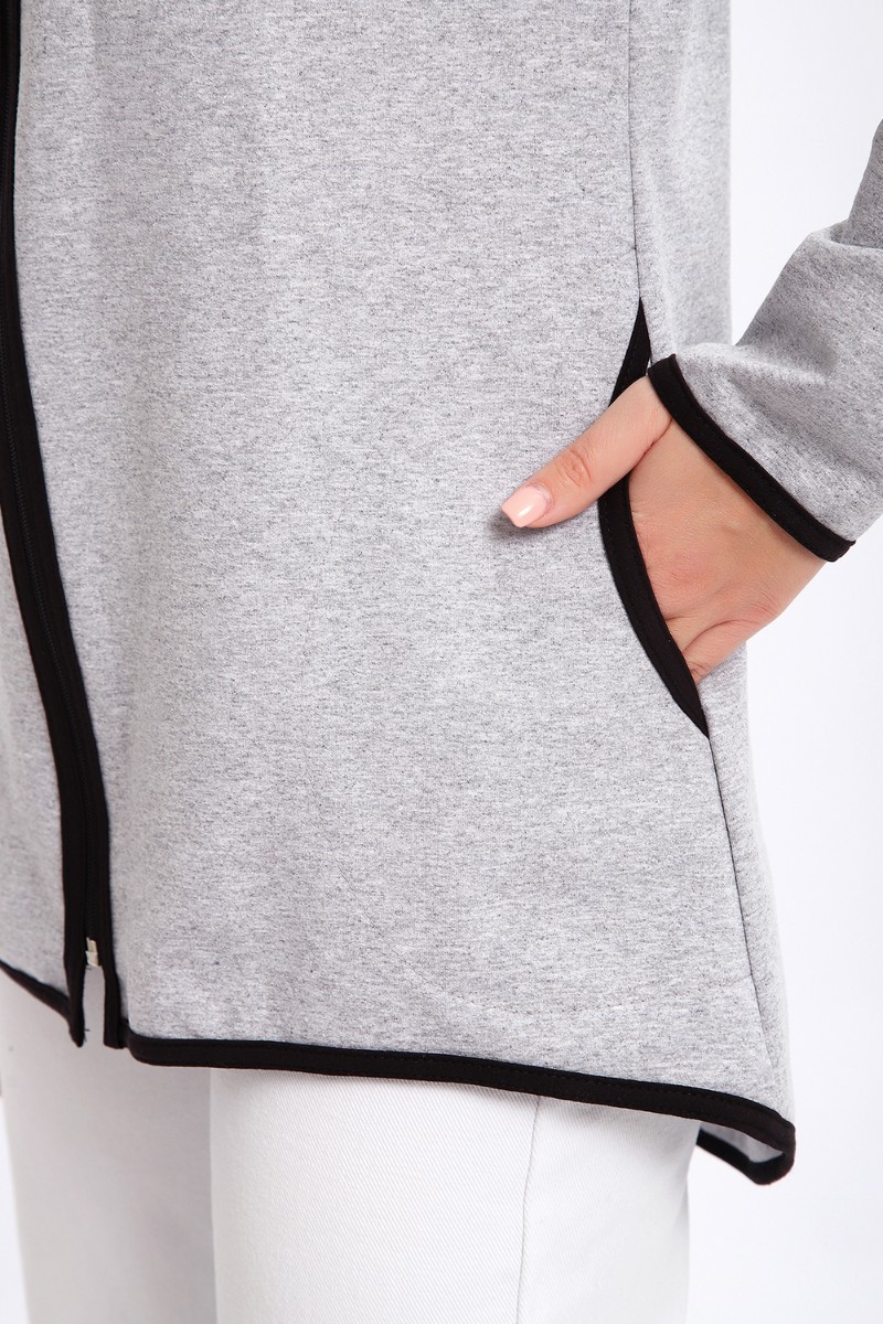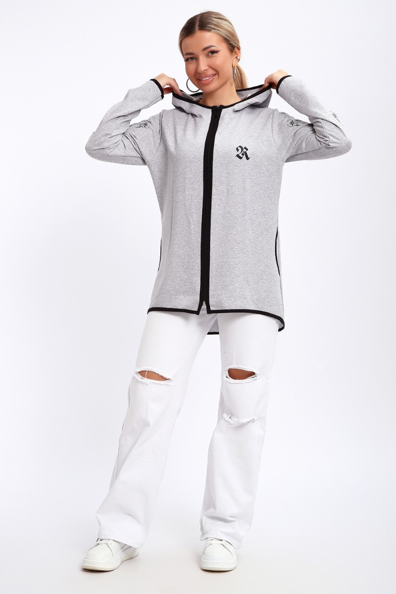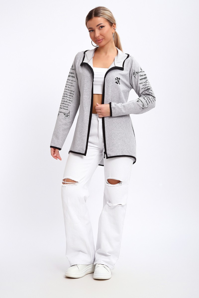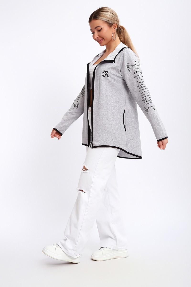 Представляем Вашему вниманию женскую тунику необычного кроя на молнии, с капюшоном. Рукава длинные без манжетов, спинка длиннее переда. Карманы, рукава, капюшон и низ изделия обработан отделочной тканью. Принт на рукавах и полочке. Идеальное решение для прогулок, спорта или повседневного использования. Туника станет незаменимым элементом вашего гардероба.