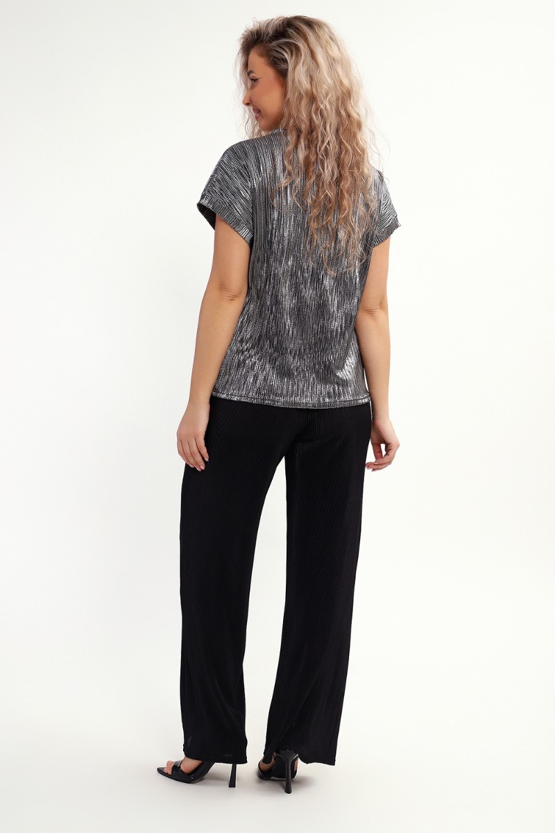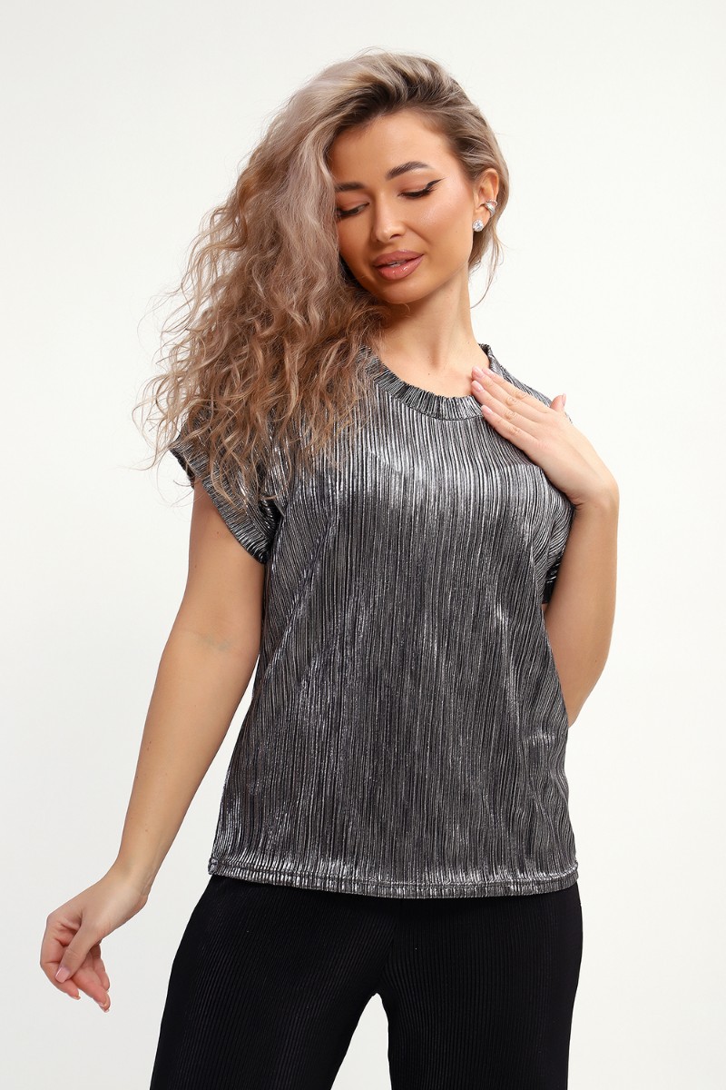 Представляем Вашему вниманию стильную нарядную блузку, сочетающую в себе комфорт и элегантность. Благодаря свободному крою, блузка создает легкий силуэт и деликатно скрывает особенности фигуры. Добавляет изюминку изделию блестящая ткань с прочным напылением фойл, которое отлично держится на ткани после стирки. Ткань атлас гофре приятна на ощупь, хорошо тянется, не мнется, держит форму. Блузка смотрится и как офисная, и как вечерняя модель, а также это отличный вариант для летнего наряда. Округлая горловина, обработанная обтачкой, подчеркивает женственность образа, спущенный рукав не стесняет движений. Нарядная блузка позволит вам эффектно выглядеть не только на праздничных мероприятиях, но и в будни.