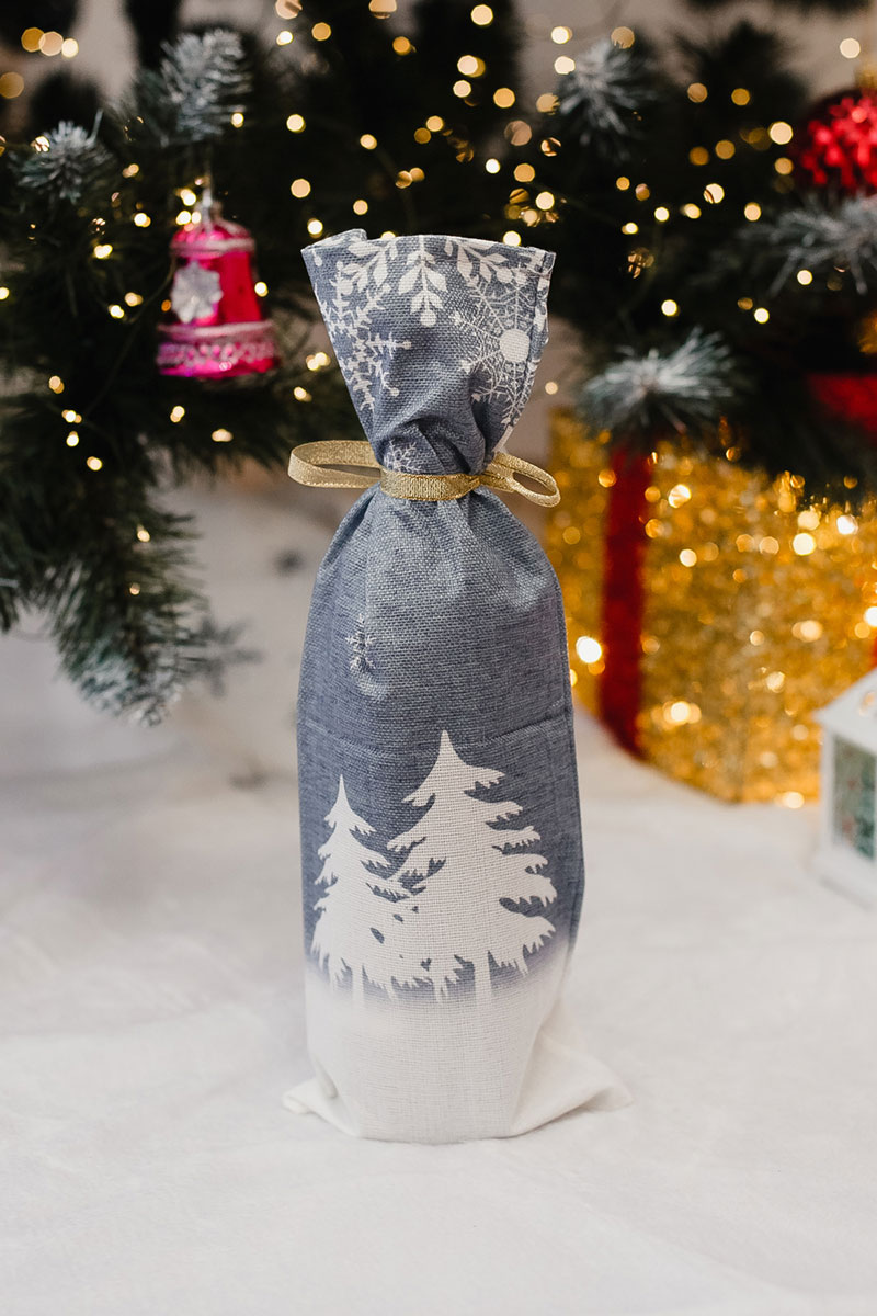 Представляем Вашему вниманию новогодний текстильный чехол на бутылку с завязками и новогодним принтом гномы — это стильная и практичная упаковка для бутылок вина и шампанского, изготовленная из плотного многоразового текстиля с аккуратной прострочкой и рисунком, который придаёт изделию праздничный и уютный вид.