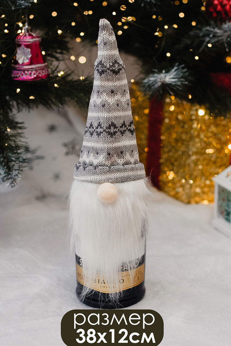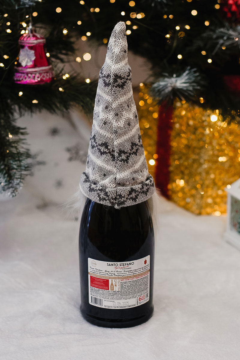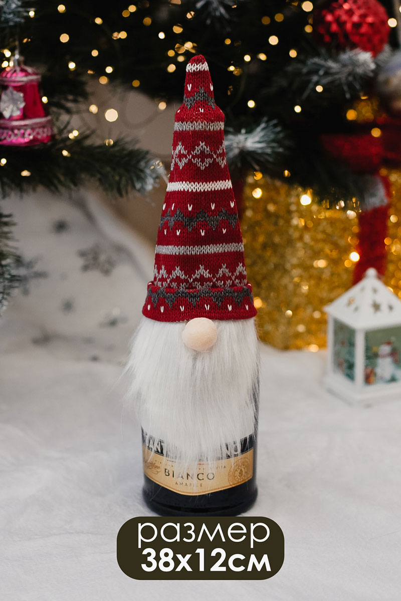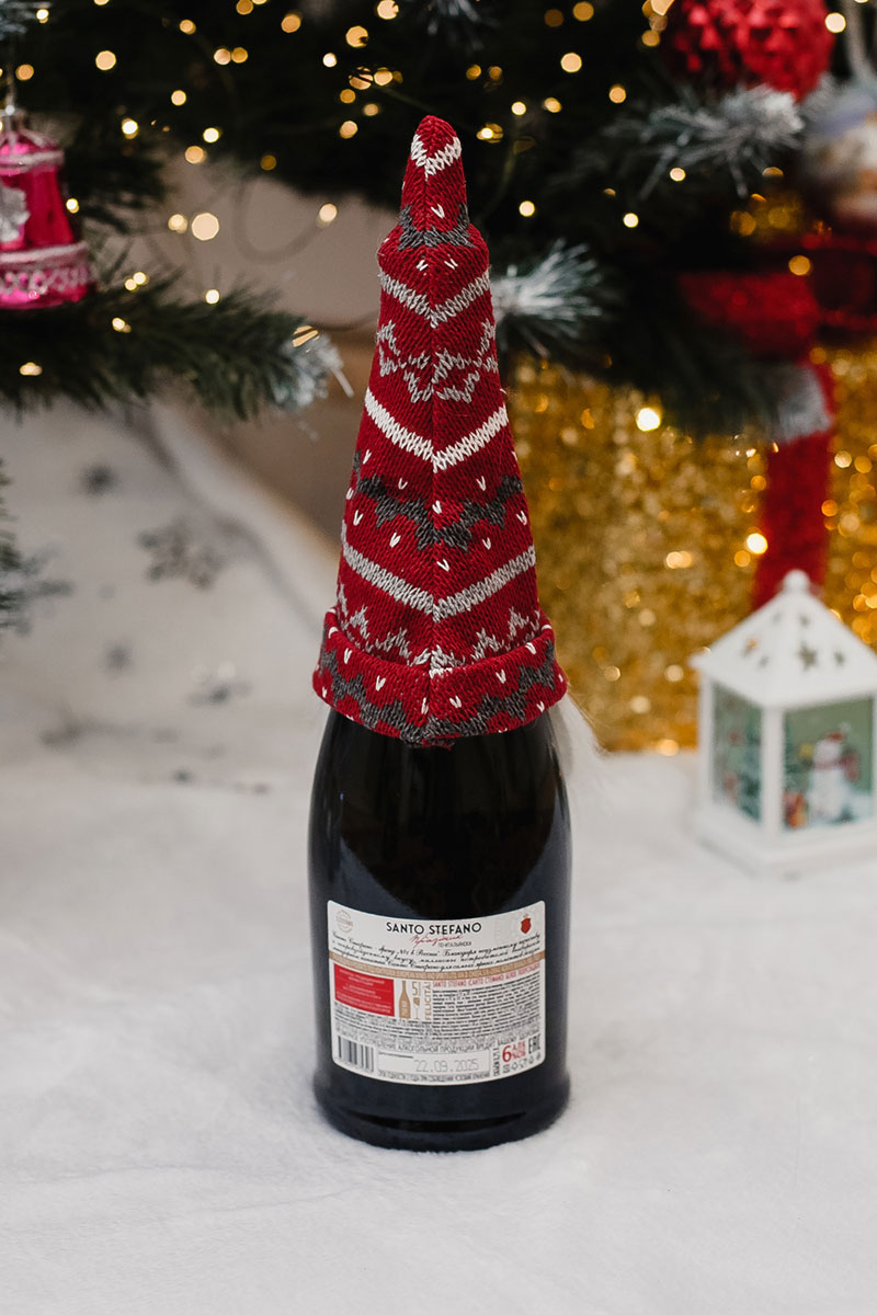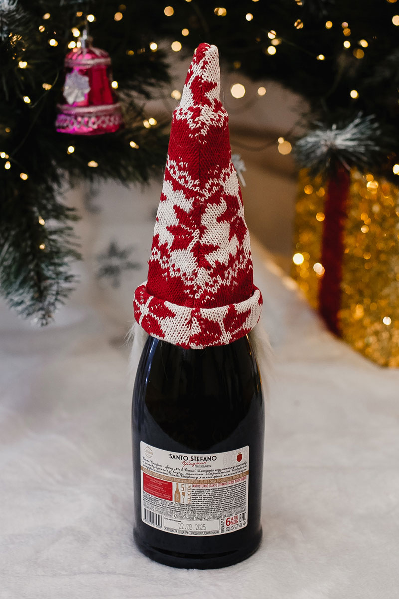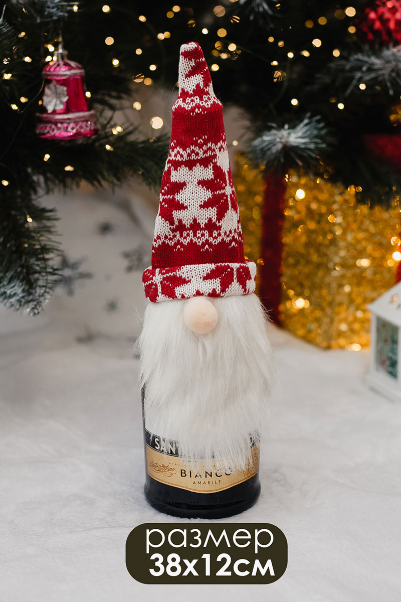 Представляем Вашему вниманию новогодний текстильный чехол на бутылку в виде колпака — это стильная и практичная упаковка для бутылок вина и шампанского, изготовленная из плотного многоразового вязаного текстиля с аккуратной вшитой бородой и рисунком, который придаёт изделию праздничный и уютный вид.