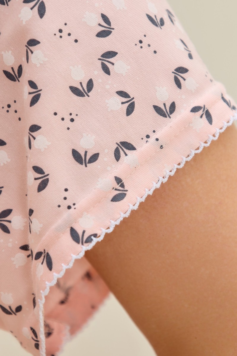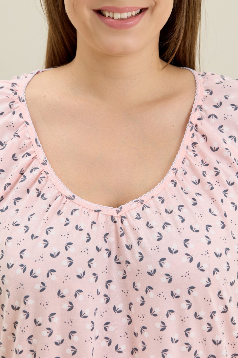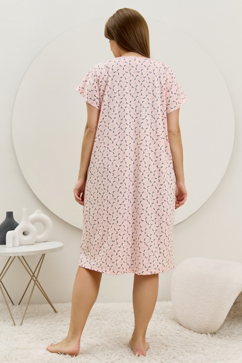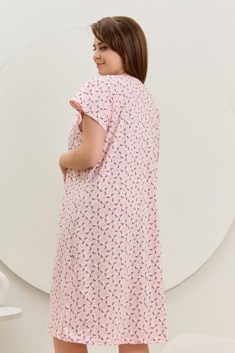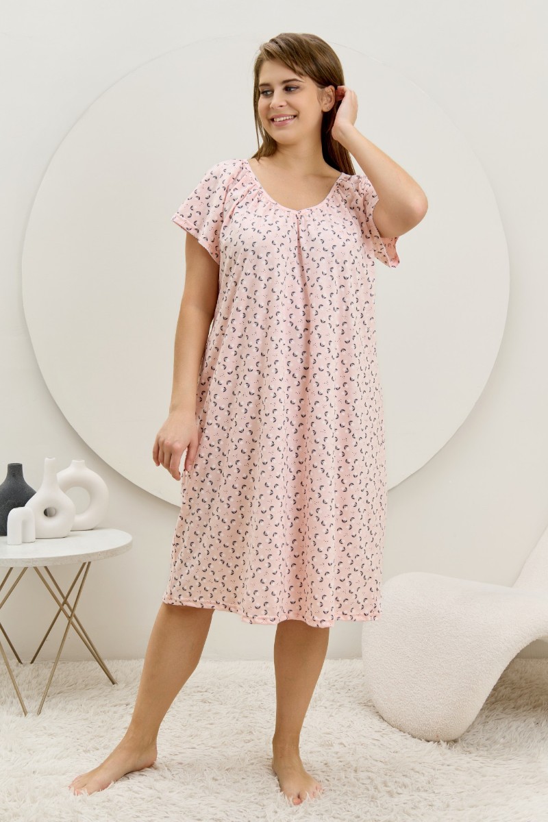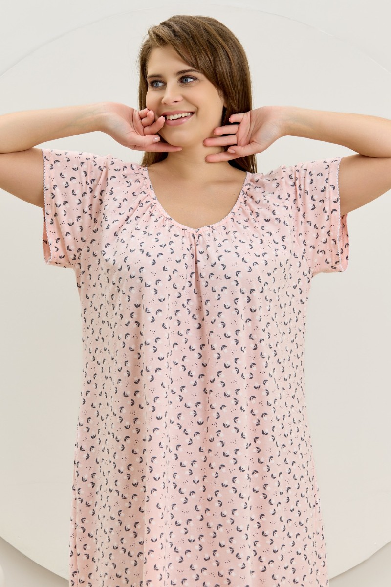 Представляем Вашему вниманию женскую сорочку из трикотажного полотна «кулирка» с набивным рисунком свободного покроя, с короткими втачными рукавами покроя «реглан». Углубленная горловина V- образной формы, собрана по краю на сборку и окантована основным материалом. Низ изделия и нижние срезы рукавов обработаны узким обметочным швом нитками в тон изделия.