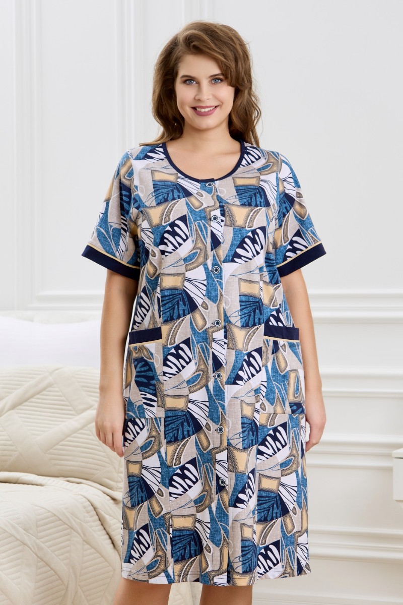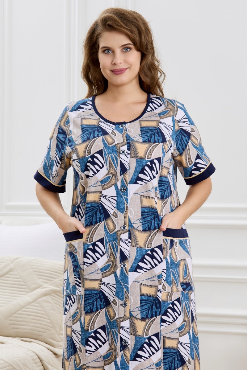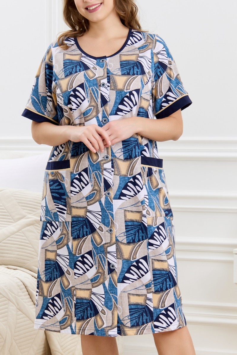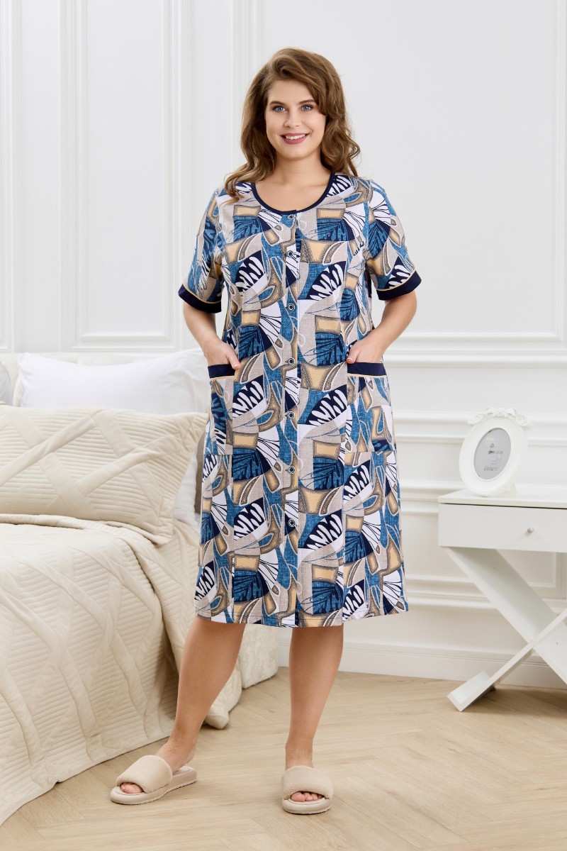 Представляем Вашему вниманию халат женский из трикотажного полотна «кулирка» с набивным рисунком, прямого силуэта, с короткими втачными рукавами, с горловиной овальной формы, окантованной основным материалом, с рельефами, выходящими из пройм, двумя накладными карманами на уровне бедер и центральной бортовой застежкой на обметанные петли и пуговицы. Нижние срезы рукавов обработаны притачными манжетами, верхние срезы карманов – с притачными планками. В швах соединения манжет и планок с деталями – узкий кант контрастного цвета.