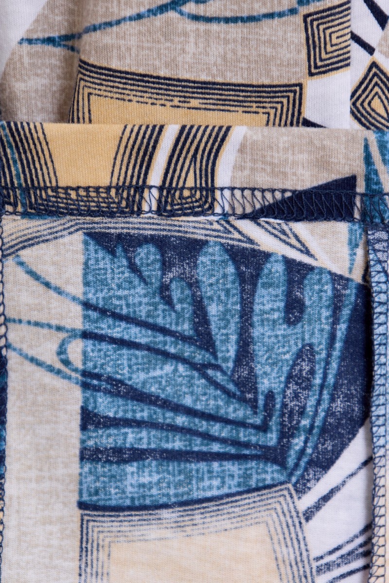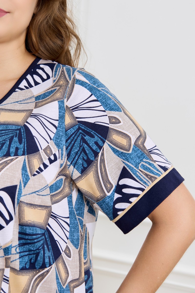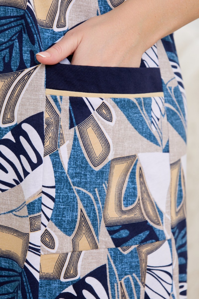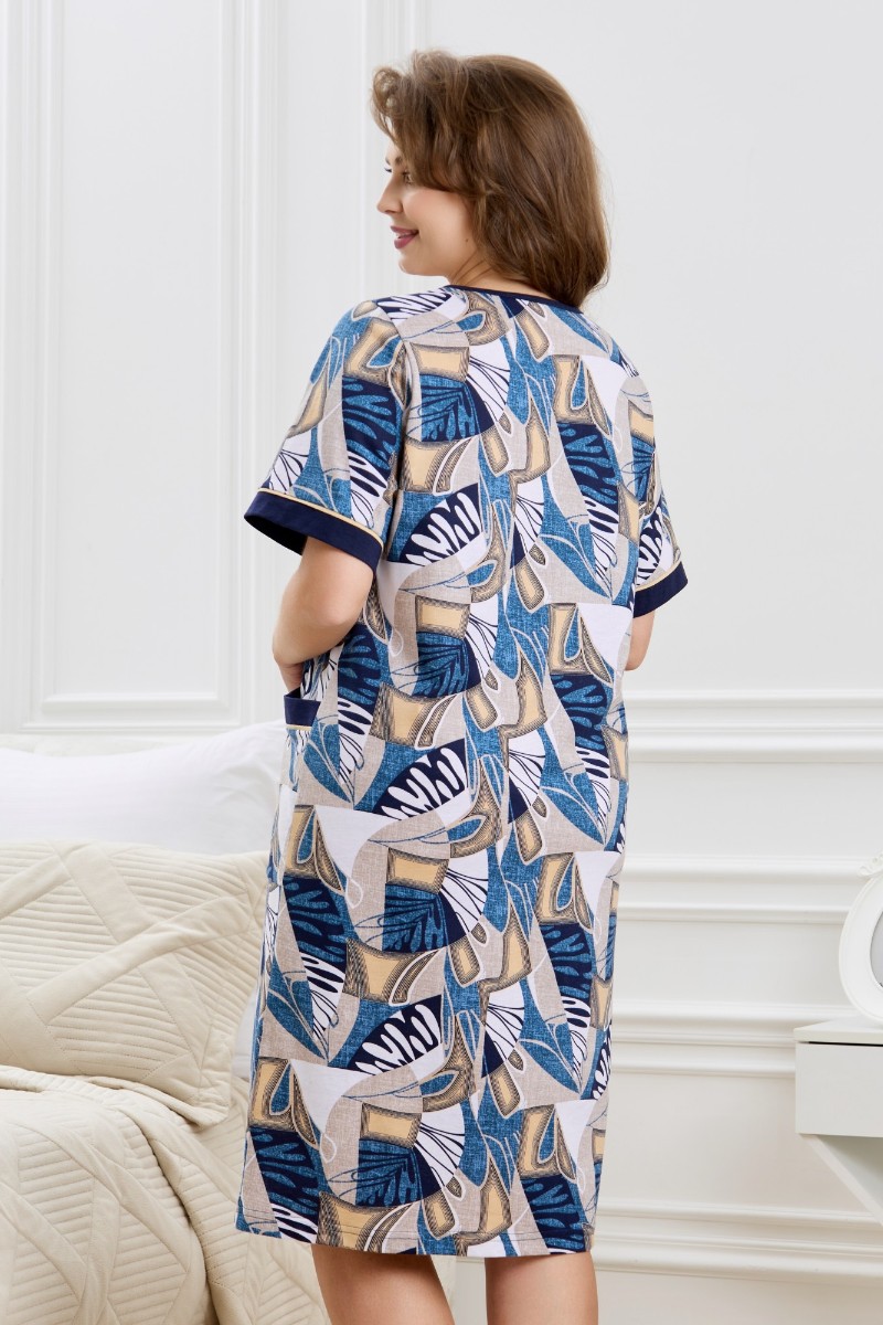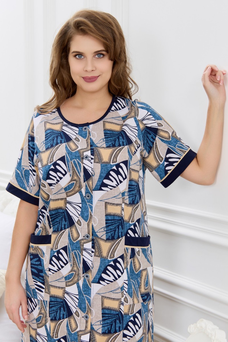 Представляем Вашему вниманию халат женский из трикотажного полотна «кулирка» с набивным рисунком, прямого силуэта, с короткими втачными рукавами, с горловиной овальной формы, окантованной основным материалом, с рельефами, выходящими из пройм, двумя накладными карманами на уровне бедер и центральной бортовой застежкой на обметанные петли и пуговицы. Нижние срезы рукавов обработаны притачными манжетами, верхние срезы карманов – с притачными планками. В швах соединения манжет и планок с деталями – узкий кант контрастного цвета.