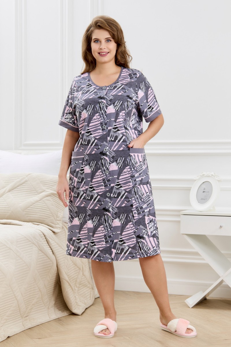Представляем Вашему вниманию халат женский из трикотажного полотна «кулирка» с набивным рисунком, прямого силуэта, с короткими втачными рукавами, с горловиной овальной формы, окантованной основным материалом, с рельефами, выходящими из пройм, двумя накладными карманами на уровне бедер и центральной бортовой застежкой на обметанные петли и пуговицы. Нижние срезы рукавов обработаны притачными манжетами, верхние срезы карманов – с притачными планками. В швах соединения манжет и планок с деталями – узкий кант контрастного цвета.