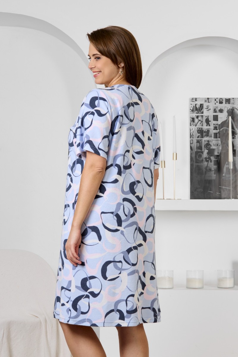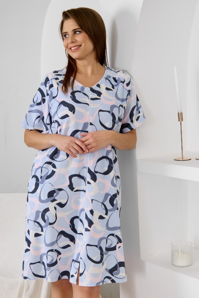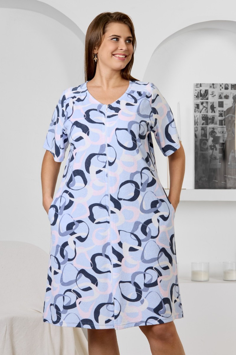 Представляем Вашему вниманию халат женский из трикотажного полотна «махра» с набивным рисунком, слегка расширенный книзу, с короткими втачными рукавами, карманами в боковых швах, горловиной V-образной формы, центральной бортовой застежкой на тесьму «молния». Плечевые швы изделия переходят на деталь переда, имитируя притачные кокетки со сборкой.