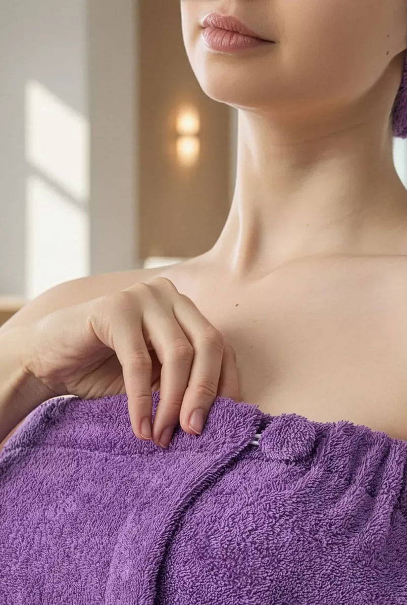 В наборе: полотенце-накидка на липучке, чалма на пуговице, рукавица