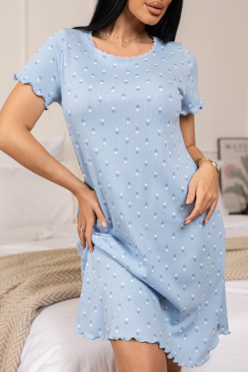 Представляем Вашему вниманию ночную сорочку из хлопкового кашкорсе с набивным рисунком, О-образной горловиной украшенной тонким кружевом в цвет основы ткани, коротким втачным рукавом, длиной до колена. Низ рукава и подол обработаны роликовым швом, нитки подобраны в цвет основы ткани.