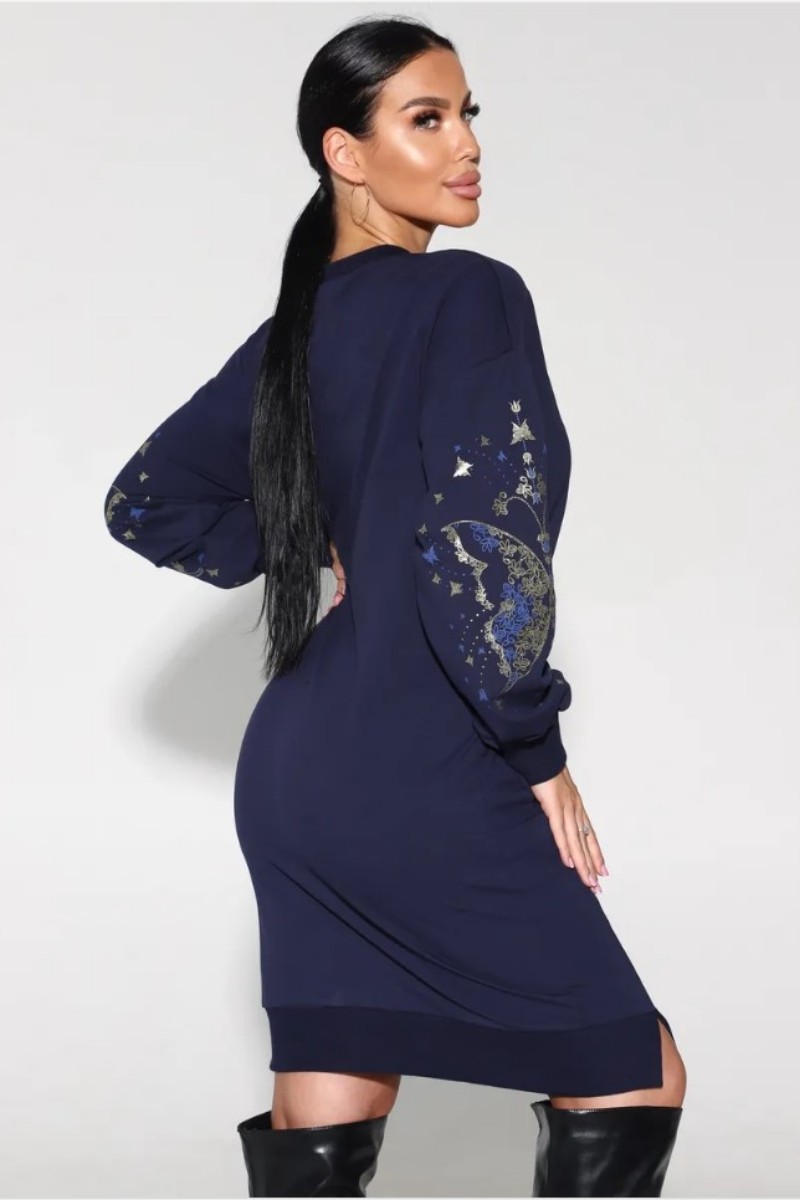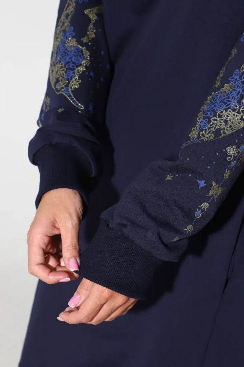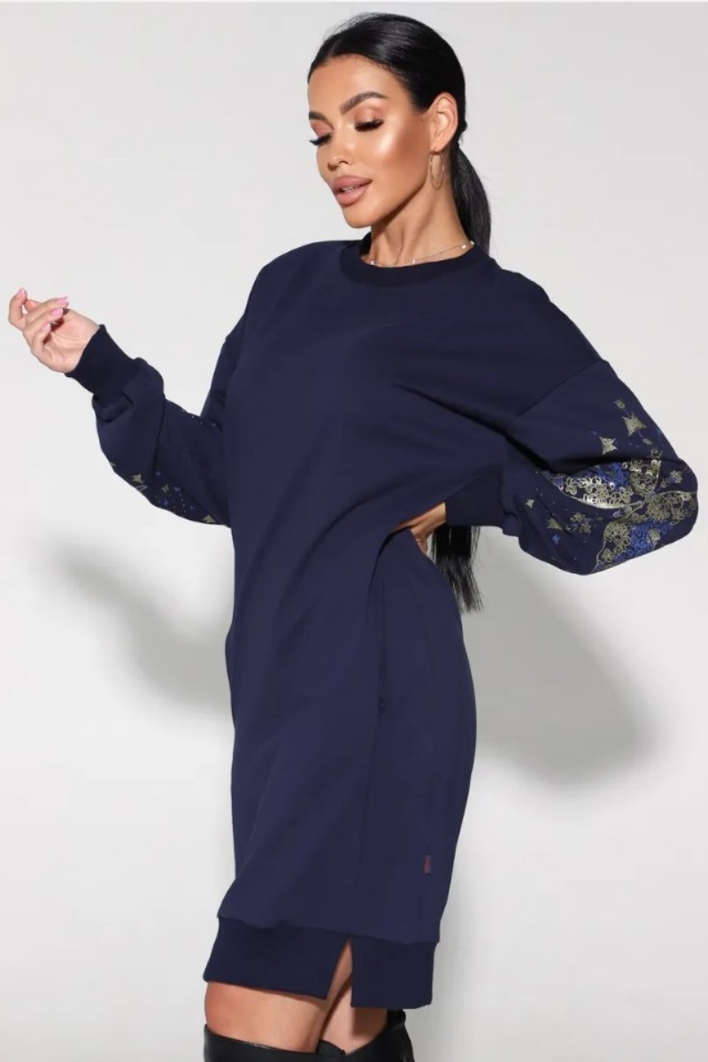 Представляем Вашему вниманию женское платье-толстовку из качественного турецкого футера с принтом-блестками. Платье имеет О-образную горловину и широкой обтачкой из кашкорсе, спущенное плечо с манжетой по рукаву, карманы в боковых швах и небольшие разрезы по низу изделия спереди.