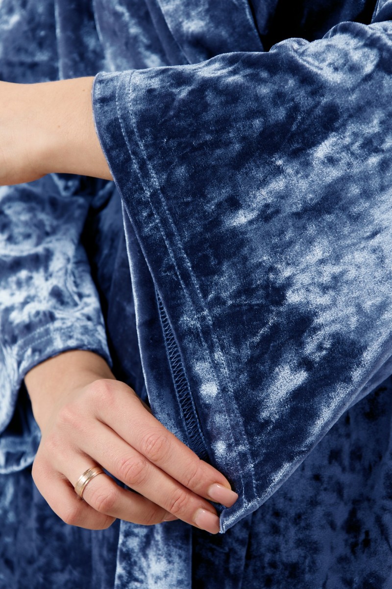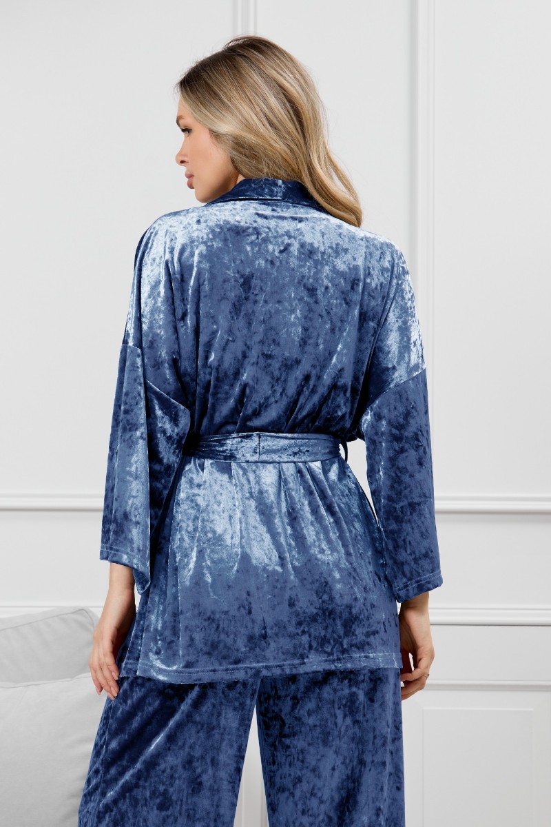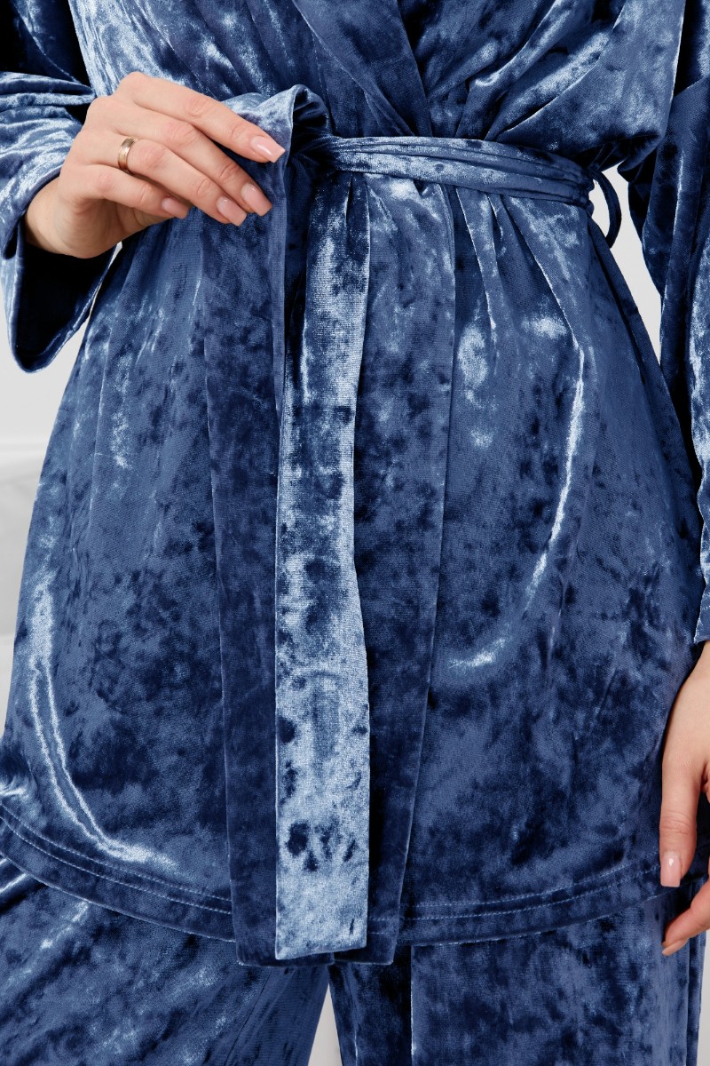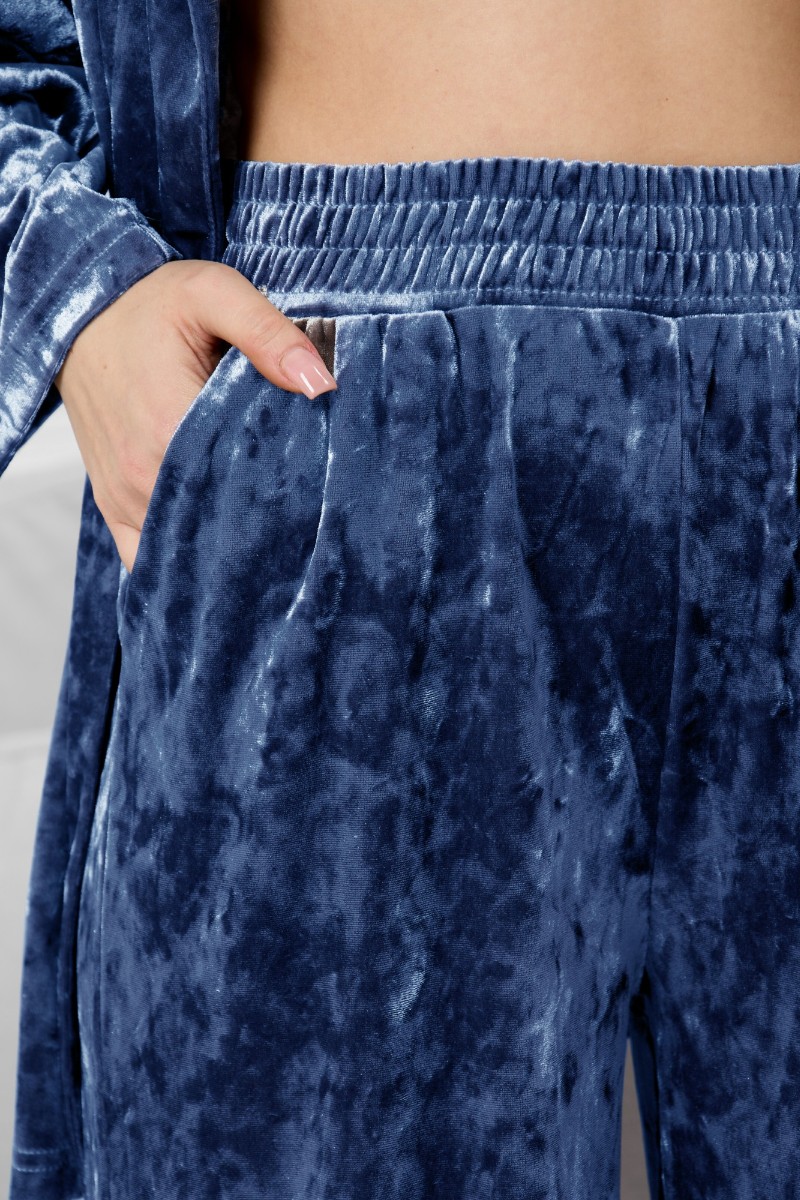 Представляем Вашему вниманию женский костюм из гладкокрашенного полотна «велюр стрейч» с мраморным эффектом, состоящий из кимоно и брюк. Кимоно прямого кроя, свободное, на запахе, с втачными рукавами ¾ длины и съемным поясом, фиксирующимся на талии двумя шлевками в боковых швах.Брюки свободные, на притачном поясе с эластичной тесьмой внутри и карманами в боковых швах.