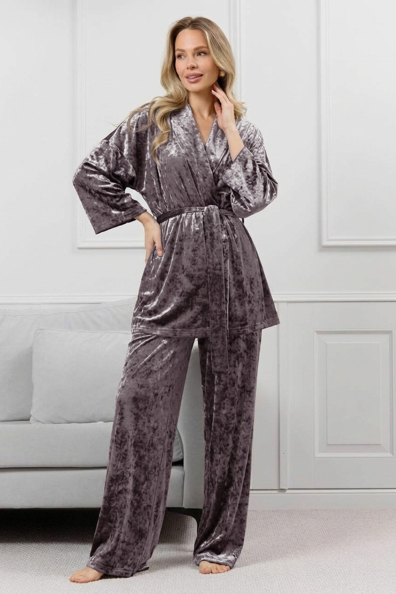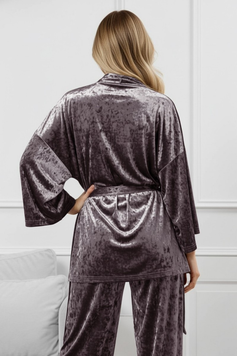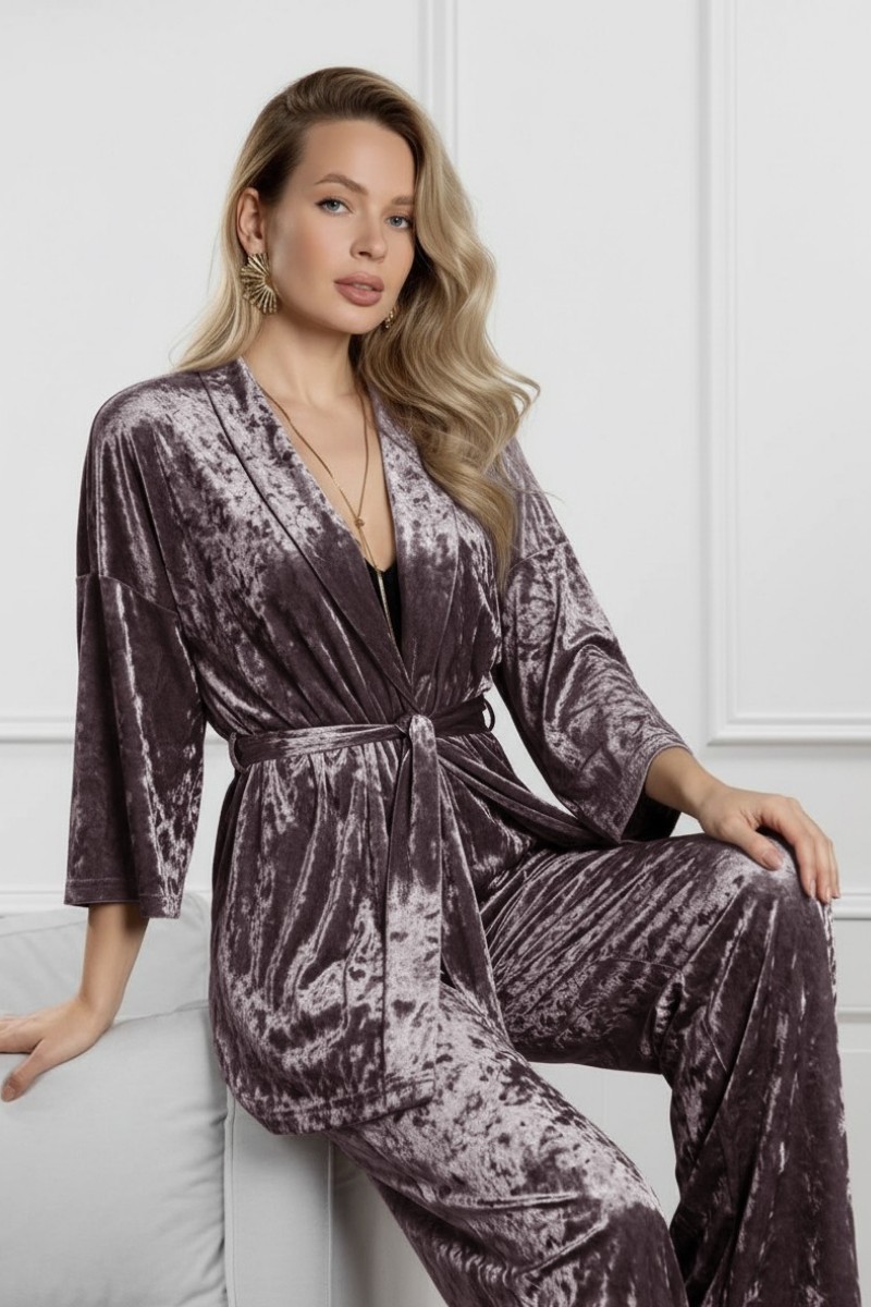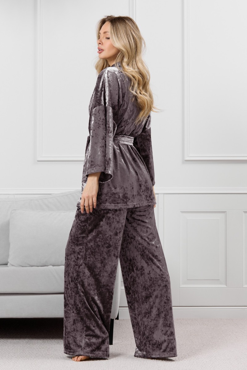 Представляем Вашему вниманию женский костюм из гладкокрашенного полотна «велюр стрейч» с мраморным эффектом, состоящий из кимоно и брюк. Кимоно прямого кроя, свободное, на запахе, с втачными рукавами ¾ длины и съемным поясом, фиксирующимся на талии двумя шлевками в боковых швах.Брюки свободные, на притачном поясе с эластичной тесьмой внутри и карманами в боковых швах.