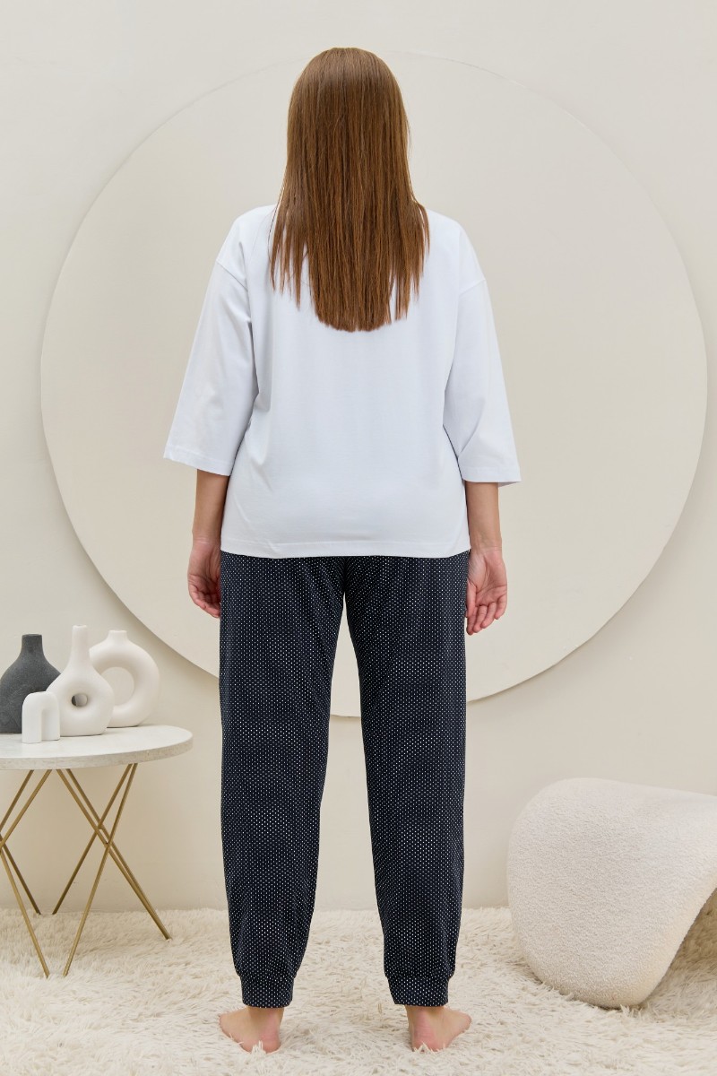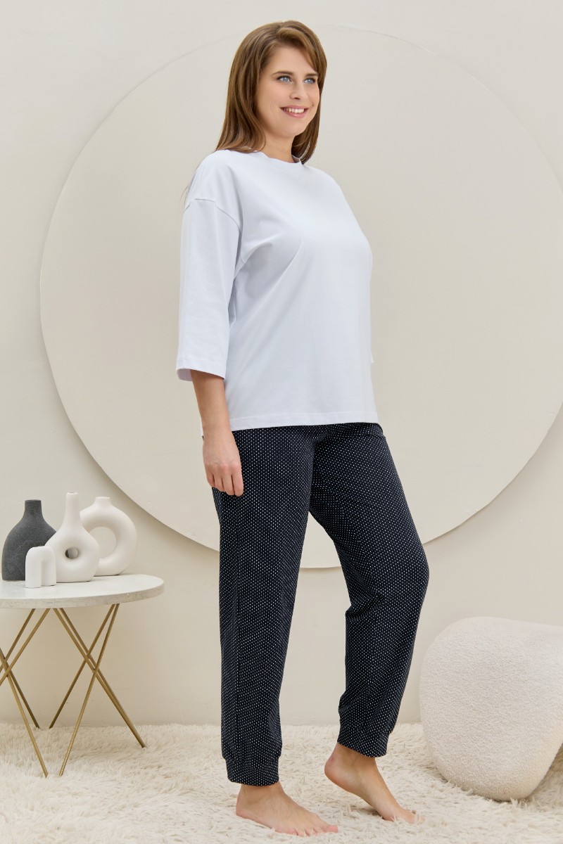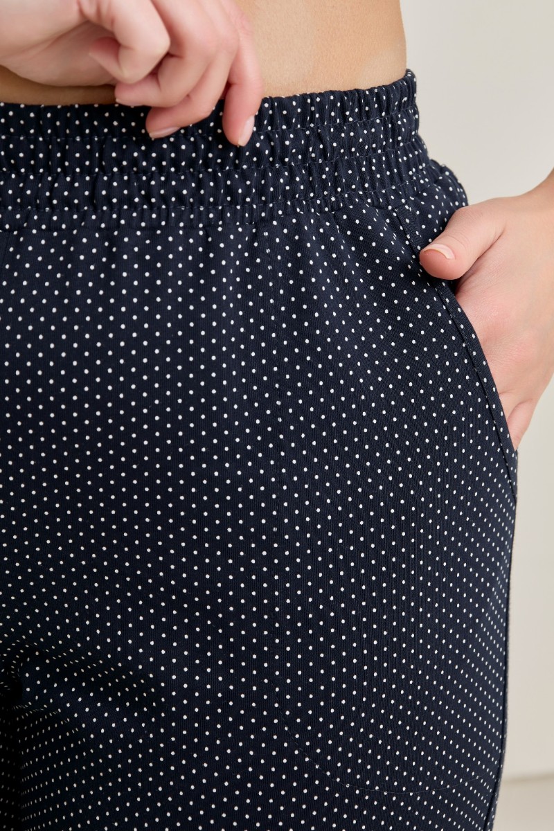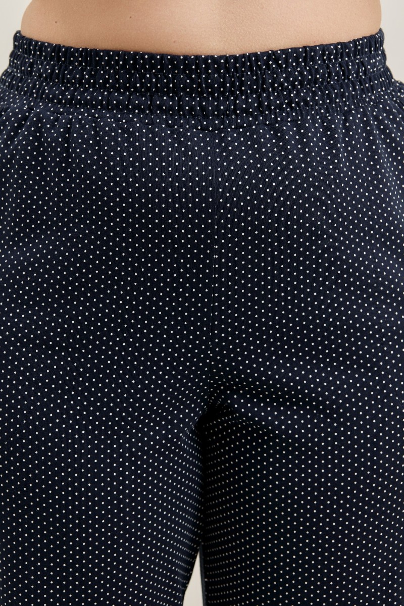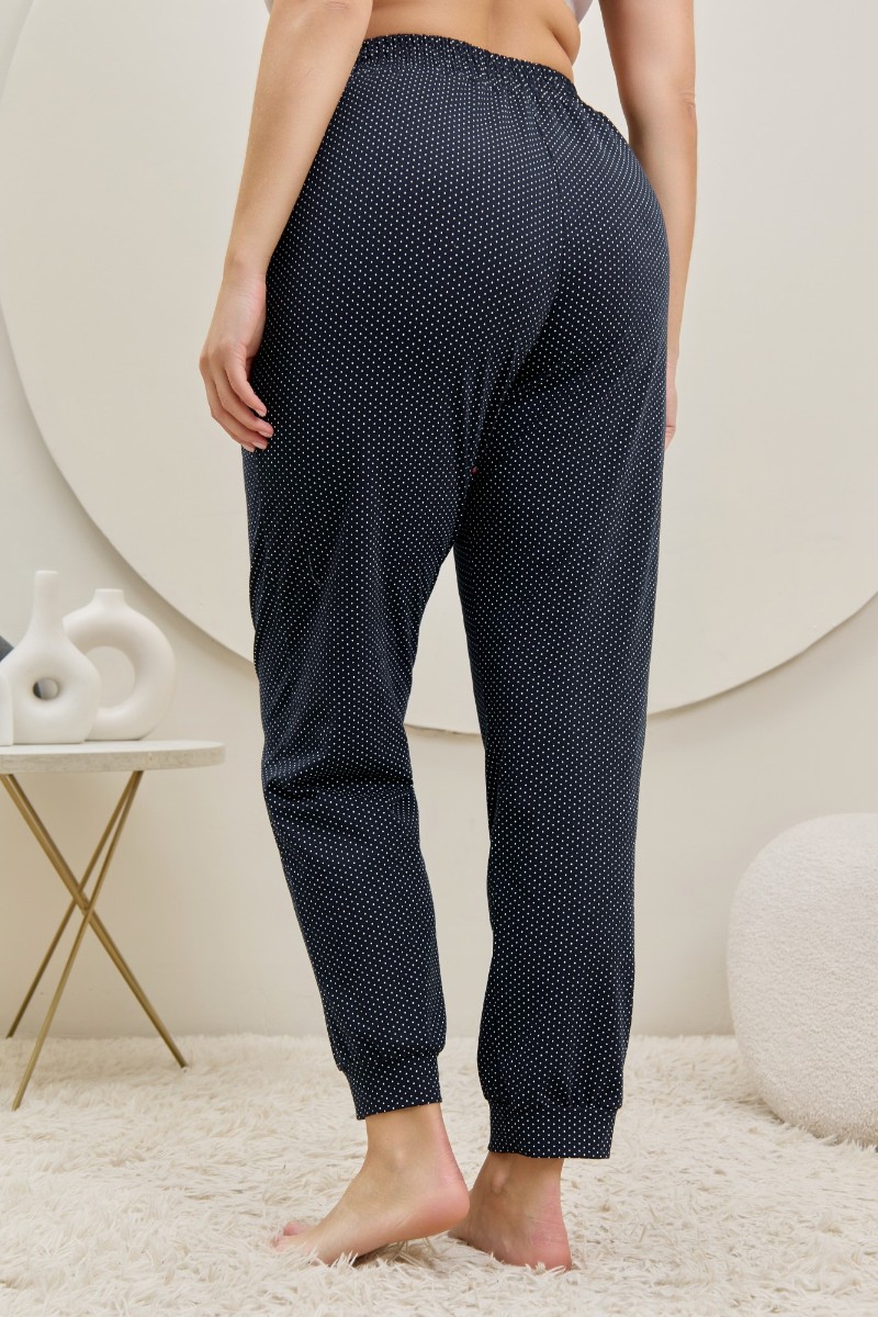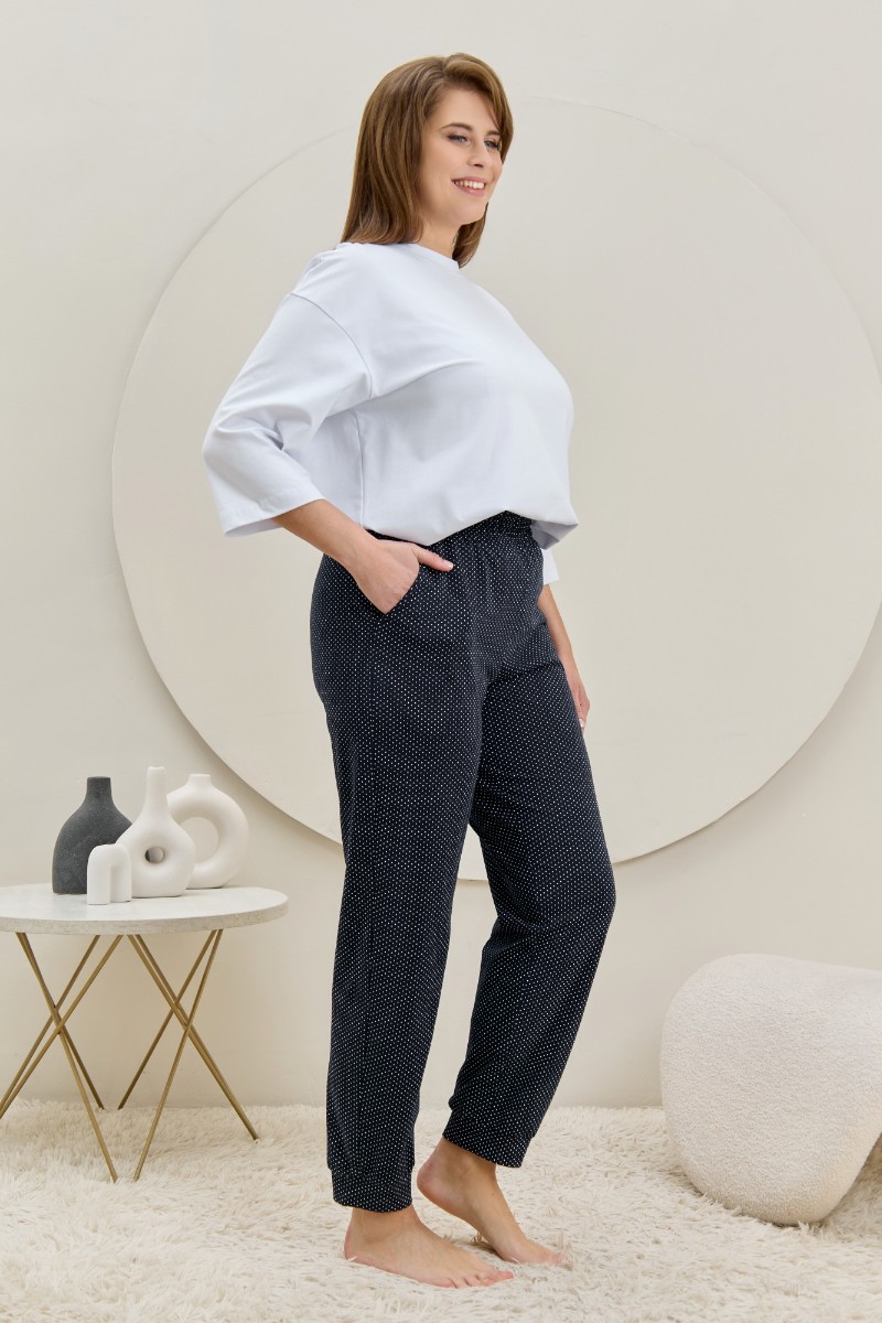 Представляем Вашему вниманию брюки женские из трикотажного полотна «кулирка» с набивным рисунком, полуприлегающего силуэта, длинные, с карманами в боковых швах, на притачном поясе с эластичной тесьмой внутри. Нижние срезы обработаны манжетами.