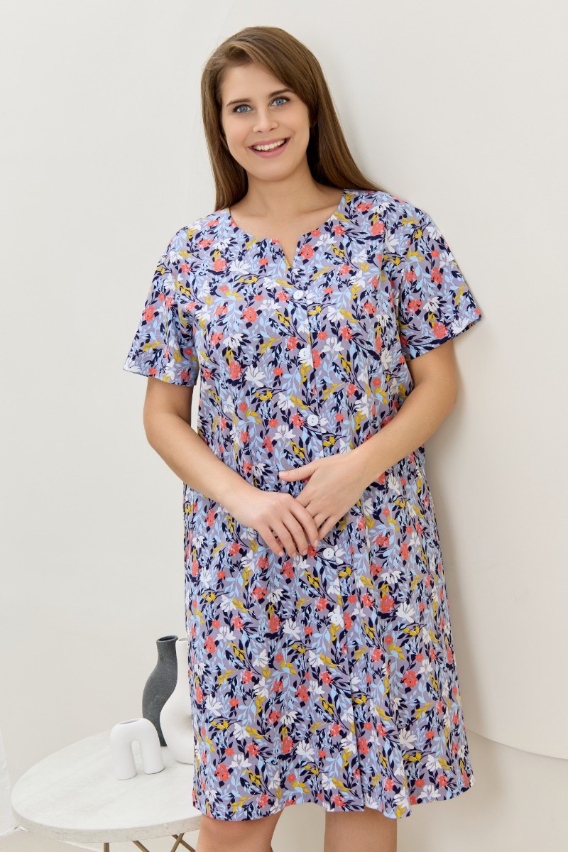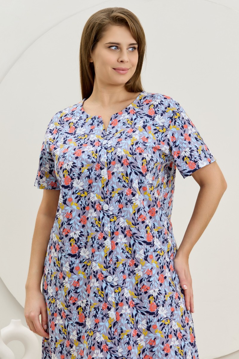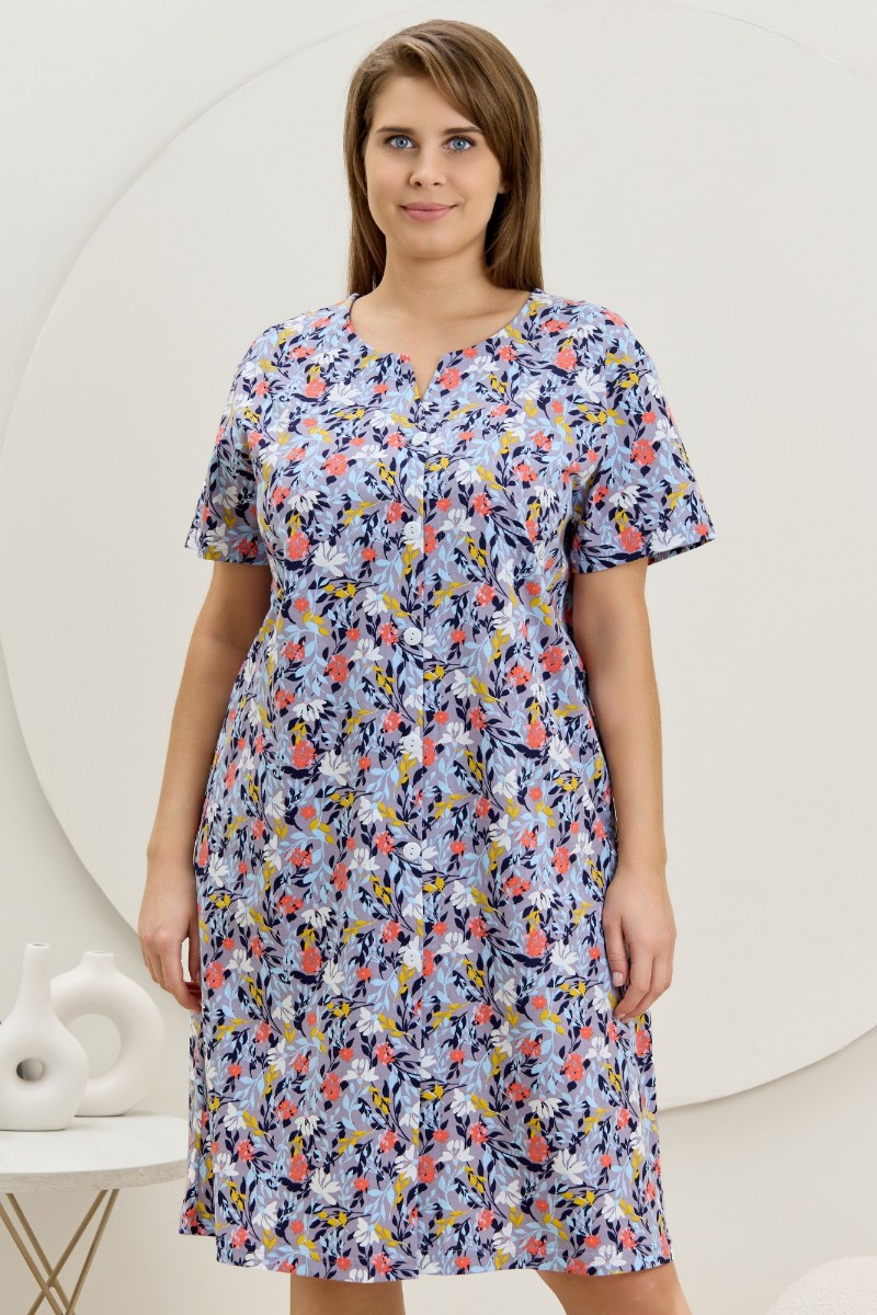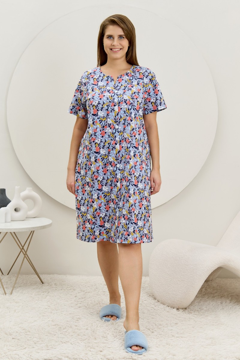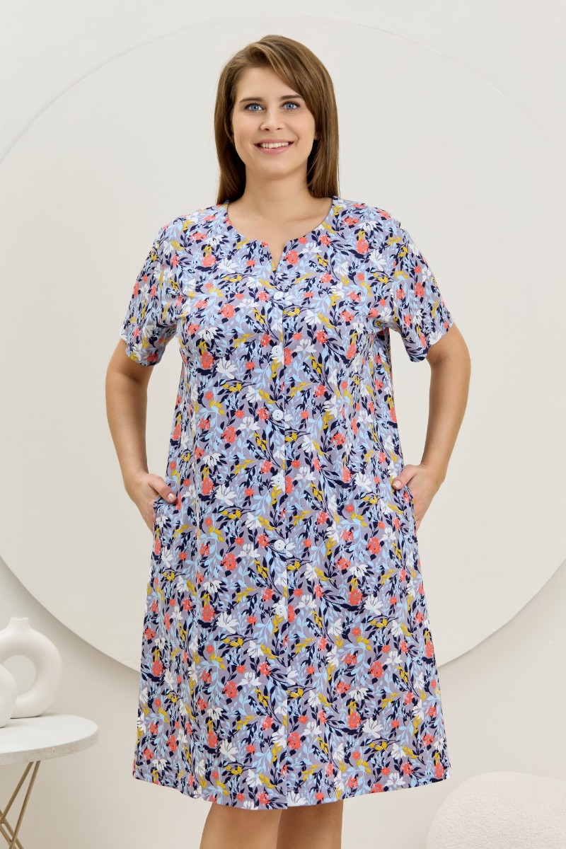 Представляем Вашему вниманию халат женский из трикотажного полотна «кулирка» с набивным рисунком, прямого силуэта, с короткими втачными рукавами, карманами в боковых швах и центральной бортовой застежкой на обметанные петли и пуговицы. Горловина – овальной формы, переходящая в небольшой v-образный вырез выше верхней пуговицы. Входы в карманы и горловина спинки окантованы.