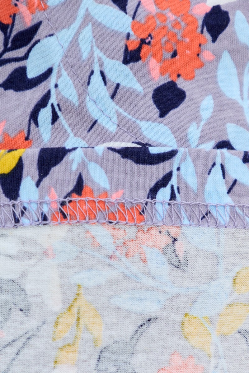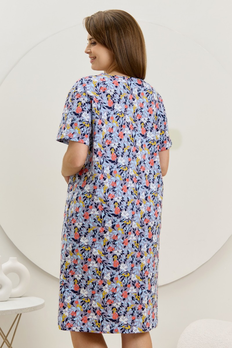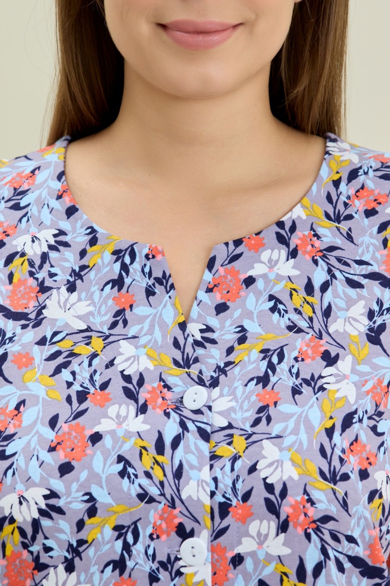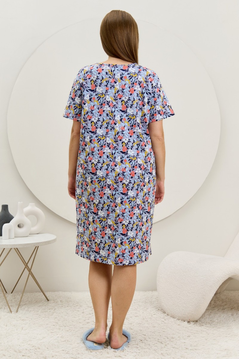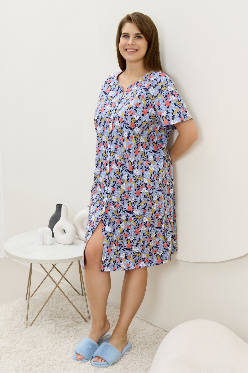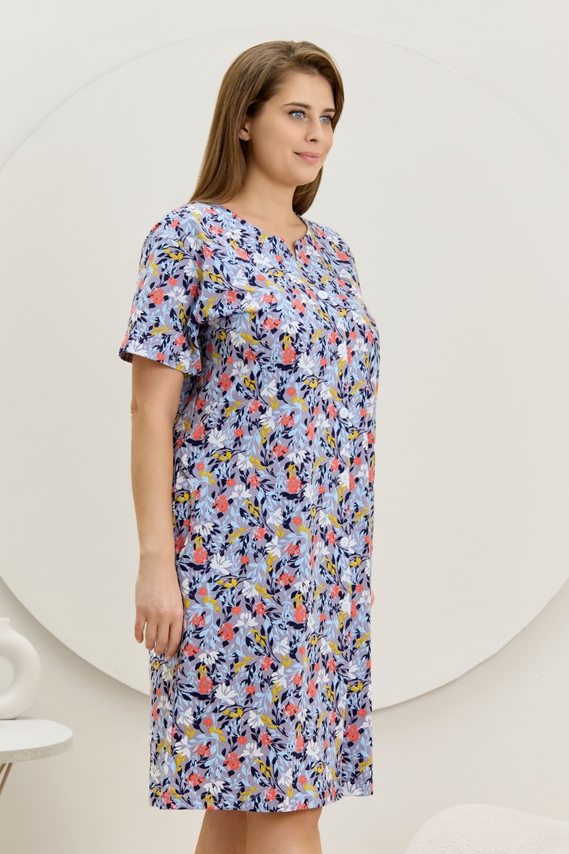 Представляем Вашему вниманию халат женский из трикотажного полотна «кулирка» с набивным рисунком, прямого силуэта, с короткими втачными рукавами, карманами в боковых швах и центральной бортовой застежкой на обметанные петли и пуговицы. Горловина – овальной формы, переходящая в небольшой v-образный вырез выше верхней пуговицы. Входы в карманы и горловина спинки окантованы.