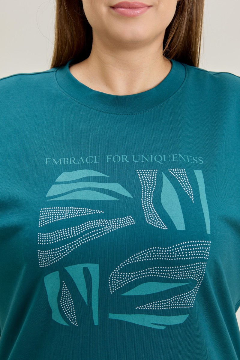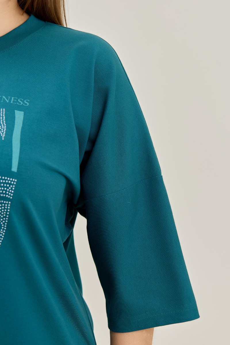Представляем Вашему вниманию женскую тунику из гладкокрашенного полотна «кулирка» с лайкрой, свободного покроя, с втачными рукавами длиной до локтя, горловиной овальной формы, обработанной втачной планкой и разрезами в боковых швах. На полочке принт, выполненный в технике «шелкографии».