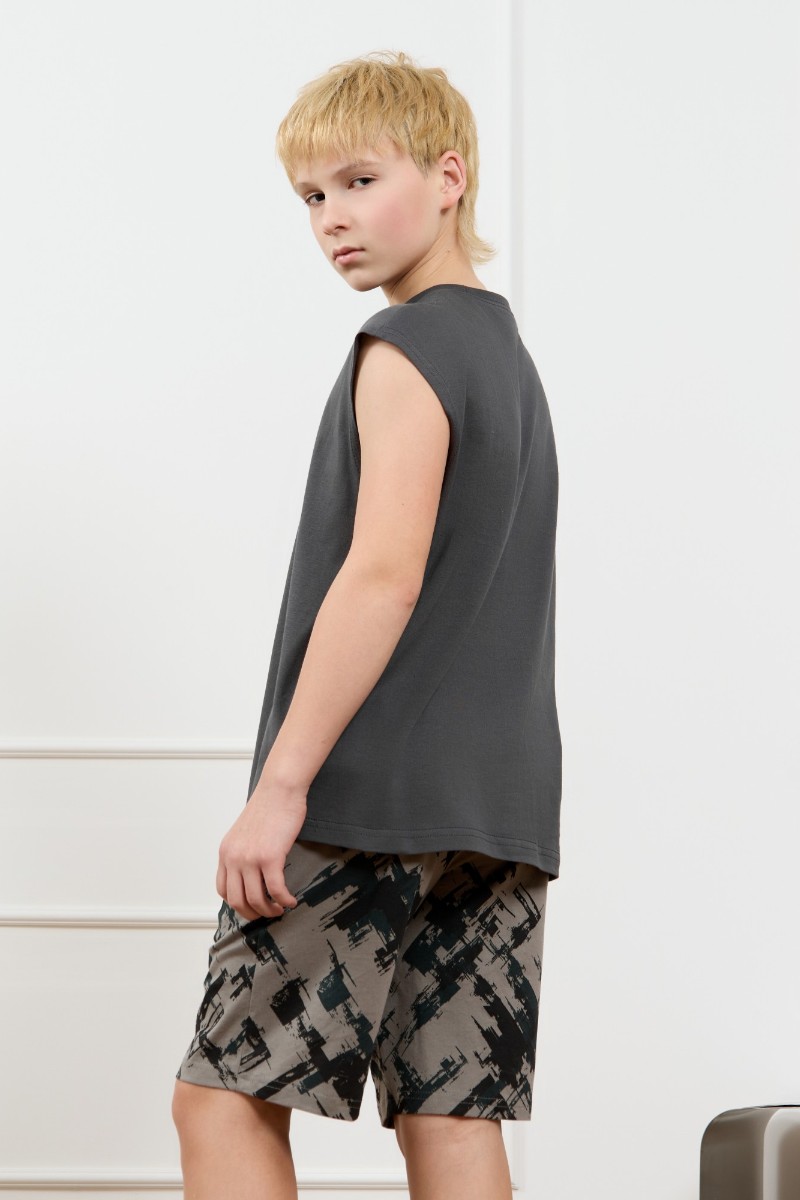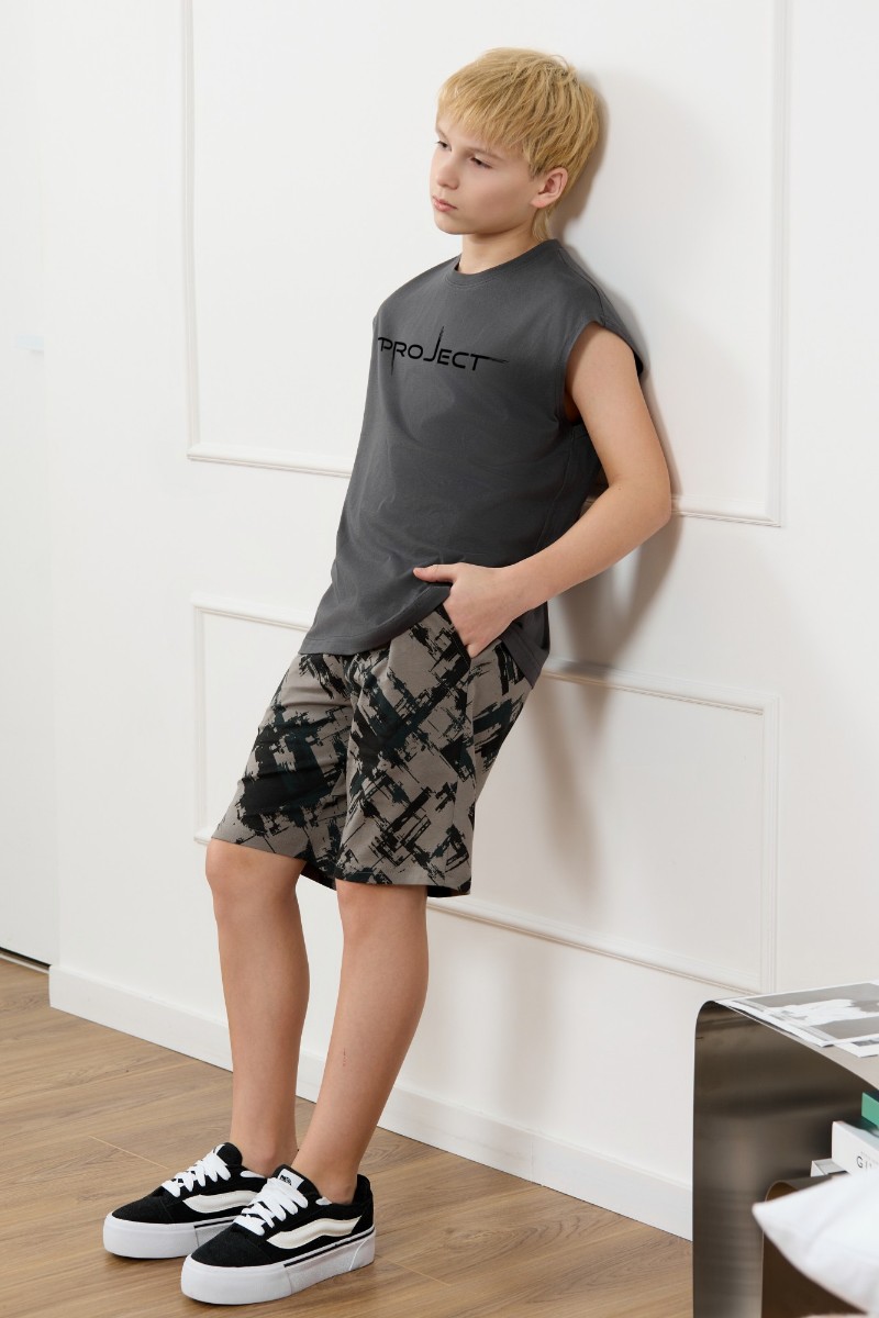 Представляем Вашему вниманию костюм для мальчика, состоящий из майки и шорт. Майка однотонная с принтом на груди; модель свободная, со спущенной линией плеч и углубленной проймой. Шорты из полотна с набивным рисунком эксклюзивного дизайна, с боковыми карманами с обтачными входами, на притачном поясе с отстроченной эластичной тесьмой.