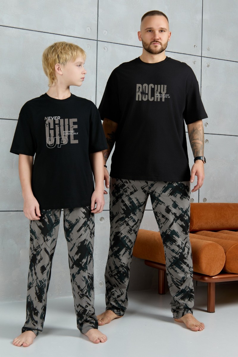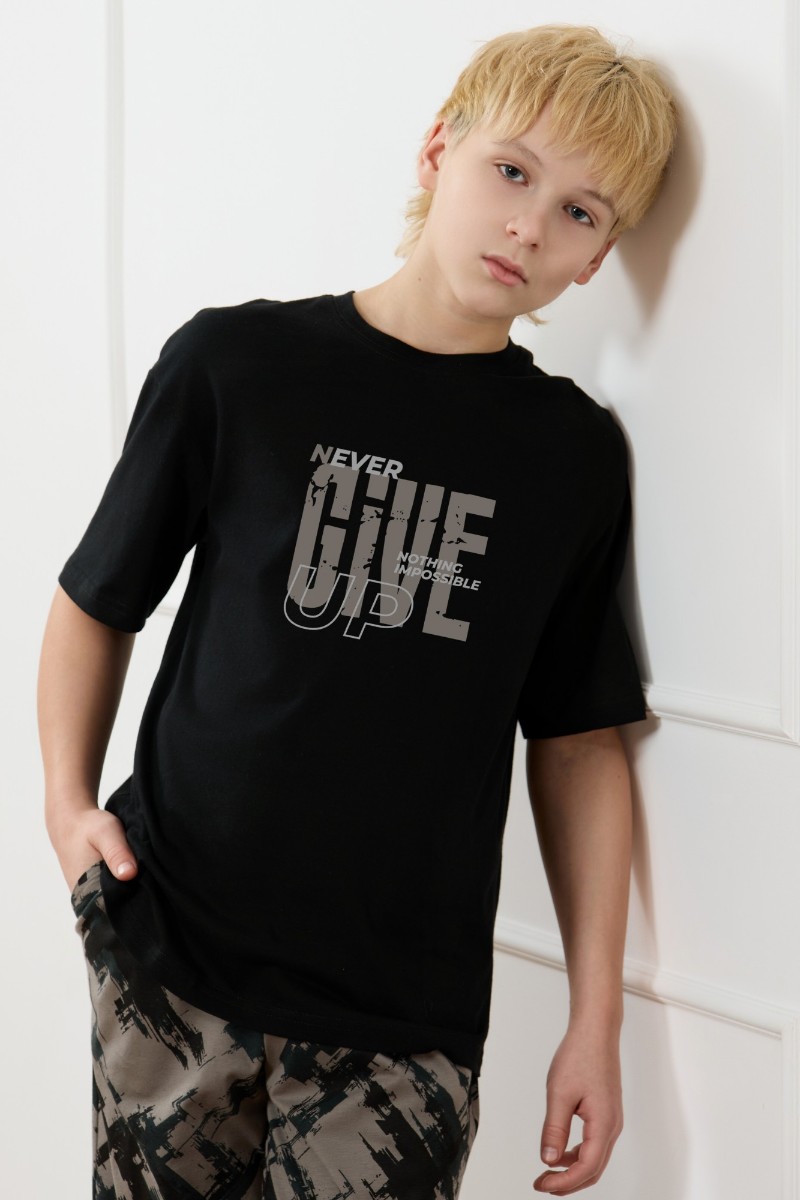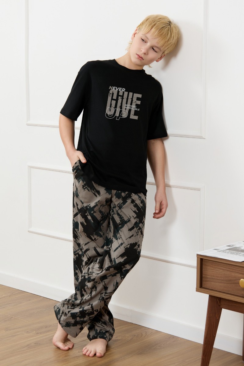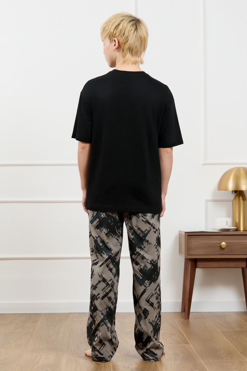 Представляем Вашему вниманию костюм для мальчика, состоящий из футболки и брюк. Футболка однотонная с принтом на груди; модель свободная, со спущенной линией плеч, овальным вырезом горловины. Брюки из полотна с набивным рисунком эксклюзивного дизайна, прямые, с боковыми карманами с обтачными входами, на притачном поясе с отстроченной эластичной тесьмой.