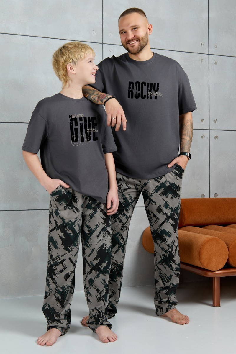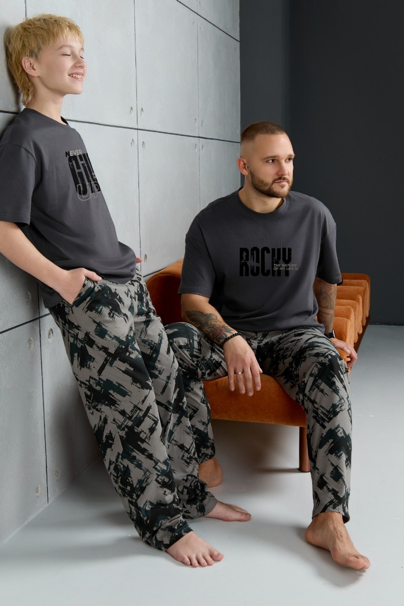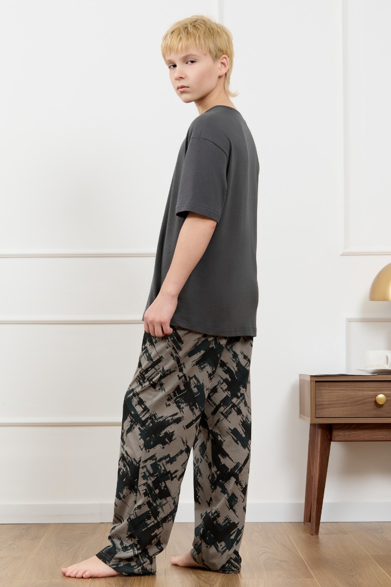 Представляем Вашему вниманию костюм для мальчика, состоящий из футболки и брюк. Футболка однотонная с принтом на груди; модель свободная, со спущенной линией плеч, овальным вырезом горловины. Брюки из полотна с набивным рисунком эксклюзивного дизайна, прямые, с боковыми карманами с обтачными входами, на притачном поясе с отстроченной эластичной тесьмой.