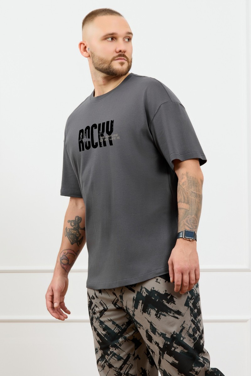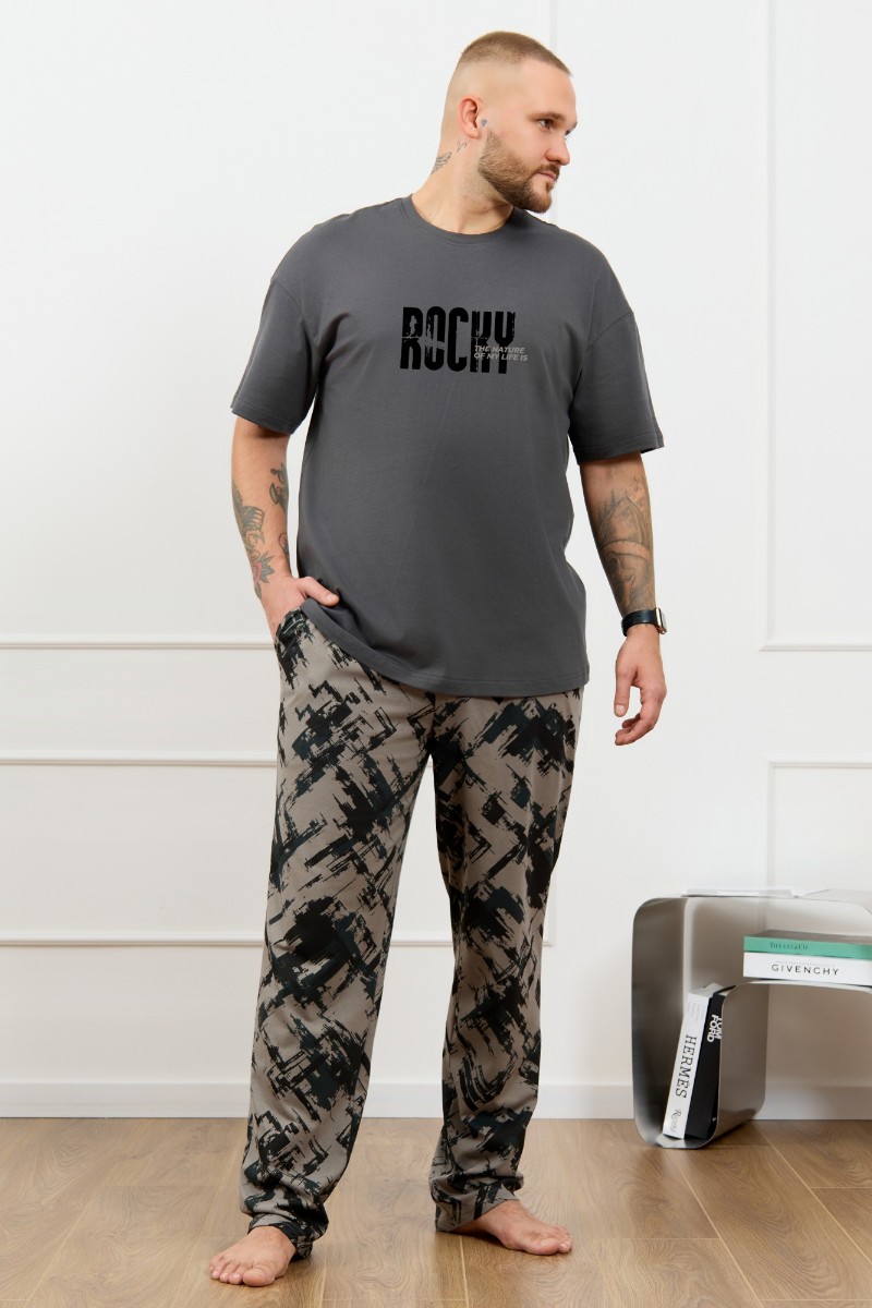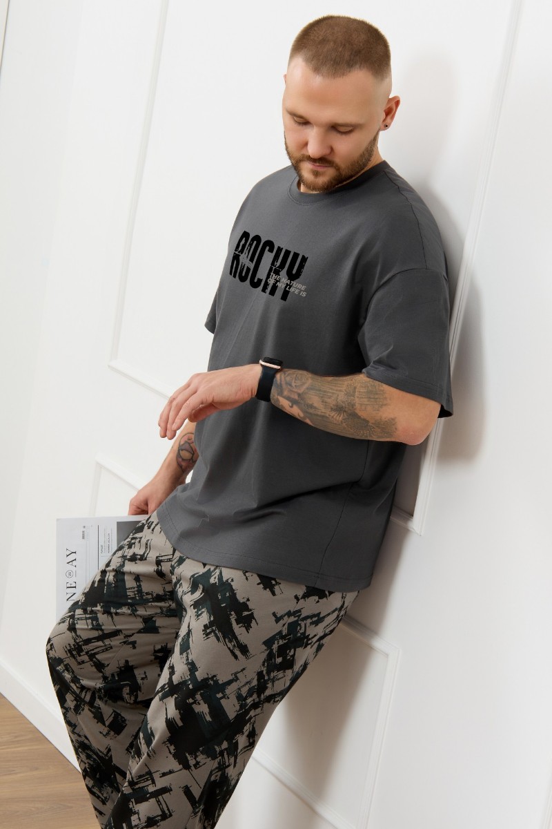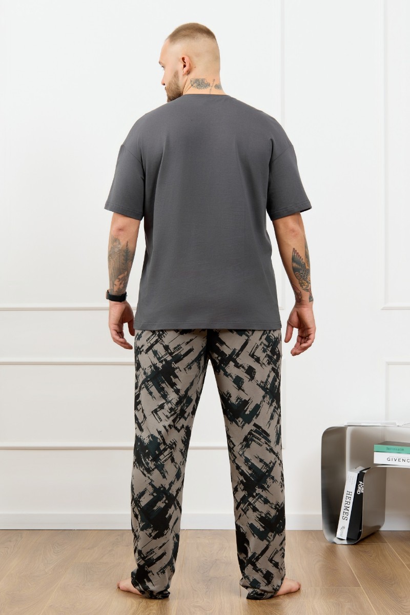 Представляем Вашему вниманию костюм мужской, состоящий из футболки и брюк. Футболка однотонная с принтом на груди; модель свободная, со спущенной линией плеч, овальным вырезом горловины. Брюки из полотна с набивным рисунком эксклюзивного дизайна, прямые, с боковыми карманами с обтачными входами, на притачном поясе с отстроченной эластичной тесьмой.