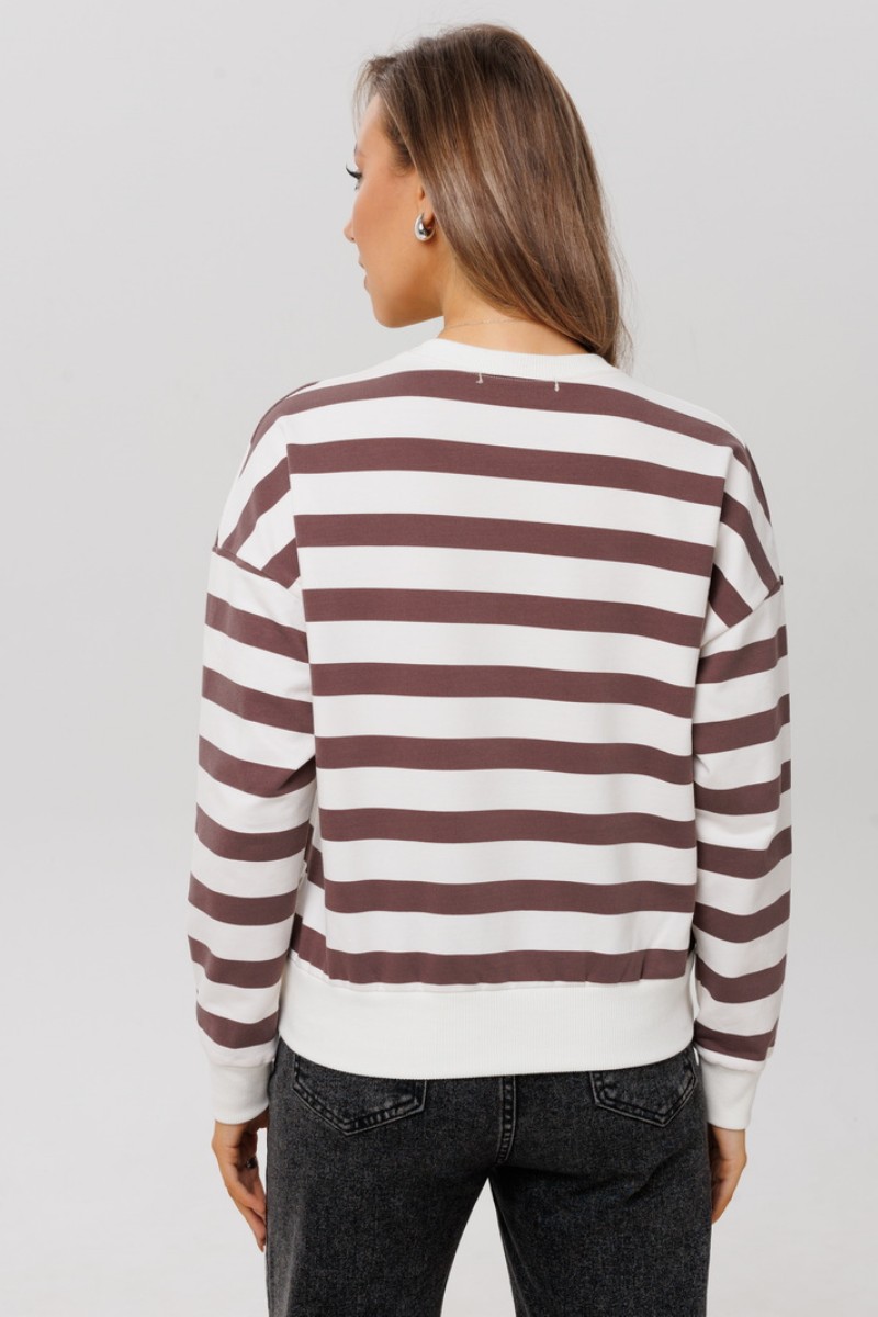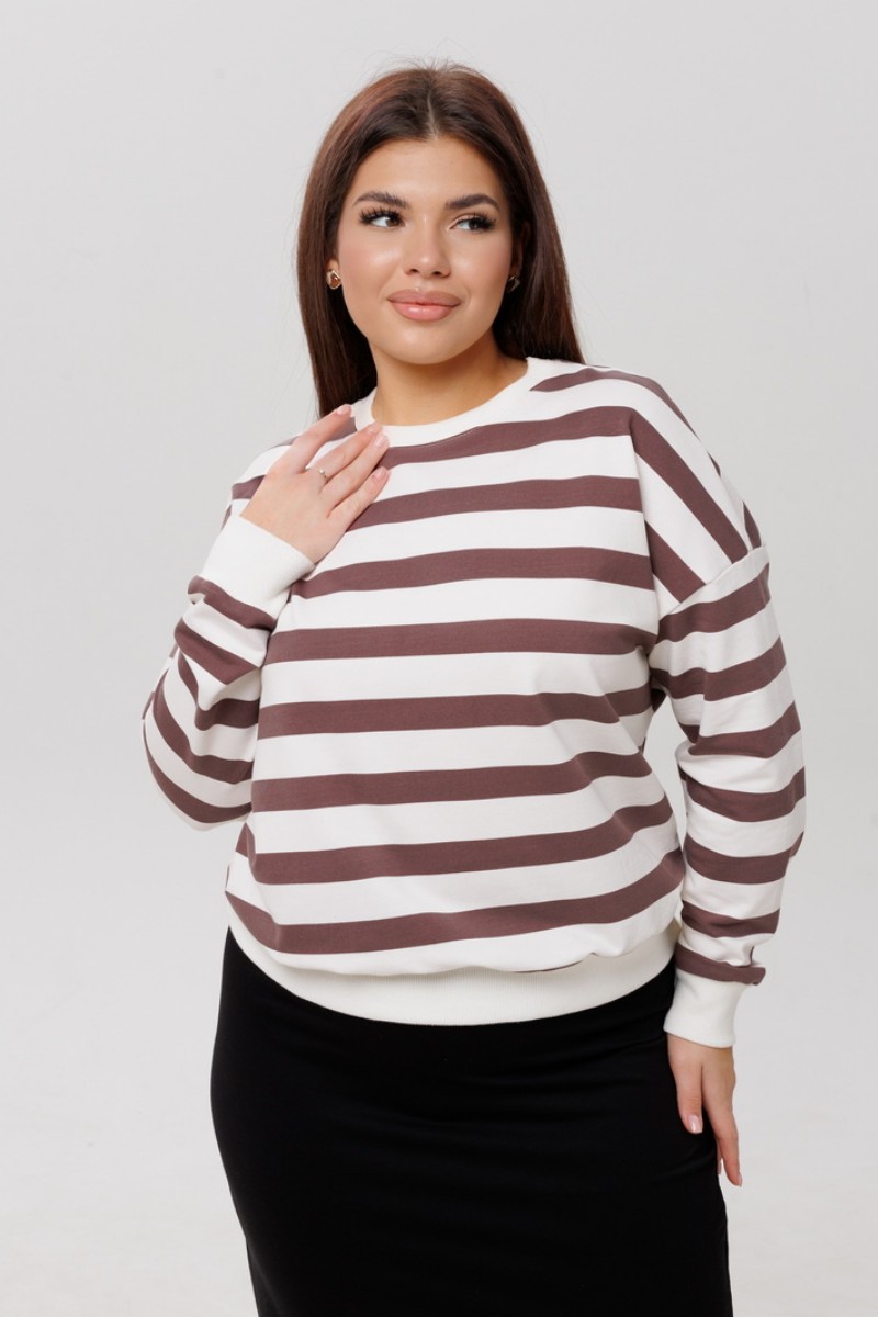 Представляем Вашему вниманию женскую толстовку, сшитую из приятного телу, высококачественного футера 2-х нитки петли пенье. Модель с круглой горловиной, рукавами с эластичными манжетами и классическим принтом в крупную контрастную полоску.