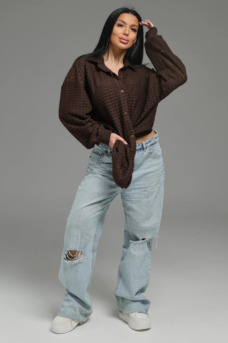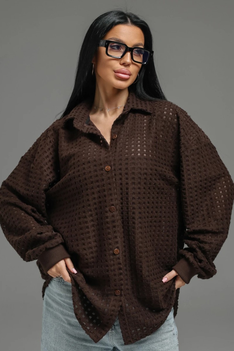 Представляем Вашему вниманию женскую рубашку-оверсайз прямого силуэта, сшитую из футера. Крой и детали: Силуэт: Прямой, свободный. Застёжка: Классическая бортовая на 6 пуговицах. Рукав: Длинный, втачной, с манжетой на пуговице. Спинка: С отрезной кокеткой и стильной бантовой складкой в центре для свободы движения. Материал: Футер трёхнитка «петля» с жаккардовым рисунком. Это особая разновидность хлопкового трикотажа. Характер: Уютная, фактурная рубашка, которая объединяет расслабленный крой, интересный дизайн (складка, кокетка) и премиальные ощущения от ткани. Идеальна для создания модных casual-образов.