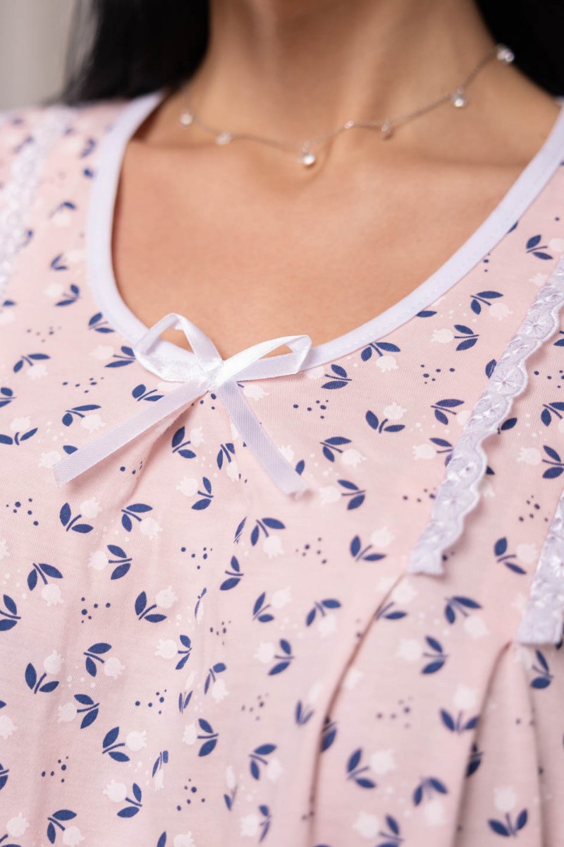 Представляем Вашему вниманию женскую сорочку для сна, длиной чуть ниже уровня колена. С округлым вырезом и коротким втачным рукавом. На передней части декоративные элементы в виде кружева и бантика.